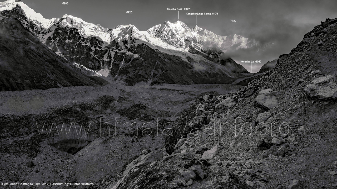 Norden zum Kangchenjunga-Gletscher. Foto: kogo59, Nov. 2009; Beschriftung: Günter Seyfferth Vom selben Standort wurde die Fortsetzung nach rechts fotografiert: