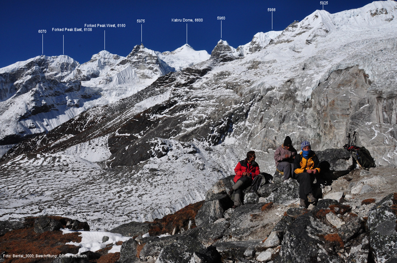 mit Forked Peak (6160/6108 m), Kabru Dome (6600 m), Foto: Carsten Nebel, www.myhimalayas.com; Beschriftung: Günter Seyfferth (61) Blick von einem Standort östlich und oberhalb des