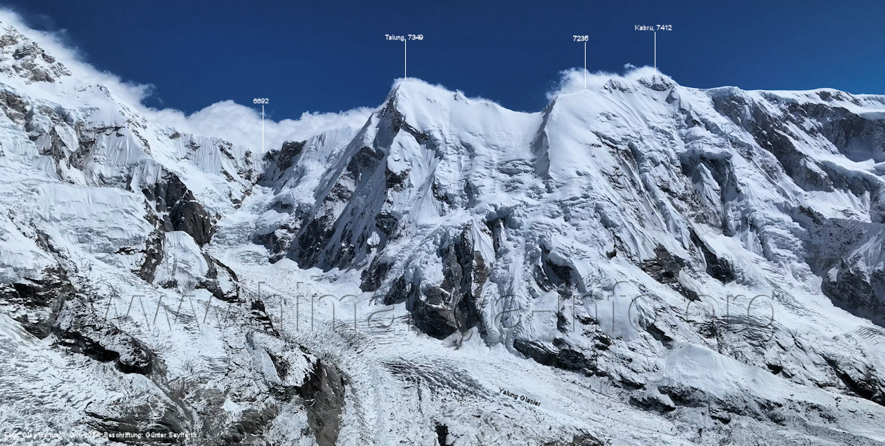 gegen die Südflanke über dem Tal des nahezu unbekannten Talung-Gletschers. Gleich 4 hohe Achttausender, die drei