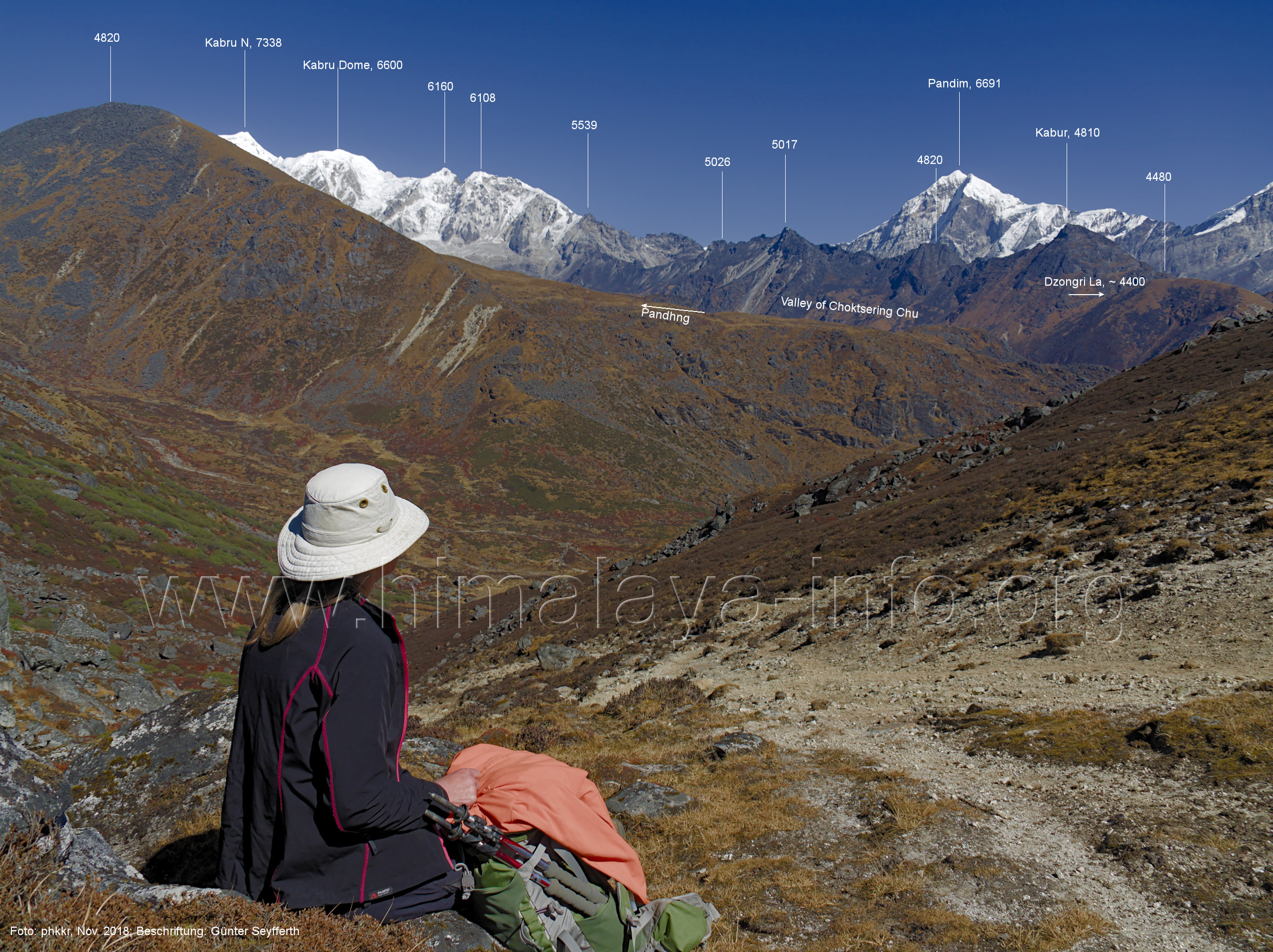 Hochalm Dzongri. Foto: phkkr, Nov. 2018; Beschriftung: Günter Seyfferth (23) Blick vom Kokling-Pass (4254 m) nach Nordosten mit Kabru N (7338 m) Kabru Dome (6600 m) und Pandim (6691 m)