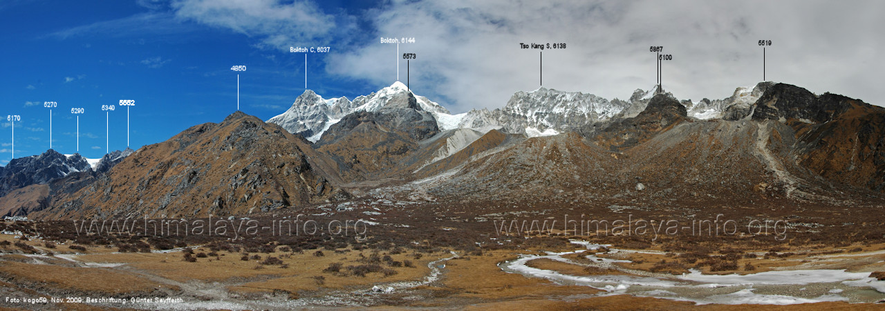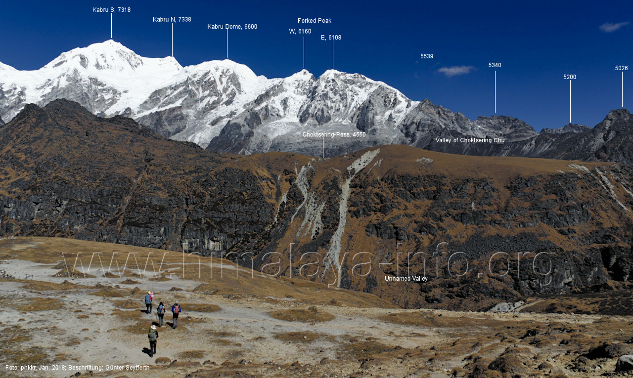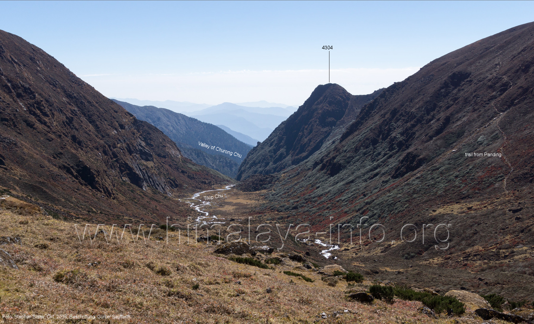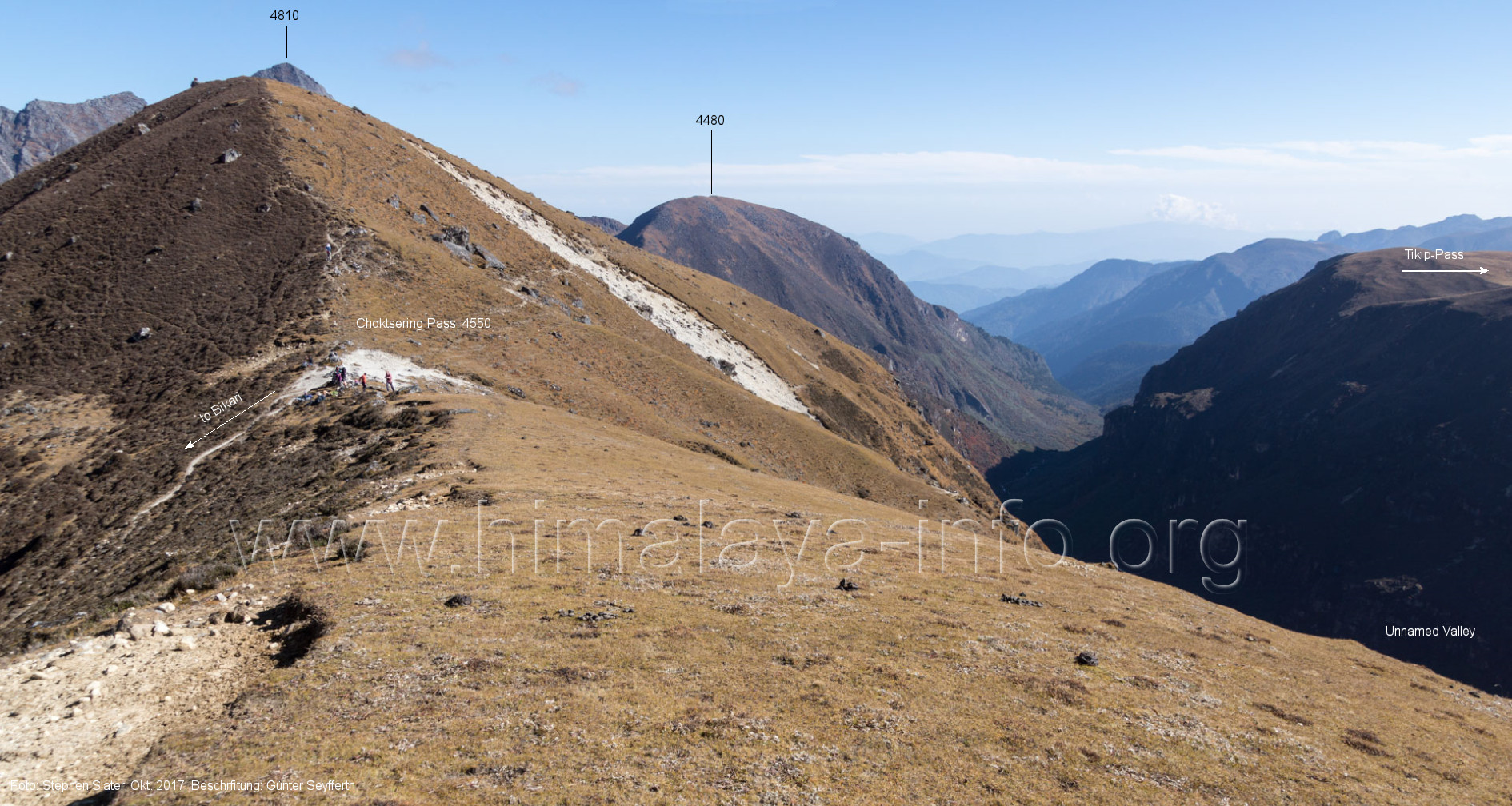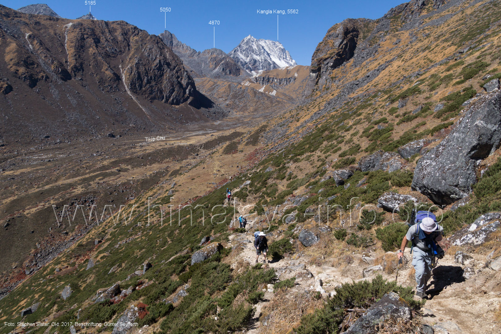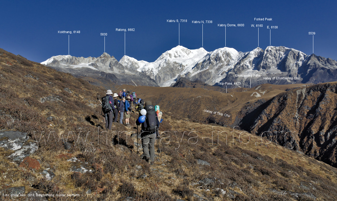 dem Tal des Choktsering Chu nach Dzongri noch zu überwinden sind. Foto: phkkr, Nov. 2018; Beschriftung: Günter Seyfferth (33) Blick aus dem Tal des Tipik Chu nach Südosten Rechts sieht man den Pfad, der von der Hochalm Panding herunter kommt. Foto: Stephen Slater, Okt. 2017; Beschriftung: Günter Seyfferth (34) Blick vom Aufstieg aus dem Tal des Tipik Chu zum Tipik-Pass nach Nordwesten zum Kangla Kang (5562 m) Foto: Stephen Slater, Okt. 2017; Beschriftung: Günter Seyfferth (35) Blick vom Tikip-Pass (4423 m) nach Ost-Nordosten zum Tingchenkang (6010 m) und Jopuno (5936 m)