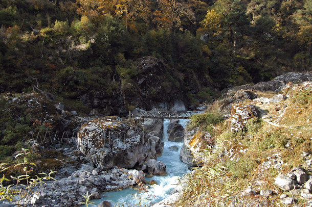abgeleitet. Foto: Patrick Entraygues, Beschriftung: Günter Seyfferth Vom Rastplatz Selele hat man die folgende Sicht nach Nordwesten: (227) Blick vom Rastplatz Selele (4220 m) nach Nordwesten zu den Gipfeln auf der anderen Seite des Ghunsa-Tals