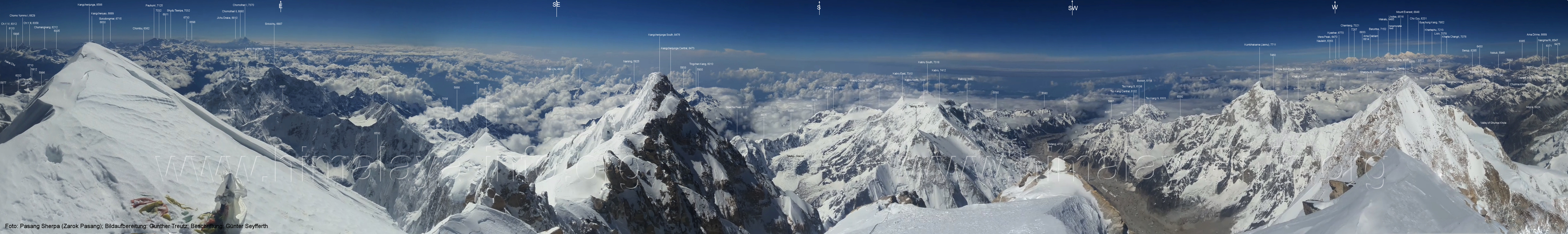 berücksichtigt, die den südlichen Bereich der Kangchenjunga-Region umfassen. Die komplette Rundumsicht mit Teilbereichen und Angaben zu den Entfernungen finden Sie hier. (174) 360-Grad-Panorama vom Gipfel des Kangchenjunga (8586 m) Am linken und
