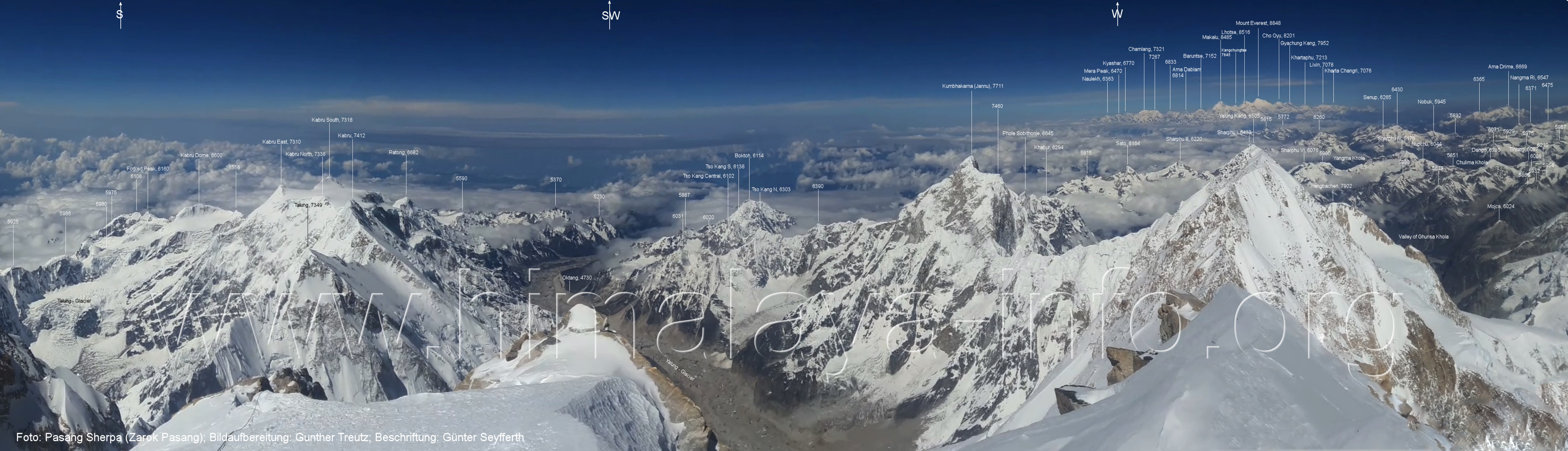 rechten Bildrand ist jeweils die Schneepyramide des Gipfels zu sehen. Die linke Bildhälfte zeigt das folgenden Panorama: (175) Teil-Panorama vom Gipfel des Kangchenjunga (8686 m) nach Osten über Süden bis Westen Am oberen Bildrand sind die Himmelsrichtungen markiert. Video/Foto: SherpaZarok Pasang/Günther Treutz; Beschriftung: Günter Seyfferth Und wiederum die linke Bildhälfte zeigt das folgende Panorama: (176) Blick vom Gipfel des Kangchenjunga nach Ost-Nordosten bis Süden