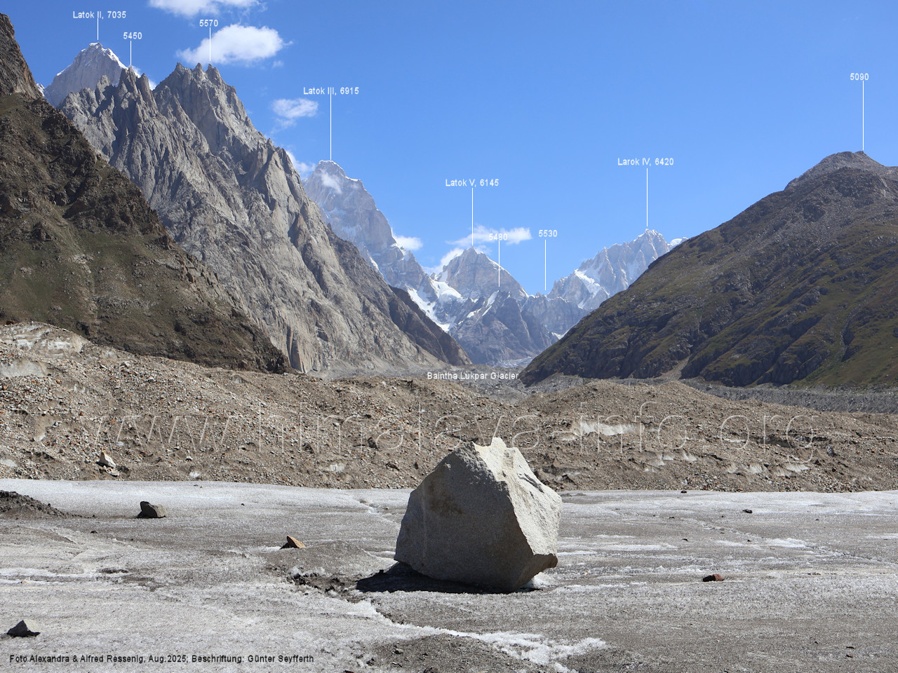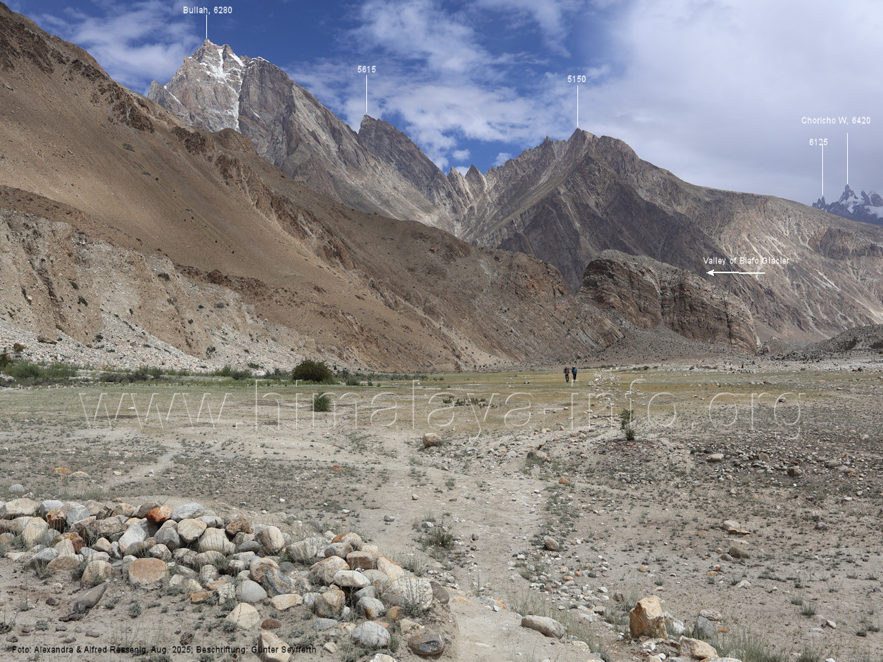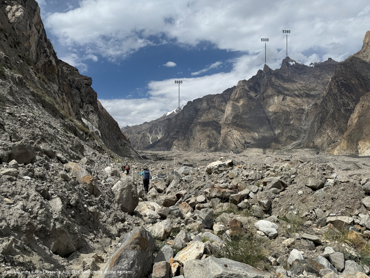 Felskopfs. Foto: Alexandra & Alfred Ressenig, Aug. 2025; Beschriftung: Günter Seyfferth (13) Blick von der westlichen Randmoräne des Biafo-Gletschers nach Nordosten zum Bullah (6280 m) Hier wird der Wanderer rasten, um sich für die bevorstehenden Anstrengungen in den Eis- und Geröllhügeln des Gletschers zu stärken. Foto: Marek Romanovicz, Juli 2019; Beschriftung: Günter Seyfferth