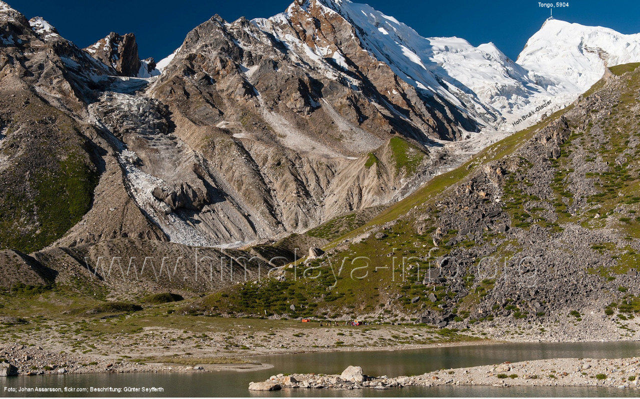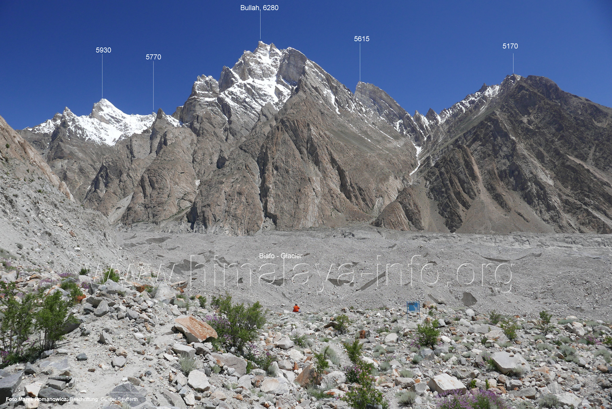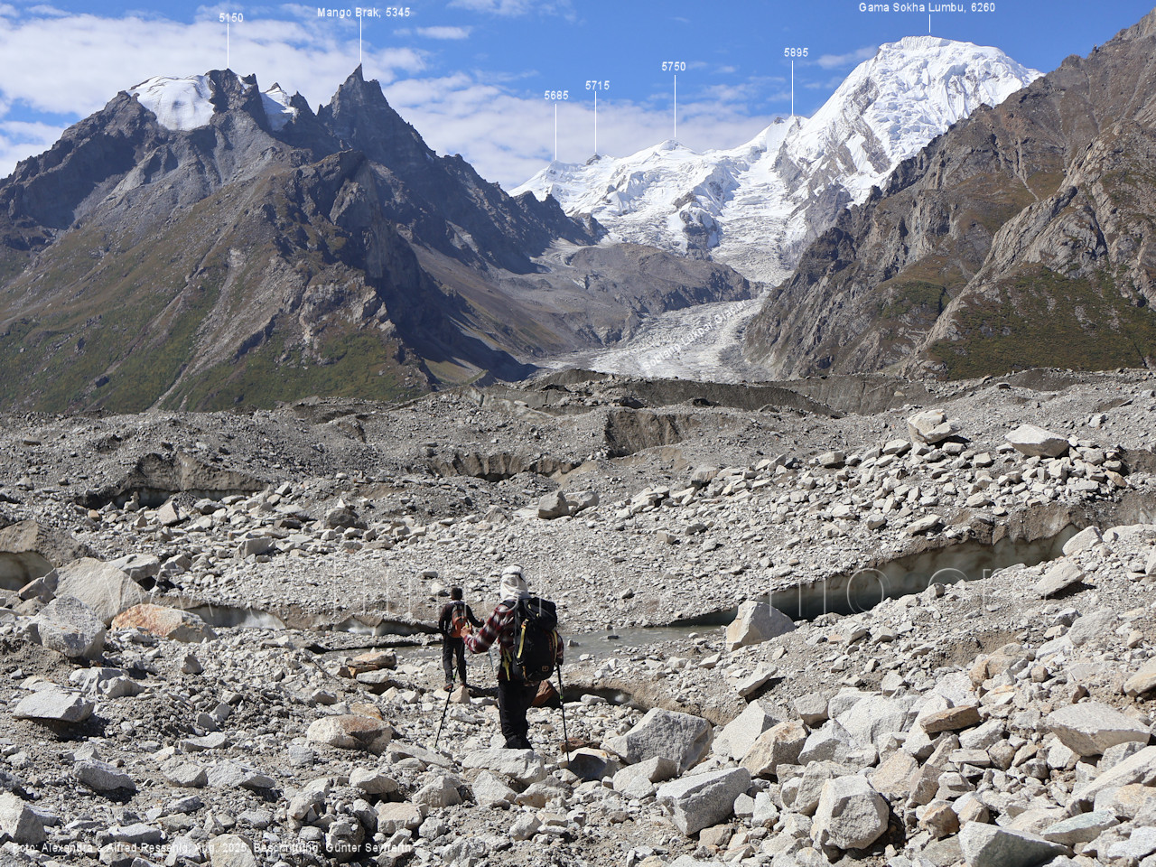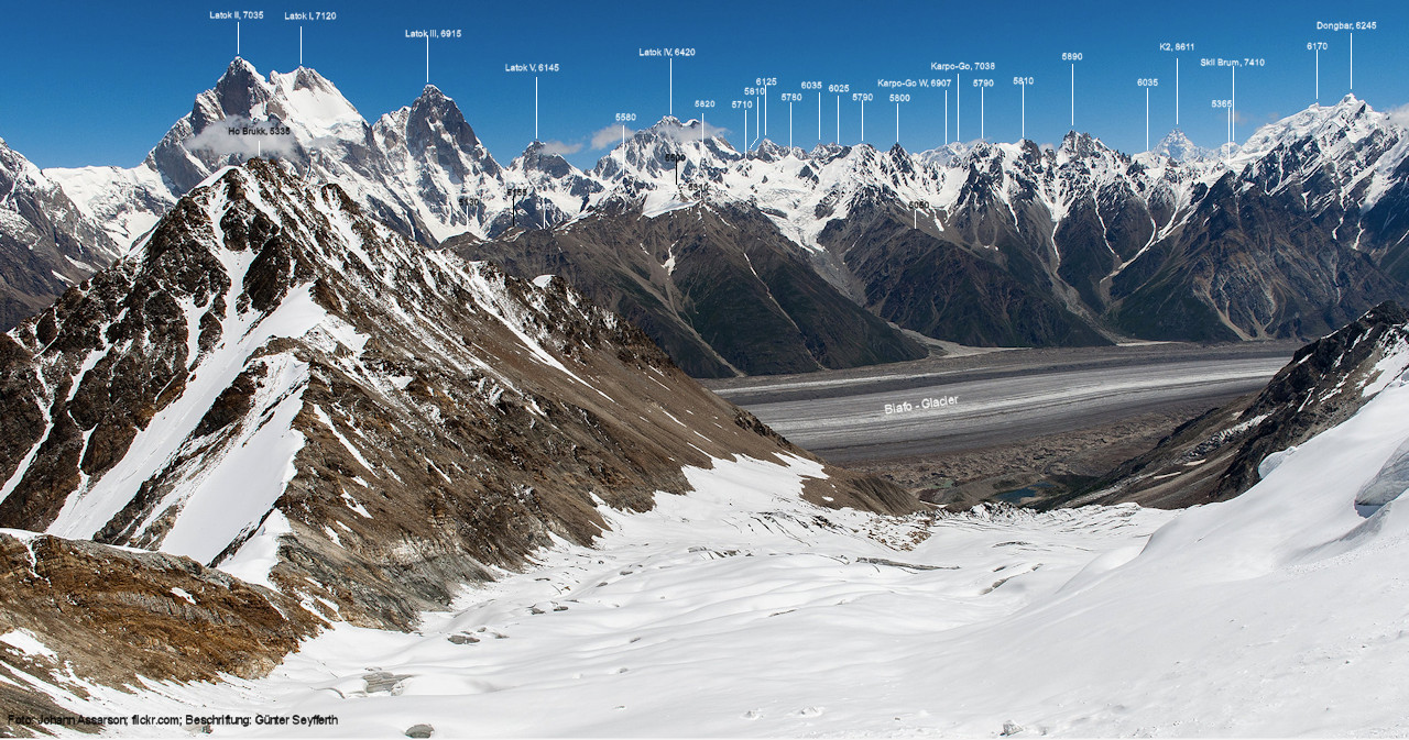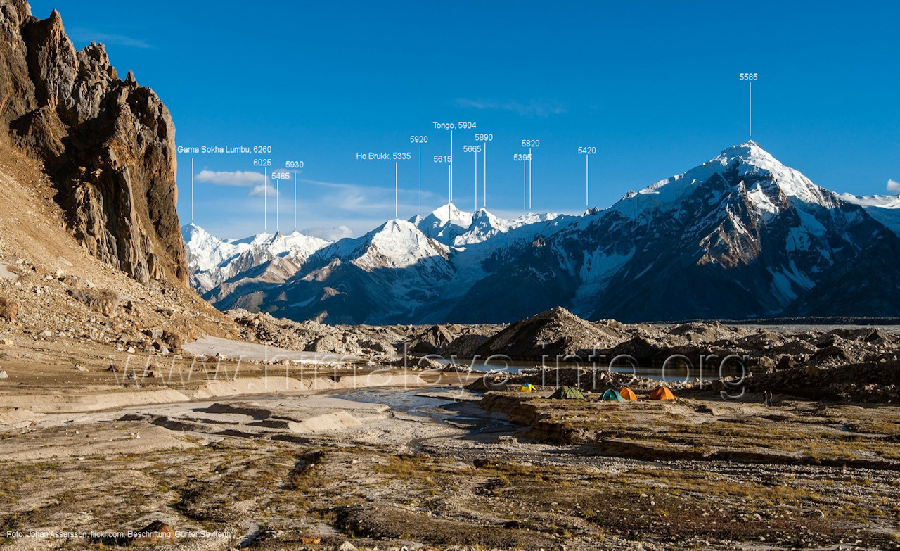 Ogre (Menschenfresser), Foto: Paul Boslooper, flickr.com; Beschriftung: Günter Seyfferth (25) Blick aus ca. 3600 m Höhe bei 35°45' auf dem Biafo-Gletscher nach Westen zum Gama Sokha Lumbu (6260 m) Von diesem Berg fließt der Mango-Gletscher herab zum Biafo-Gletscher. Hinter den Moränen an dessen Einmündung liegt der Rastplatz Mango in 3700 m Höhe. Foto: Marek Romanovicz, Juli 2019; Beschriftung: Günter Seyfferth (26) Blick von der südwestlichen Randmoräne des Biafo-Gletschers vor dem Rastplatz Mango nach Ost-Südosten zum Bullah (6280 m)