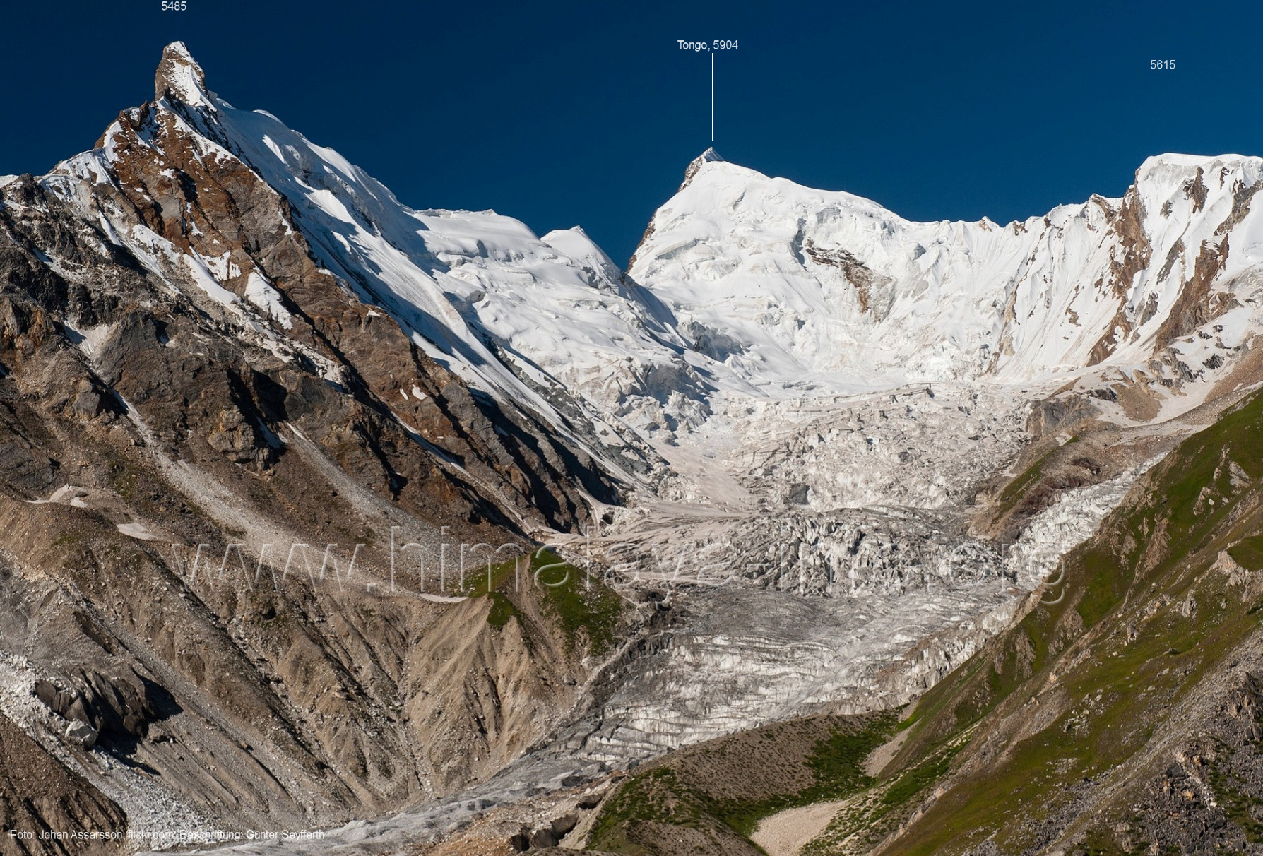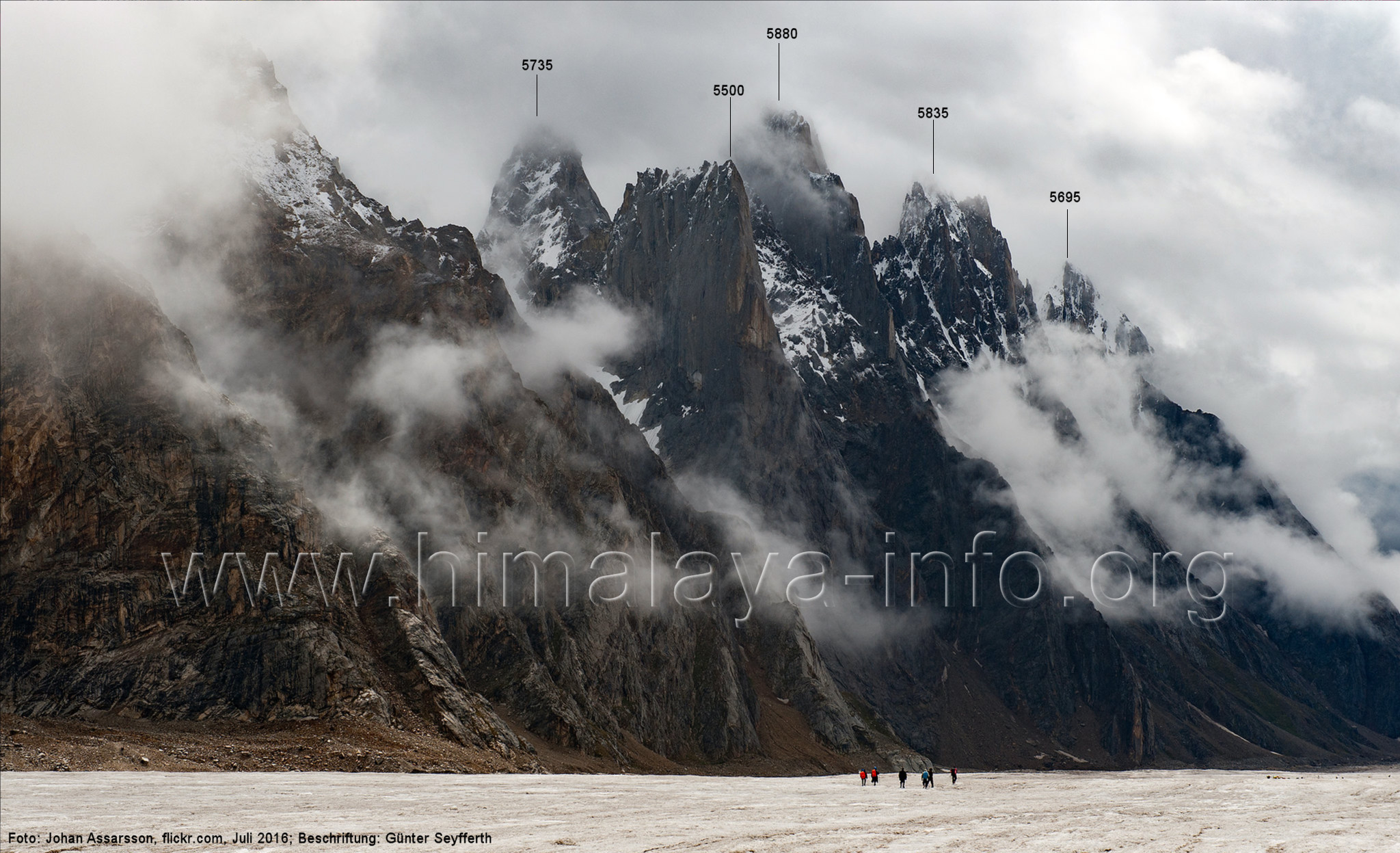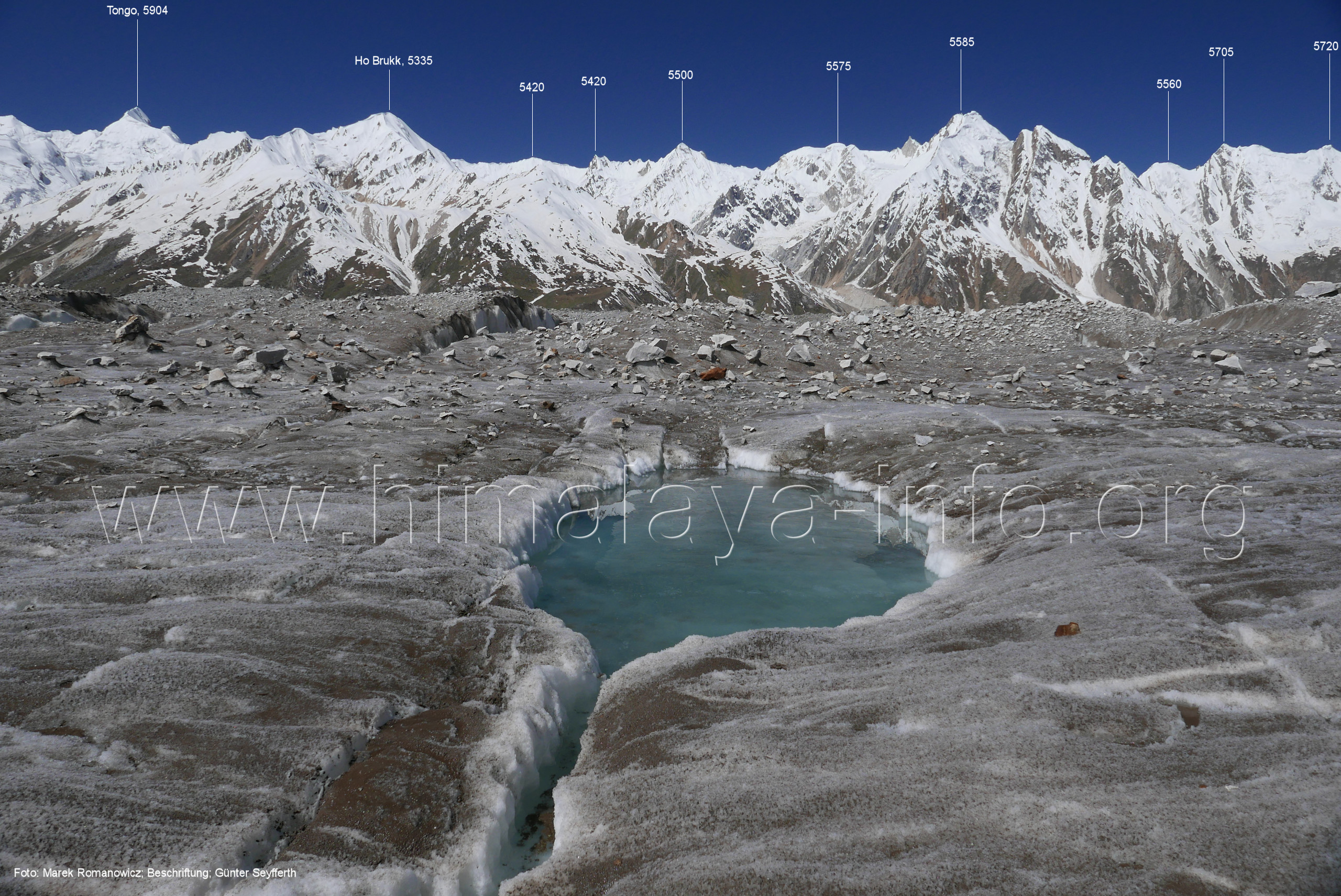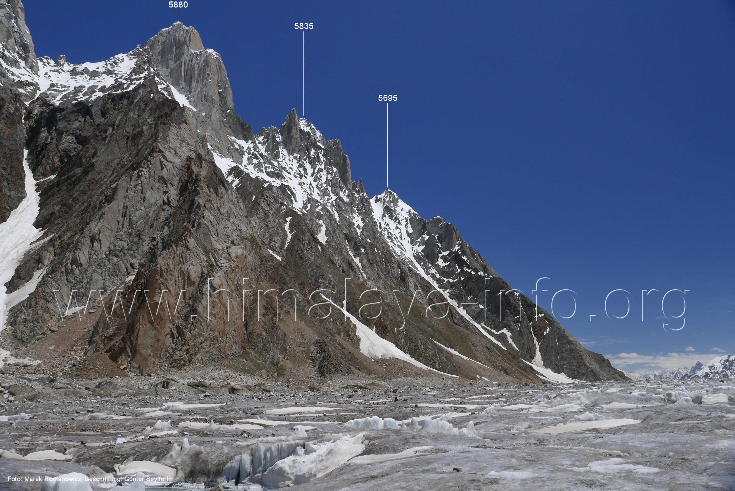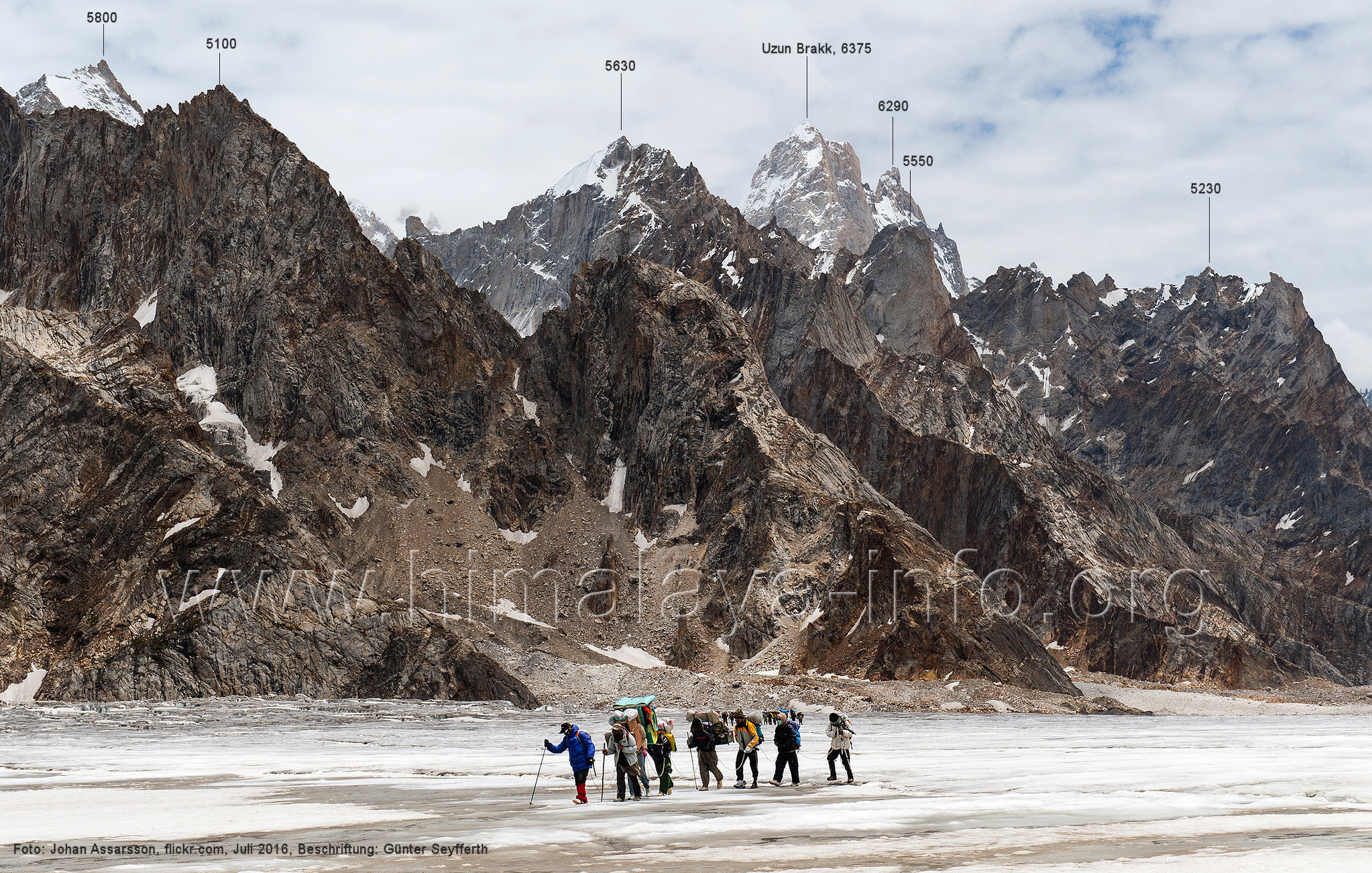 Ogre (Menschenfresser), Foto: Paul Boslooper, flickr.com; Beschriftung: Günter Seyfferth (25) Blick aus ca. 3600 m Höhe bei 35°45' auf dem Biafo-Gletscher nach Westen zum Gama Sokha Lumbu (6260 m) Von diesem Berg fließt der Mango-Gletscher herab zum Biafo-Gletscher. Hinter den Moränen an dessen Einmündung liegt der Rastplatz Mango in 3700 m Höhe. Foto: Marek Romanovicz, Juli 2019; Beschriftung: Günter Seyfferth (26) Blick von der südwestlichen Randmoräne des Biafo-Gletschers vor dem Rastplatz Mango nach Ost-Südosten zum Bullah (6280 m)