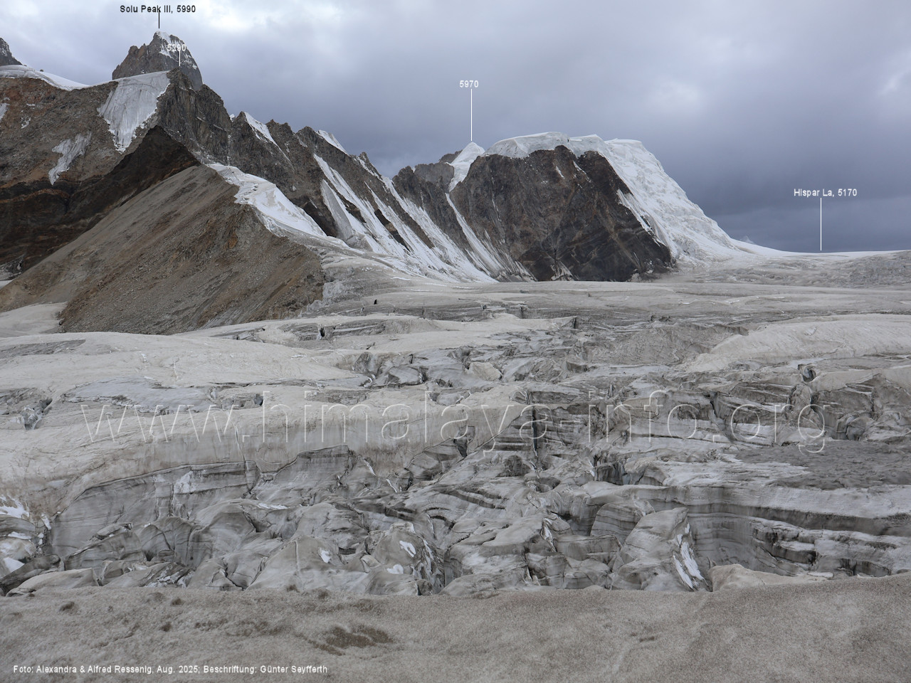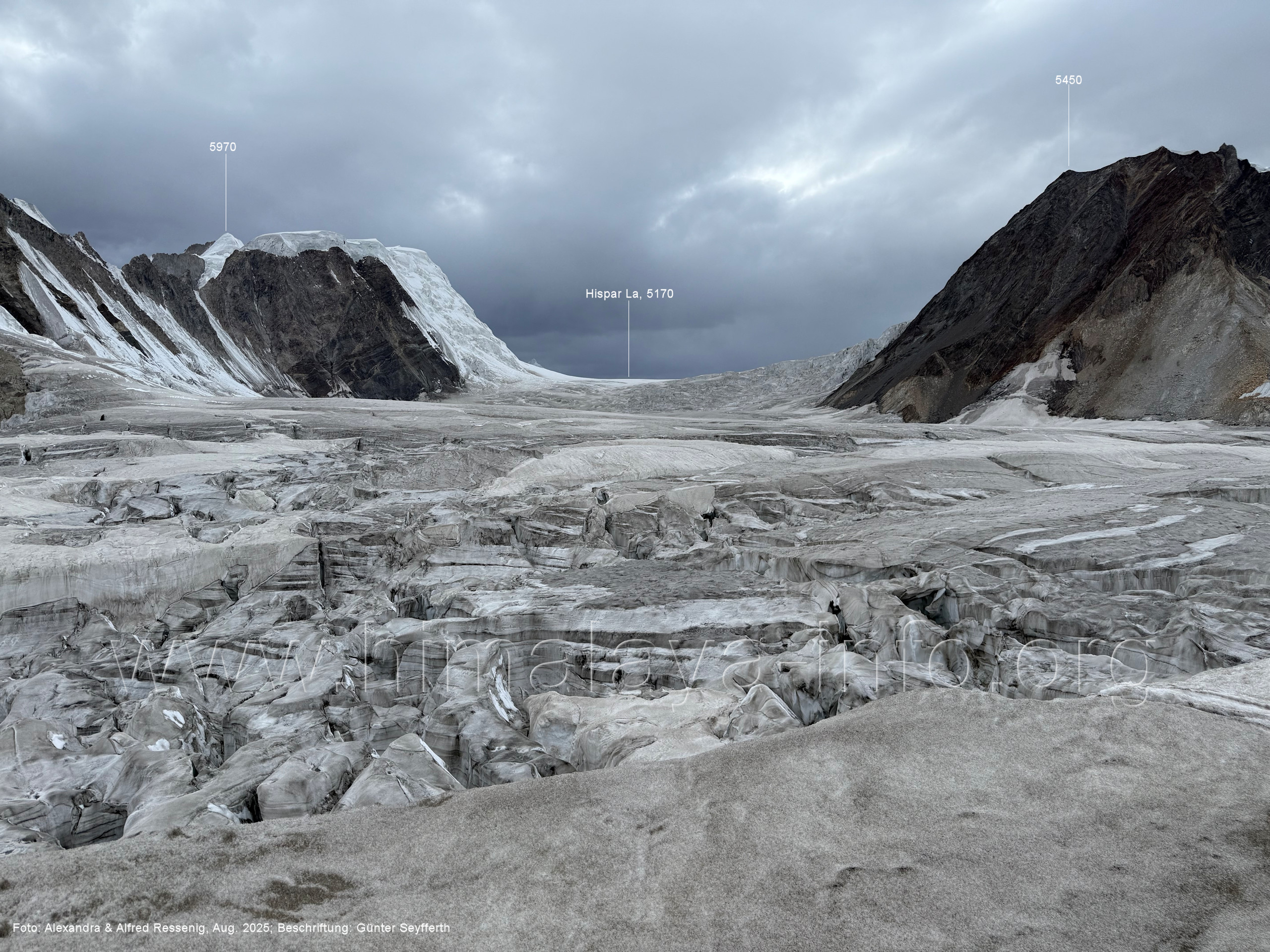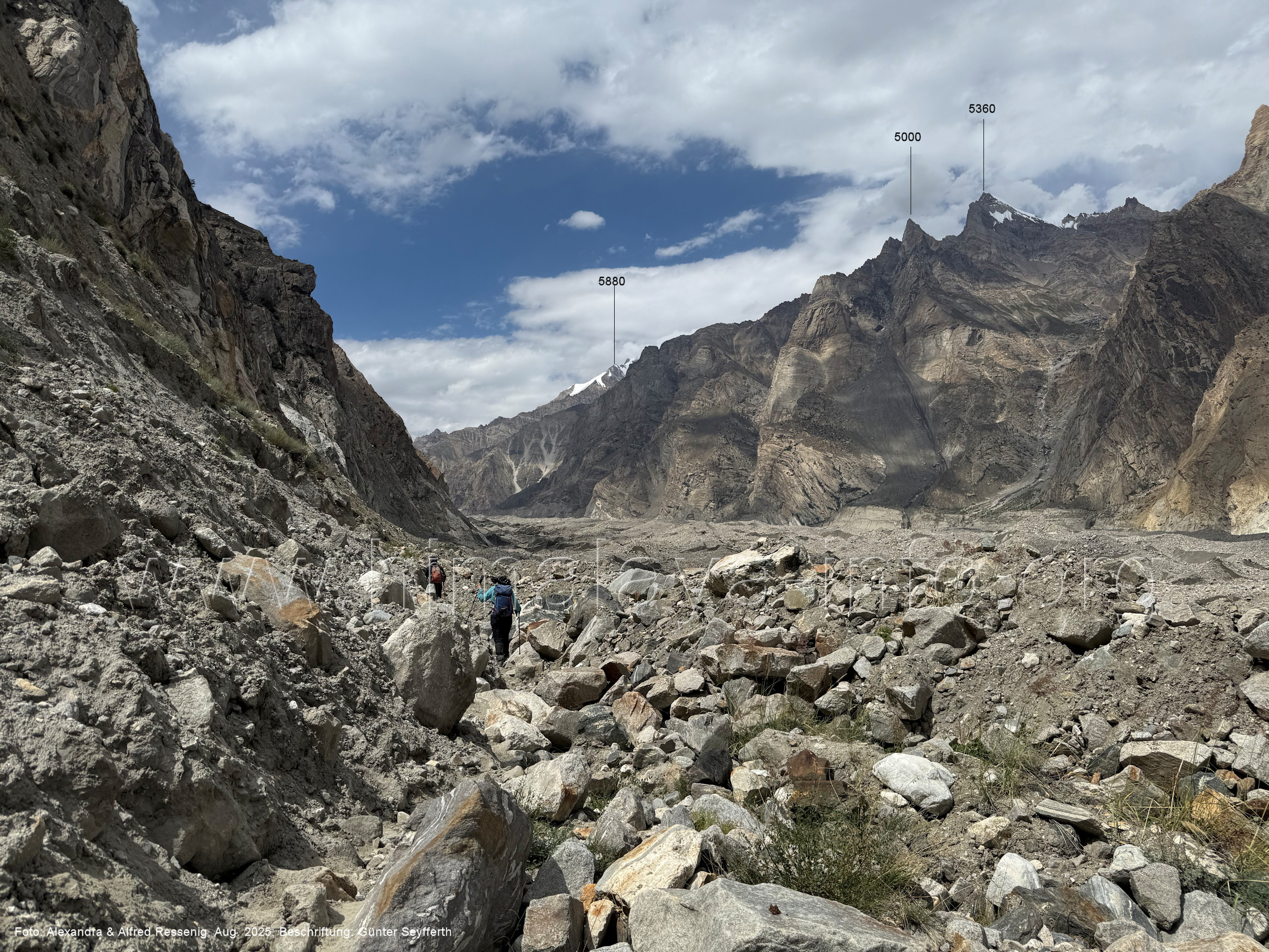 Hier haben wir die breiteste Stelle des Biafo-Gletschers vor Augen. Foto: Alexandra & Alfred Ressenig, Aug. 2025; Beschriftung: Günter Seyfferth