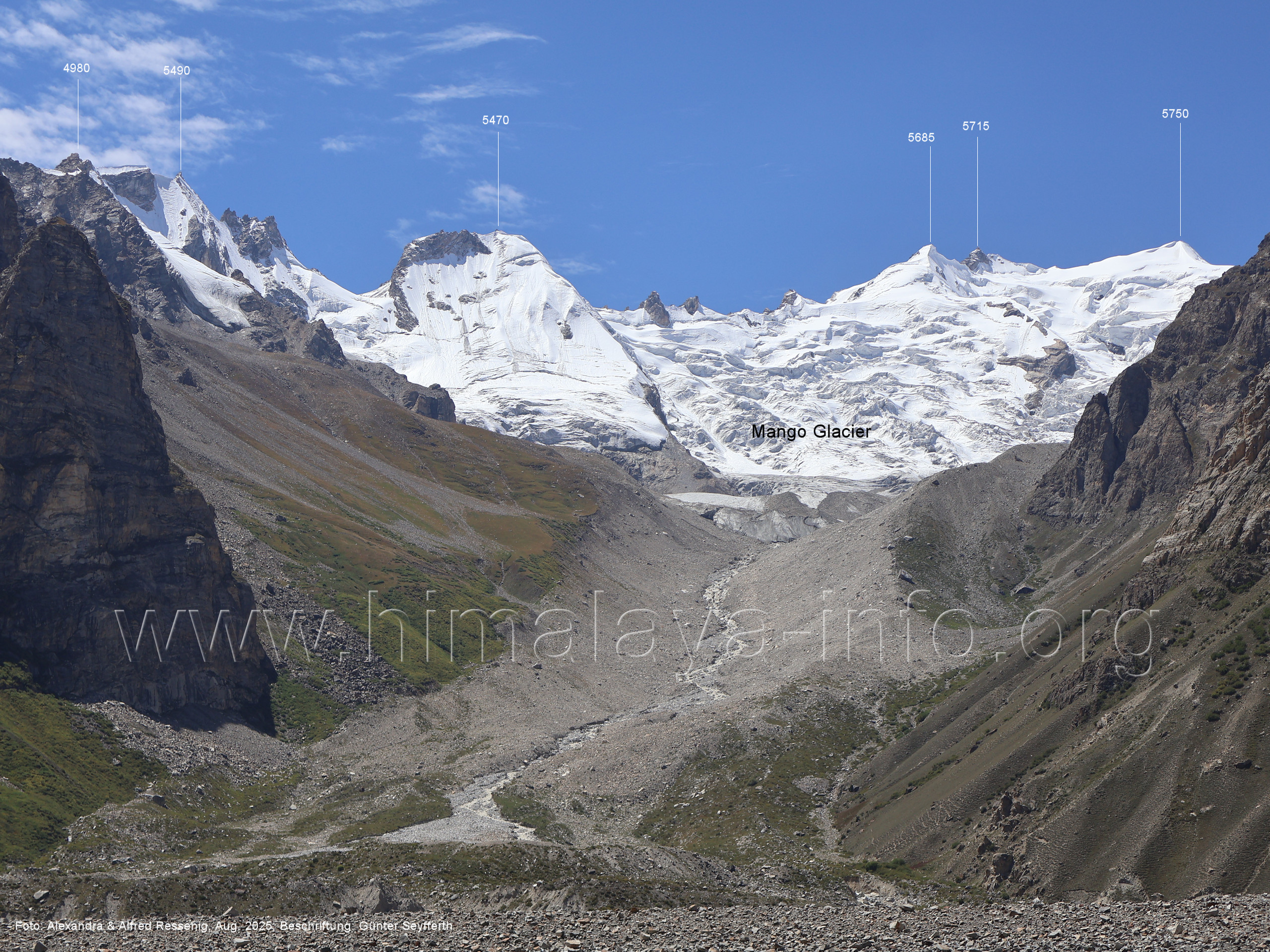 Rastplatz Mango Foto: Shahid Durrani, flickr.com, Juli 2016; Beschriftung: Günter Seyfferth Das Seitental des Mango-Gletschers ist der erste breitere Einschnitt auf der Südwestseite des Biafo-Gletschers: (27) Blick aus ca. 3680 m Höhe bei 35°46'15 auf dem Biafo-Gletscher nach Südwesten zum Mango-Gletscher Im Bereich der Einmündung dieses Seitentals liegt der Rastplatz Mango. Foto: Alexandra & Alfred Ressenig, Aug. 2025; Beschriftung: Günter Seyfferth (28) Berghang hinter dem Rastplatz Mango (3700 m) Foto: Shahid Durrani, flickr.com, Juli 2016; Beschriftung: Günter Seyfferth