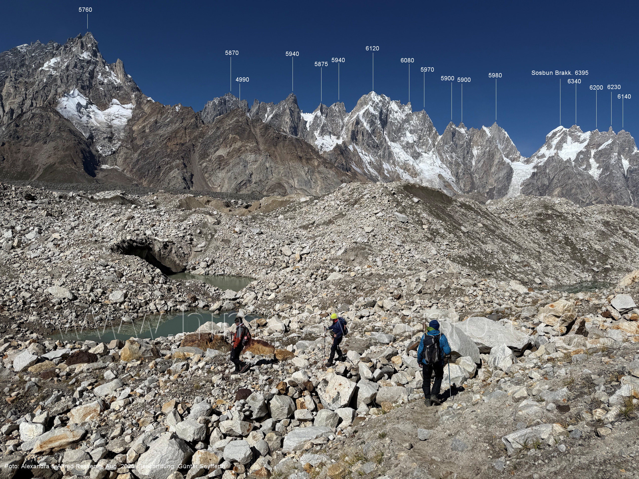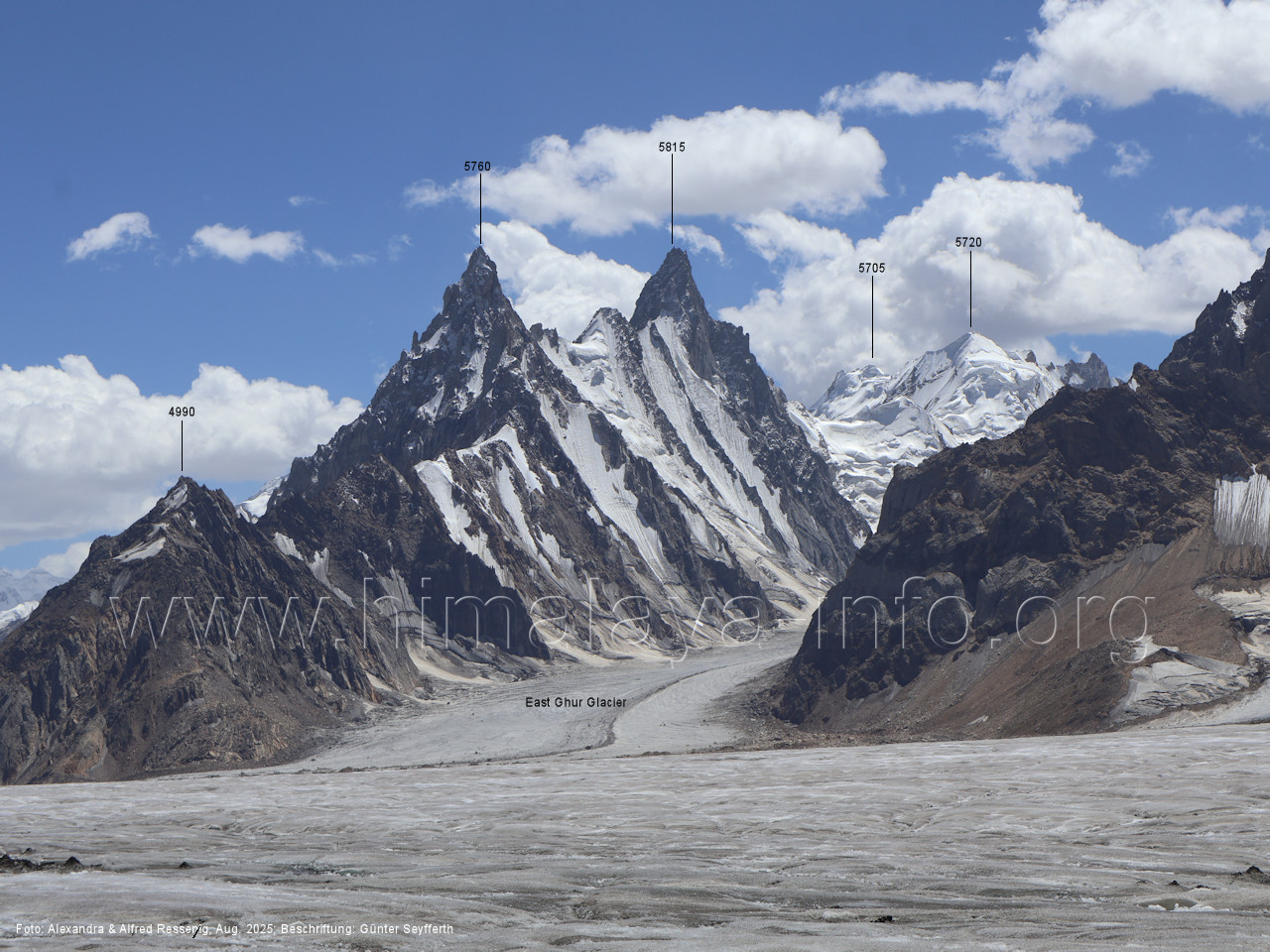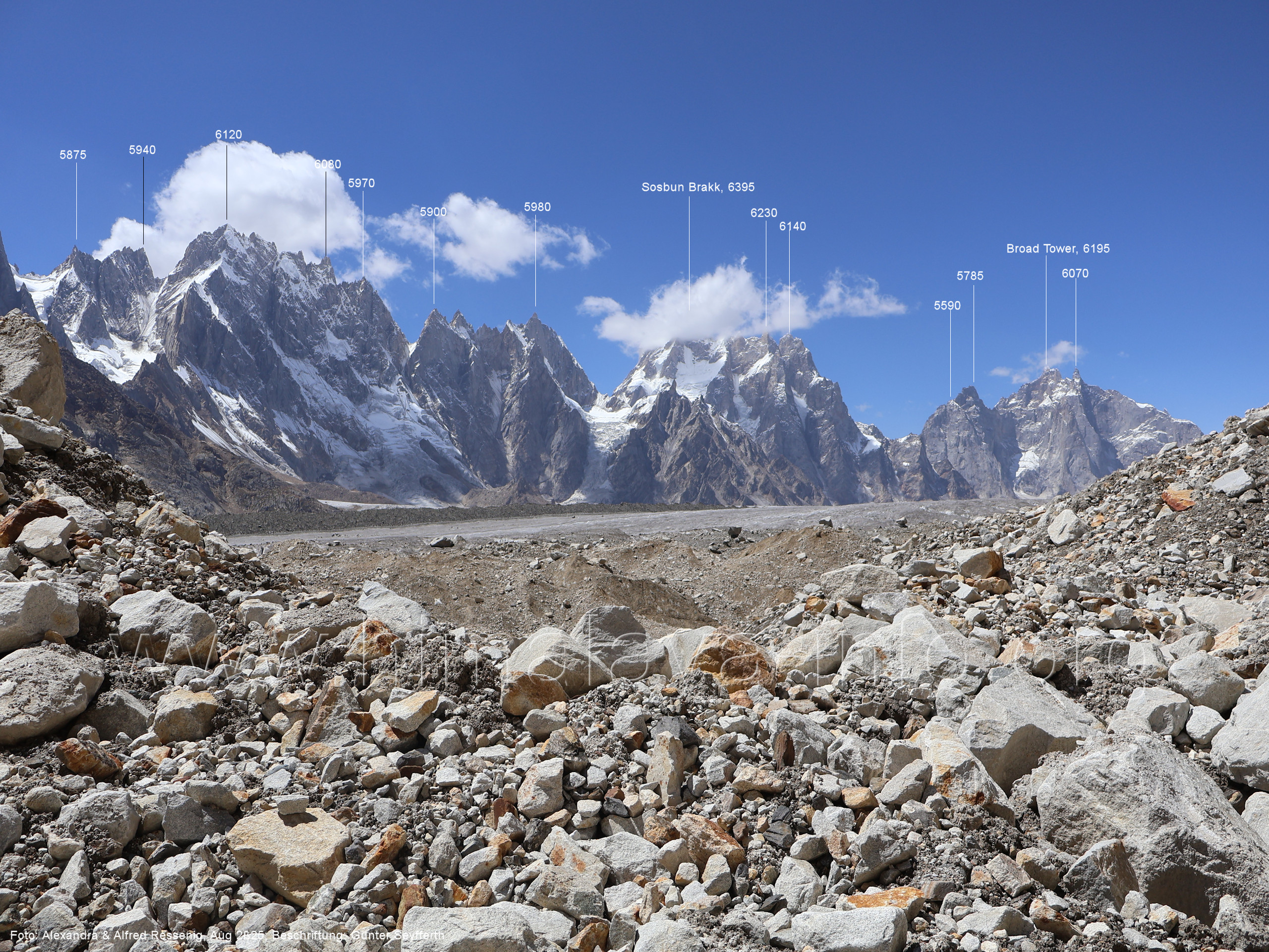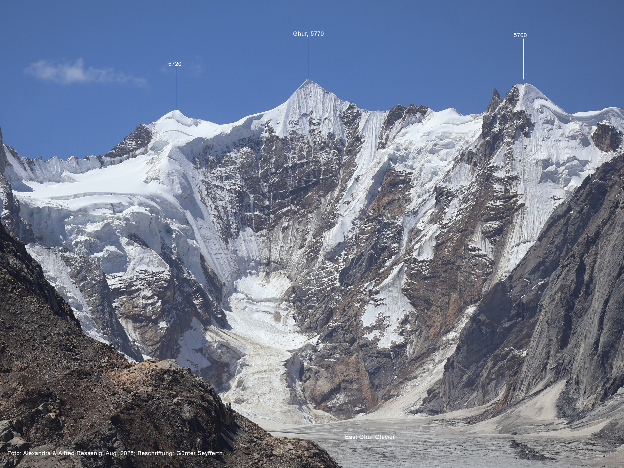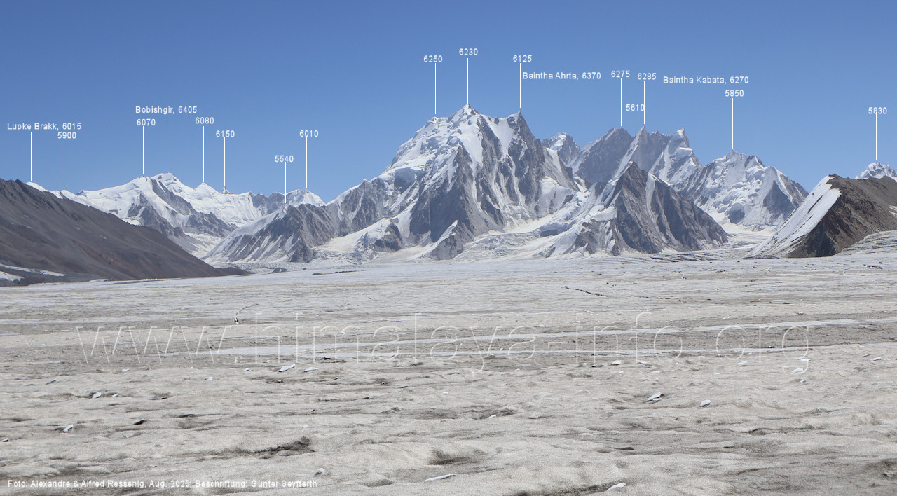 am Ghur-Gletscher auf. Foto: Marek Romanovicz; Beschriftung: Günter Seyfferth (183) Teleblick vom Lagerplatz 4600 auf dem Noafo-Gletscher nach Süden zum Gama Sokha Lumbu Foto: Alexandra & Alfred Ressenig, Aug. 2025; Beschriftung: Günter Seyfferth (184) Blick vom Lagerplatz 4600 auf dem Biafo-Gletscher nach Süden zu den markanten Gipfeln 5760 und 5815 am East Ghur-Gletscher Foto: Alexandra & Alfred Ressenig, Aug. 2025; Beschriftung: Günter Seyfferth (185) Blick vom Lagerplatz 4600 auf dem Biafo-Gletscher nach Süd-Südwesten zum Peak 5980 Bitte vergleichen Sie mit Bild Nr. 181. Foto: Shahid Durrani, flickr.com; Beschriftung: Günter Seyfferth (186) Blick vom Lagerplatz 4600 auf dem Biafo-Gletscher nach Südwesten mit Sosbun Brakk (6395 m) und Broad Tower (6195 m)