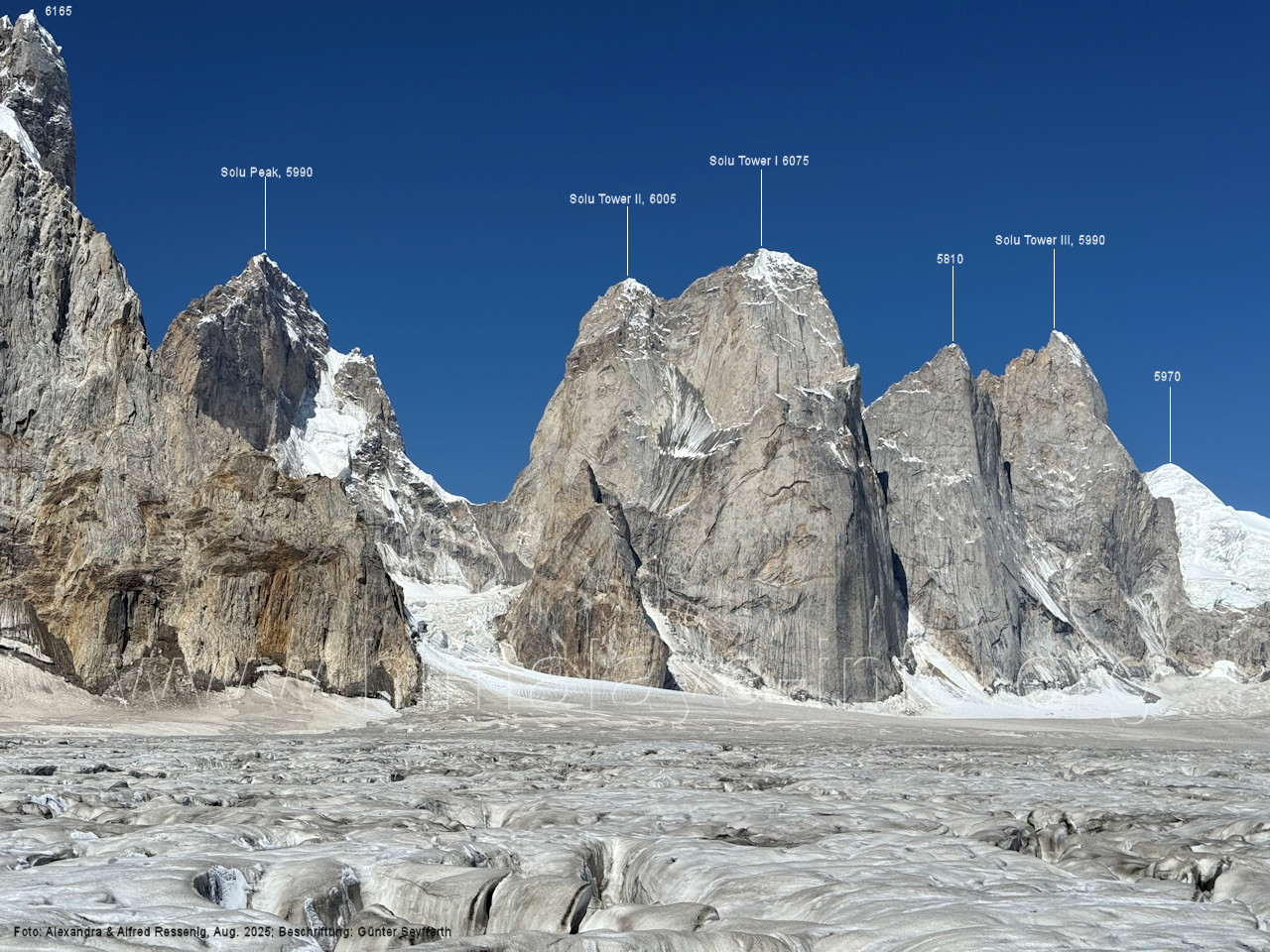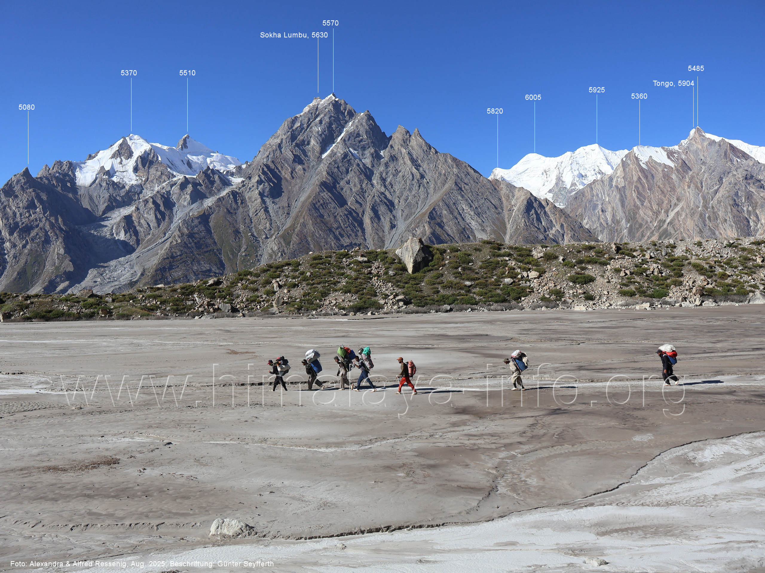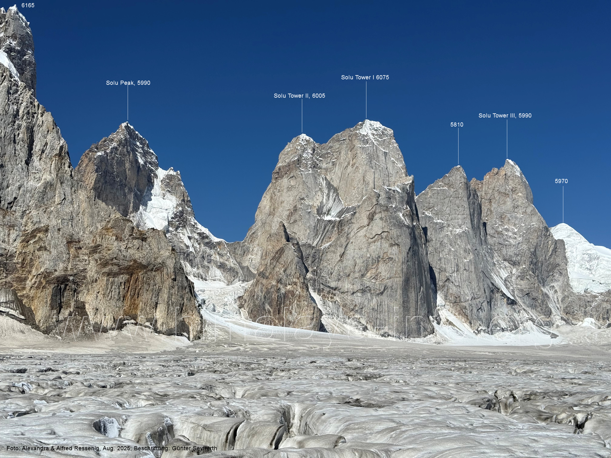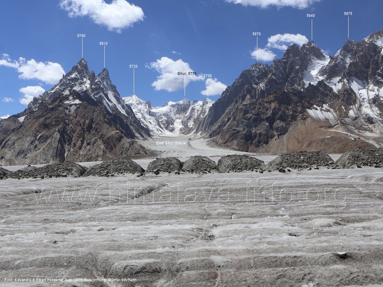 am Ghur-Gletscher auf. Foto: Marek Romanovicz; Beschriftung: Günter Seyfferth (183) Teleblick vom Lagerplatz 4600 auf dem Noafo-Gletscher nach Süden zum Gama Sokha Lumbu Foto: Alexandra & Alfred Ressenig, Aug. 2025; Beschriftung: Günter Seyfferth (184) Blick vom Lagerplatz 4600 auf dem Biafo-Gletscher nach Süden zu den markanten Gipfeln 5760 und 5815 am East Ghur-Gletscher Foto: Alexandra & Alfred Ressenig, Aug. 2025; Beschriftung: Günter Seyfferth (185) Blick vom Lagerplatz 4600 auf dem Biafo-Gletscher nach Süd-Südwesten zum Peak 5980 Bitte vergleichen Sie mit Bild Nr. 181. Foto: Shahid Durrani, flickr.com; Beschriftung: Günter Seyfferth (186) Blick vom Lagerplatz 4600 auf dem Biafo-Gletscher nach Südwesten mit Sosbun Brakk (6395 m) und Broad Tower (6195 m)