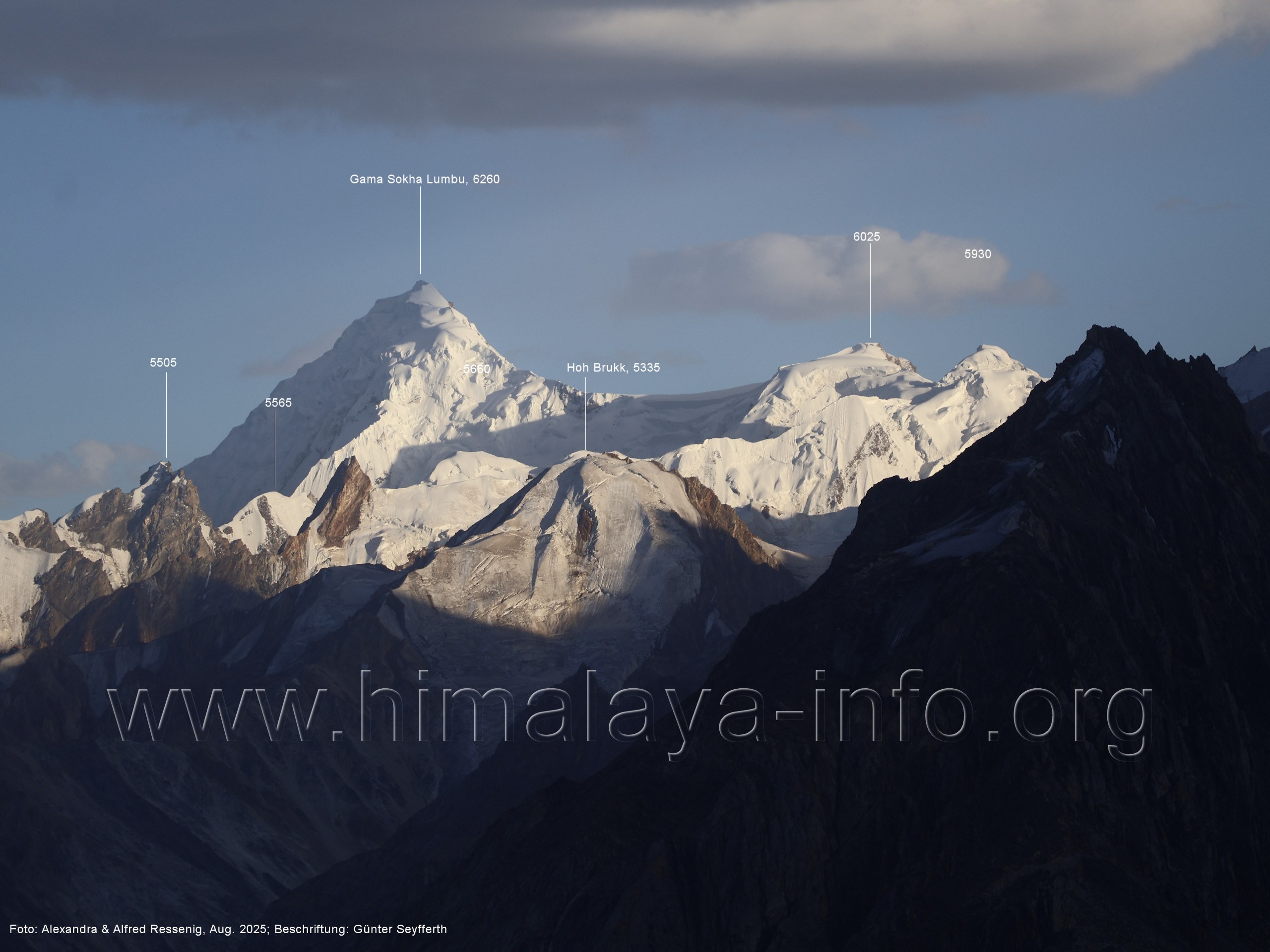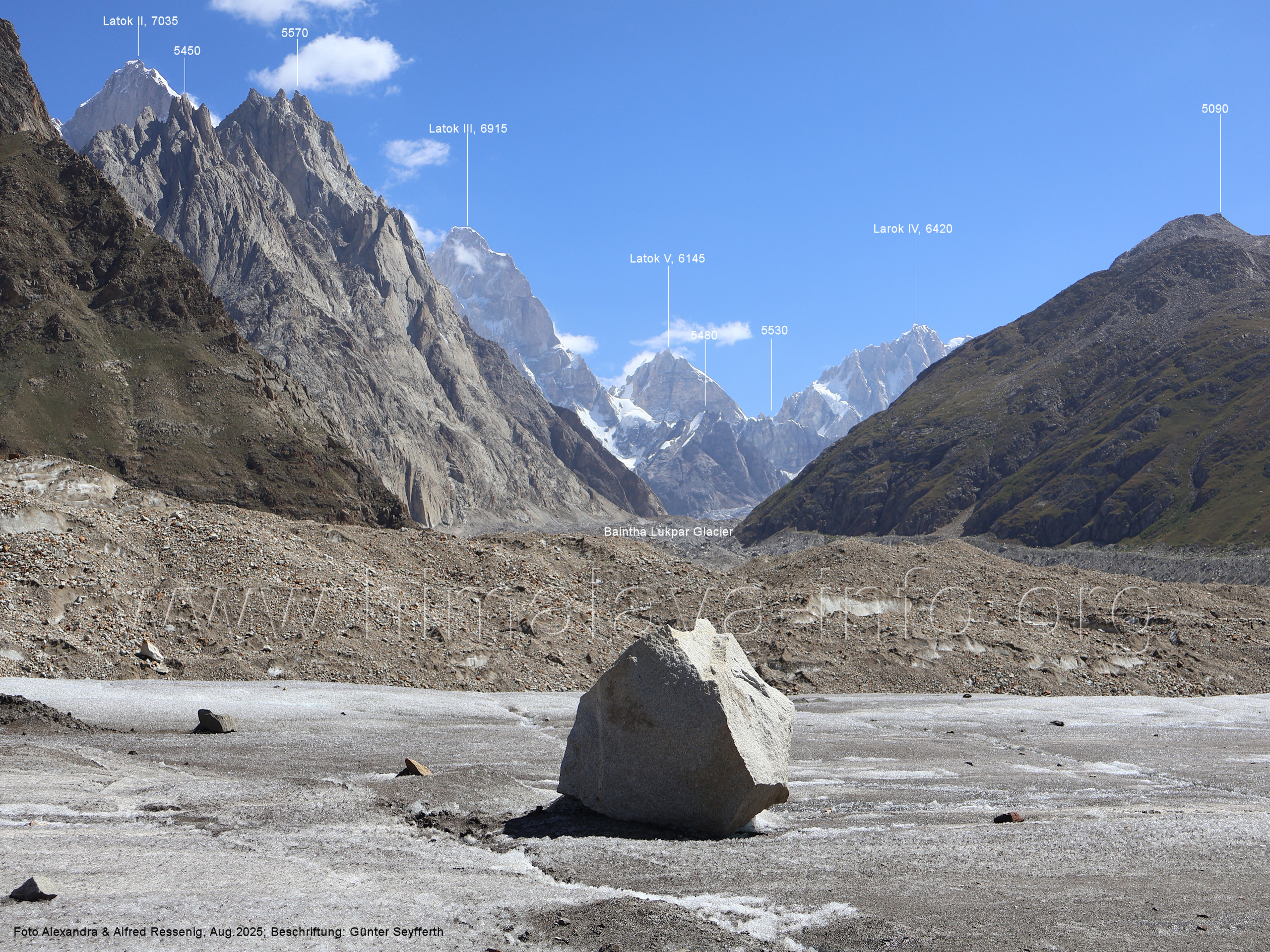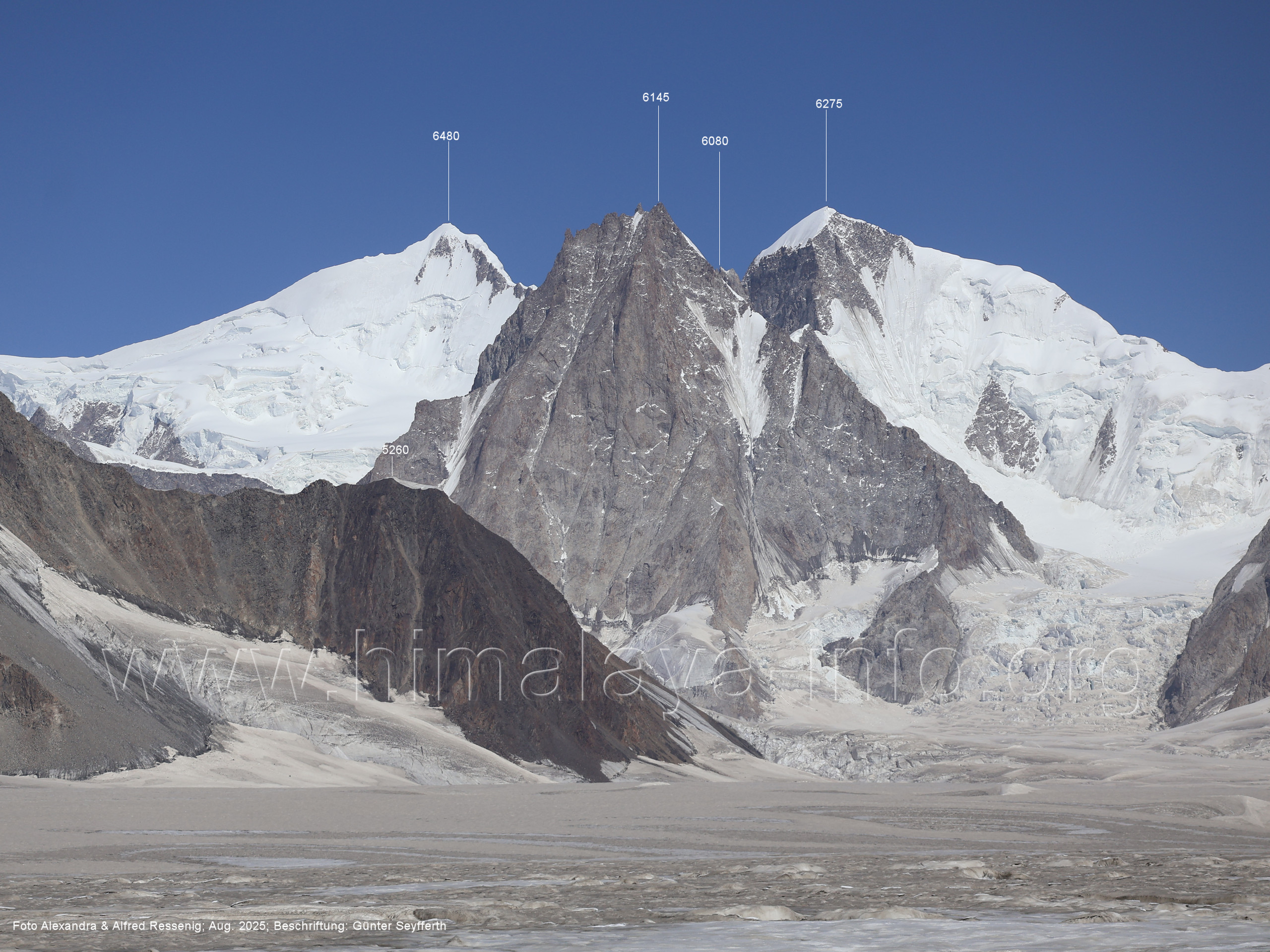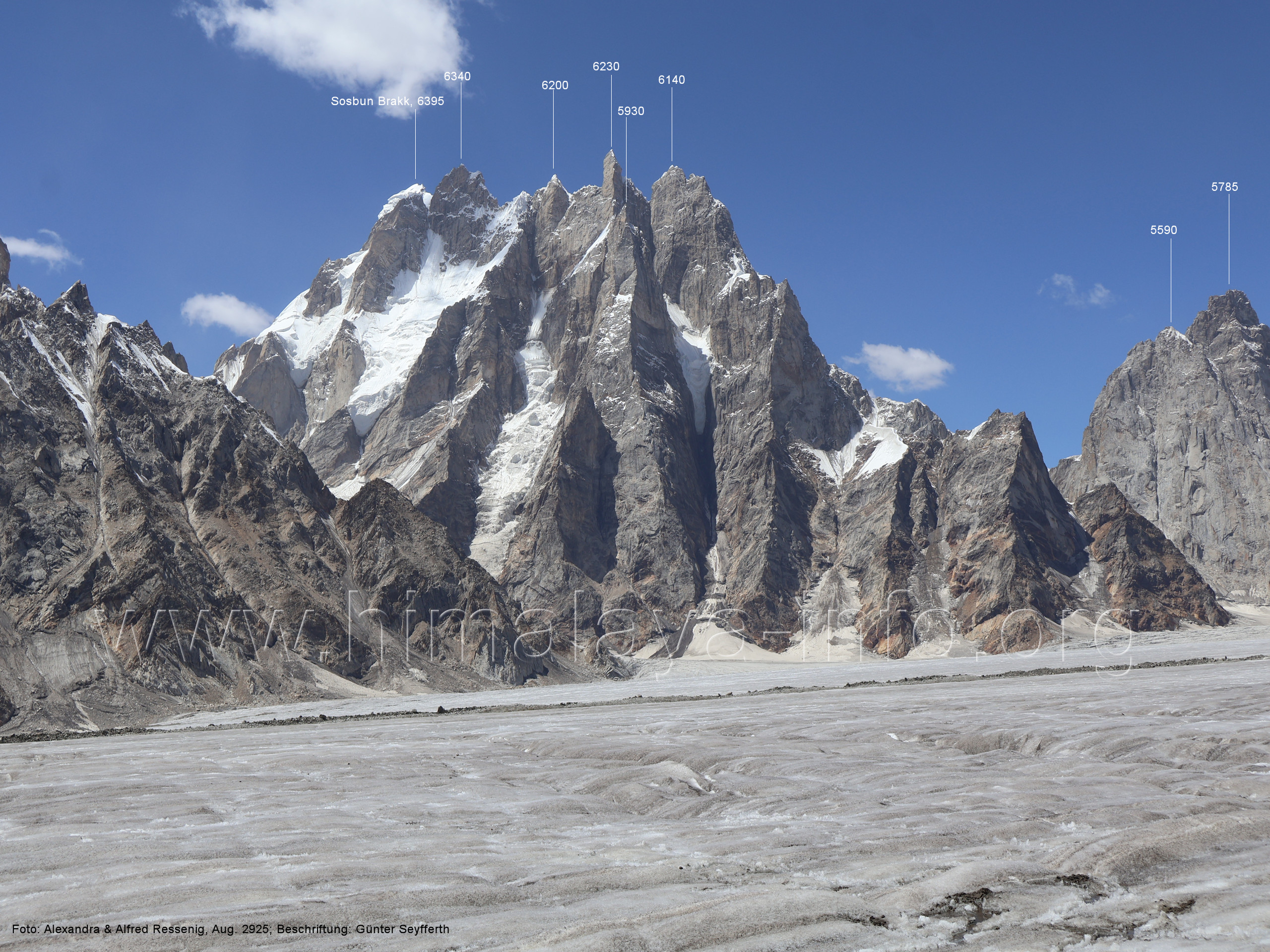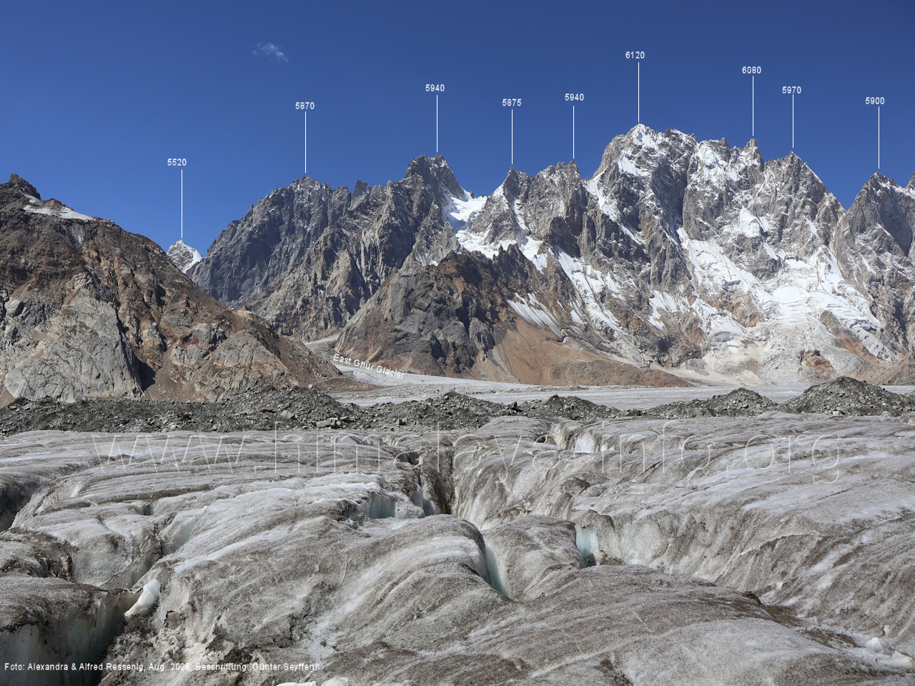 am Ghur-Gletscher auf. Foto: Marek Romanovicz; Beschriftung: Günter Seyfferth (183) Teleblick vom Lagerplatz 4600 auf dem Noafo-Gletscher nach Süden zum Gama Sokha Lumbu Foto: Alexandra & Alfred Ressenig, Aug. 2025; Beschriftung: Günter Seyfferth (184) Blick vom Lagerplatz 4600 auf dem Biafo-Gletscher nach Süden zu den markanten Gipfeln 5760 und 5815 am East Ghur-Gletscher Foto: Alexandra & Alfred Ressenig, Aug. 2025; Beschriftung: Günter Seyfferth (185) Blick vom Lagerplatz 4600 auf dem Biafo-Gletscher nach Süd-Südwesten zum Peak 5980 Bitte vergleichen Sie mit Bild Nr. 181. Foto: Shahid Durrani, flickr.com; Beschriftung: Günter Seyfferth (186) Blick vom Lagerplatz 4600 auf dem Biafo-Gletscher nach Südwesten mit Sosbun Brakk (6395 m) und Broad Tower (6195 m)