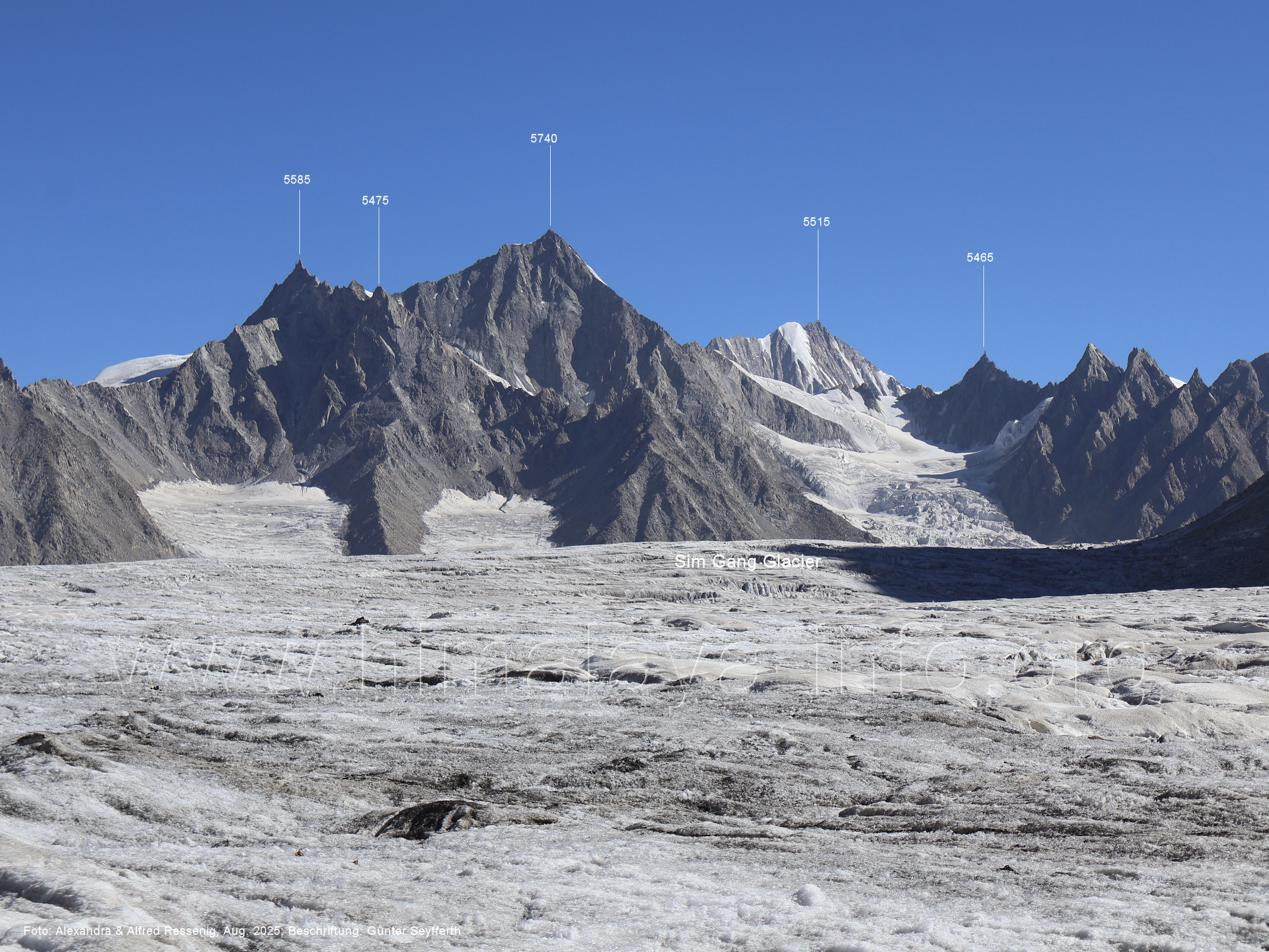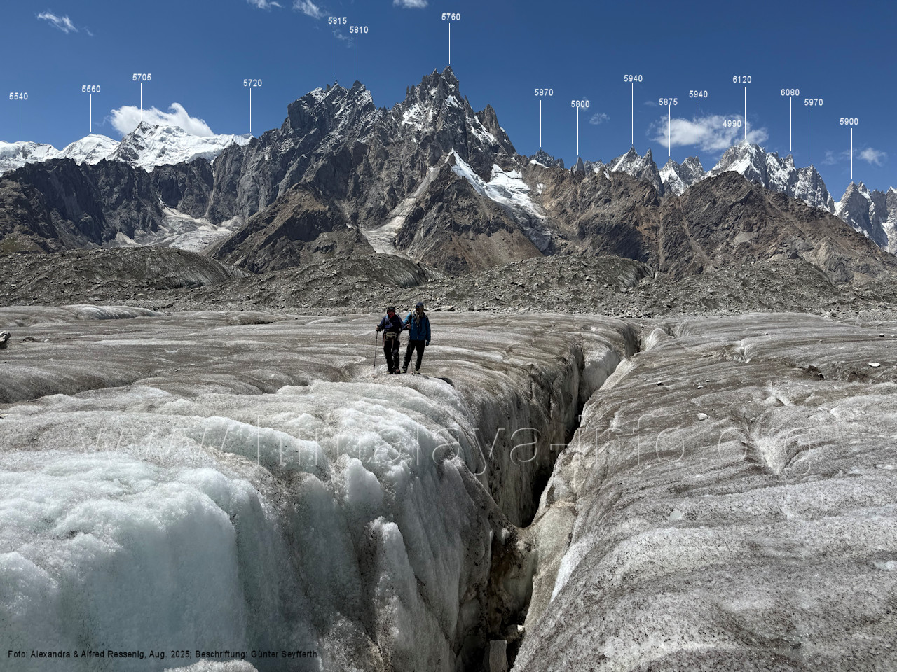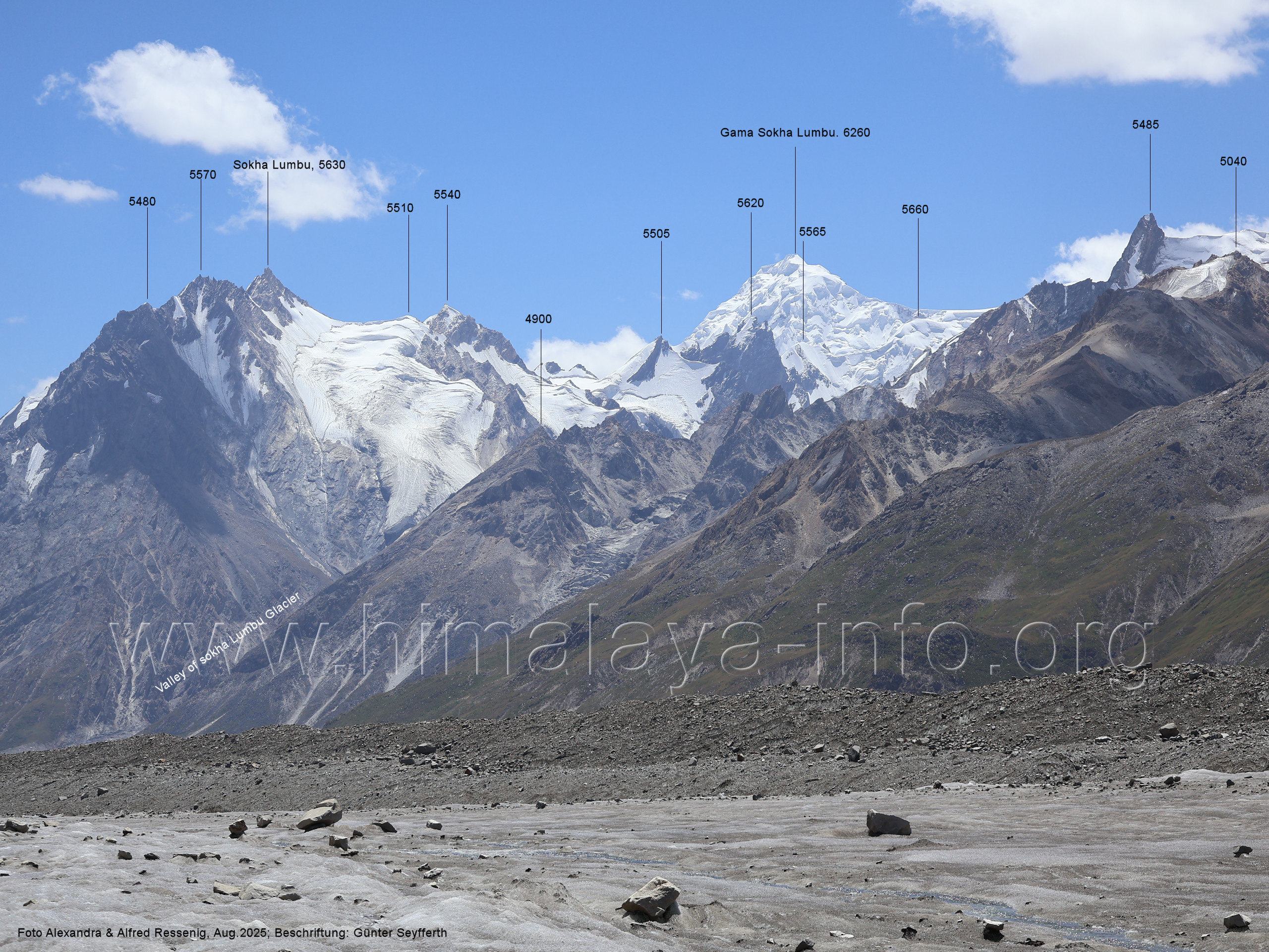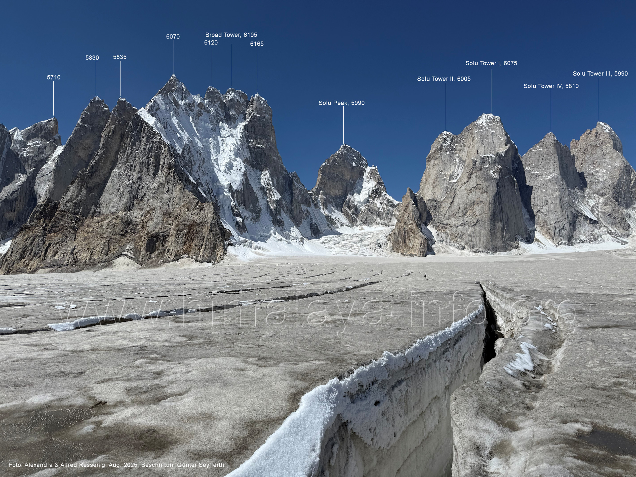 am Ghur-Gletscher auf. Foto: Marek Romanovicz; Beschriftung: Günter Seyfferth (183) Teleblick vom Lagerplatz 4600 auf dem Noafo-Gletscher nach Süden zum Gama Sokha Lumbu Foto: Alexandra & Alfred Ressenig, Aug. 2025; Beschriftung: Günter Seyfferth (184) Blick vom Lagerplatz 4600 auf dem Biafo-Gletscher nach Süden zu den markanten Gipfeln 5760 und 5815 am East Ghur-Gletscher Foto: Alexandra & Alfred Ressenig, Aug. 2025; Beschriftung: Günter Seyfferth (185) Blick vom Lagerplatz 4600 auf dem Biafo-Gletscher nach Süd-Südwesten zum Peak 5980 Bitte vergleichen Sie mit Bild Nr. 181. Foto: Shahid Durrani, flickr.com; Beschriftung: Günter Seyfferth (186) Blick vom Lagerplatz 4600 auf dem Biafo-Gletscher nach Südwesten mit Sosbun Brakk (6395 m) und Broad Tower (6195 m)
