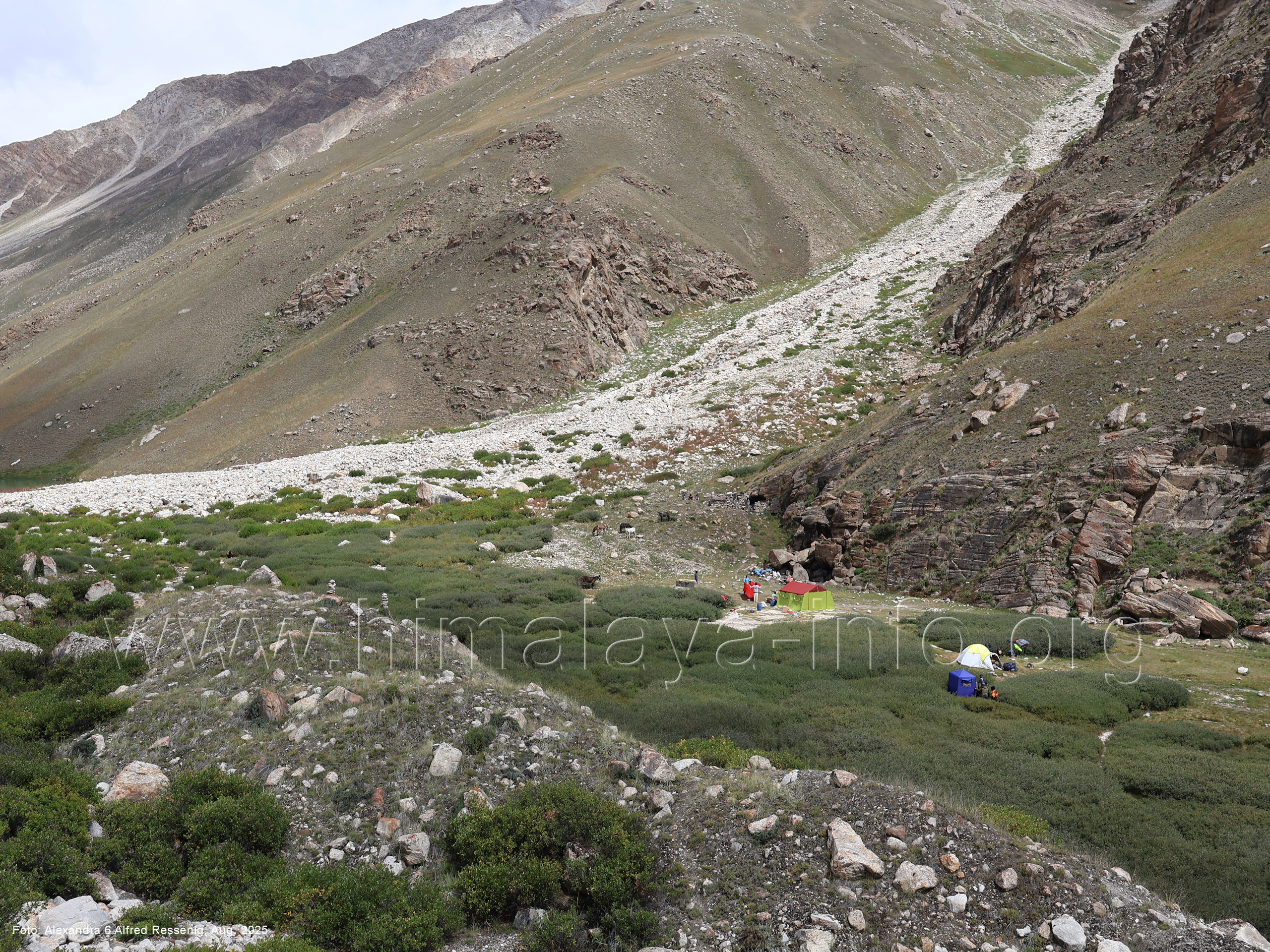 sucht man sich einen Weg Foto: Alexandra & Alfred Ressenig, Aug. 2025; Beschriftung: Günter Seyfferth (16) Blick vom Rastplatz Namla (3300 m) nach Südosten in das Tal des Biaho Lungma
