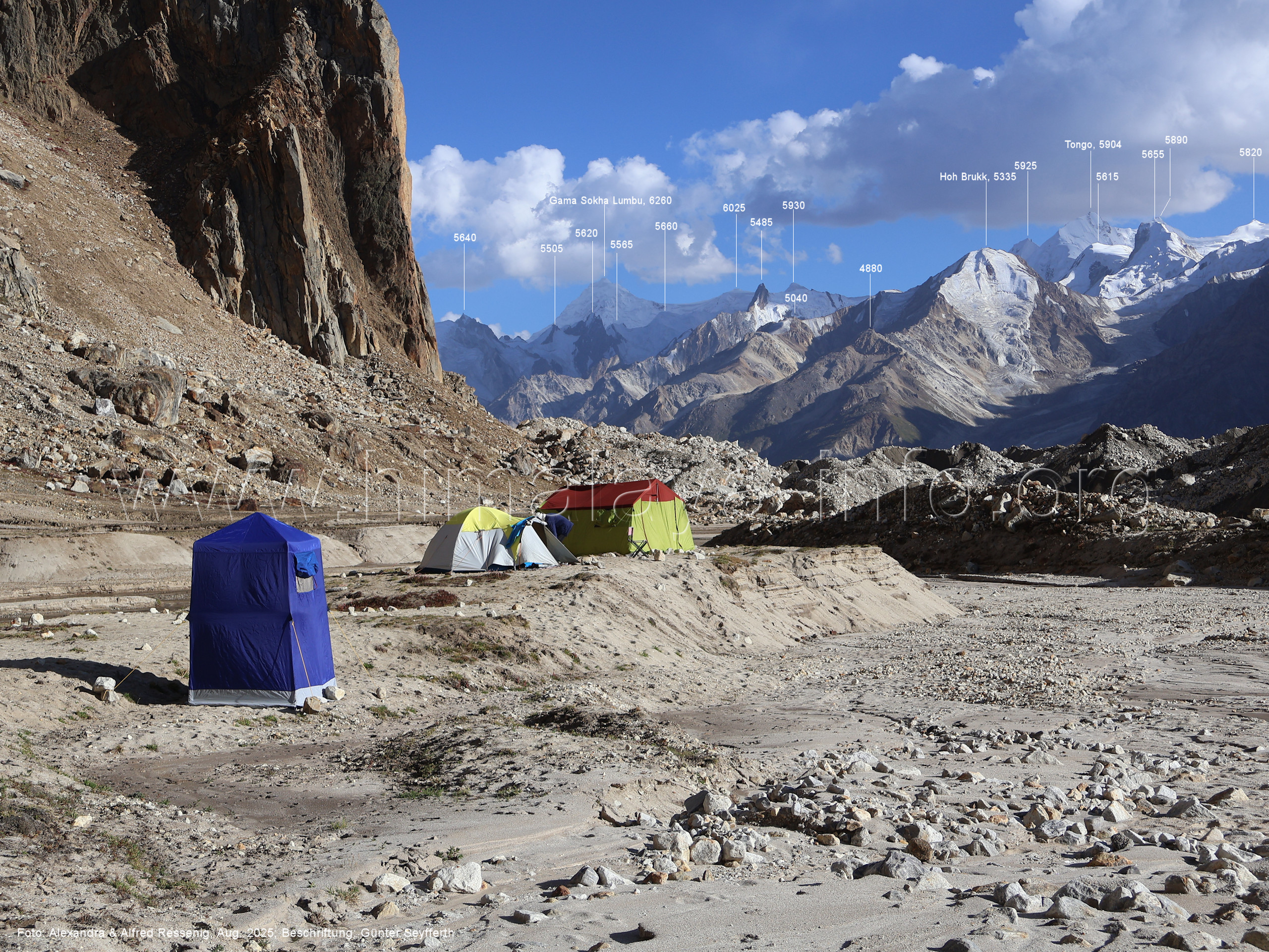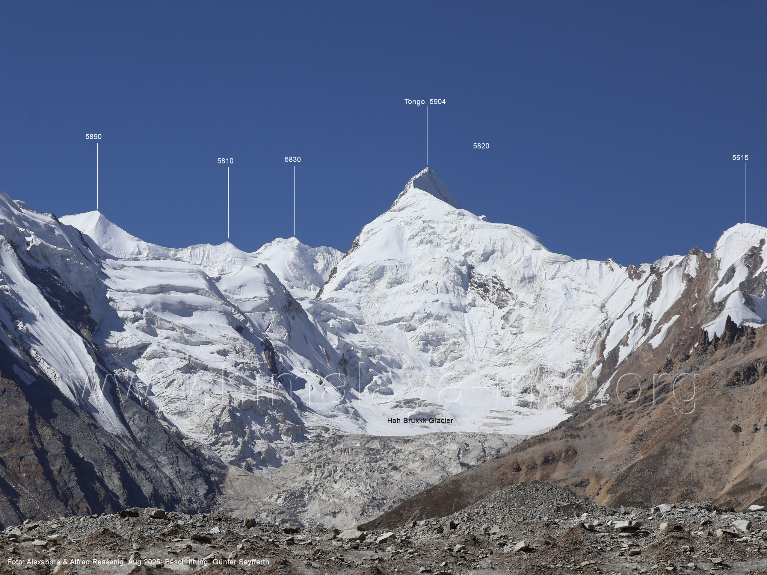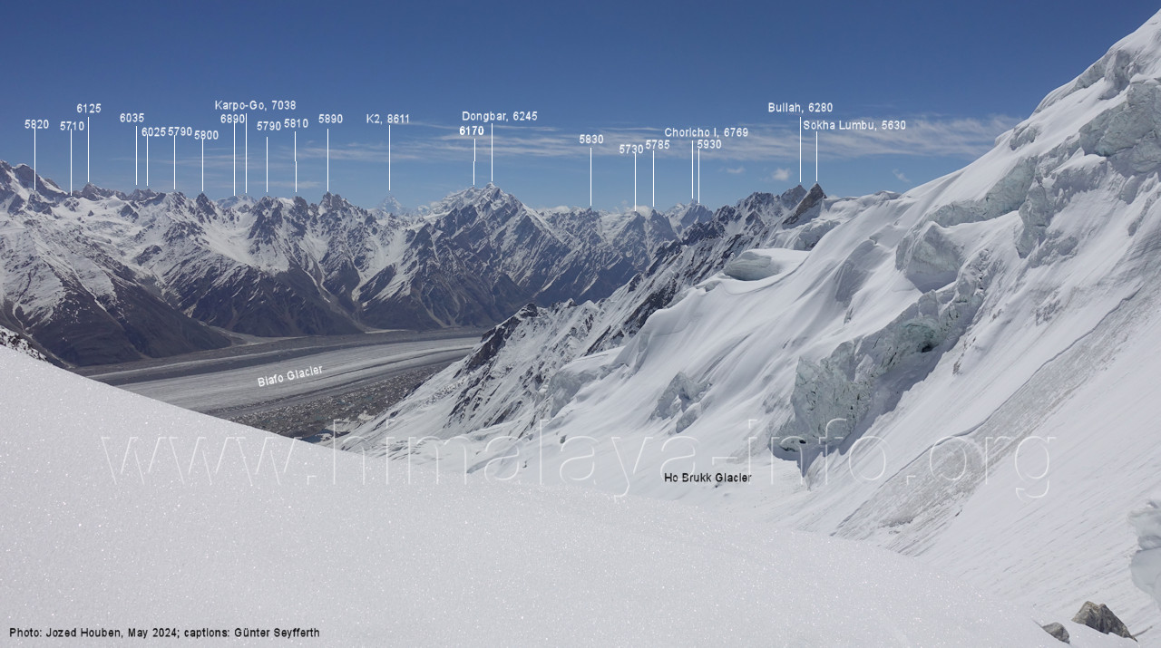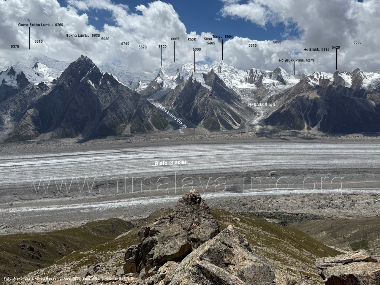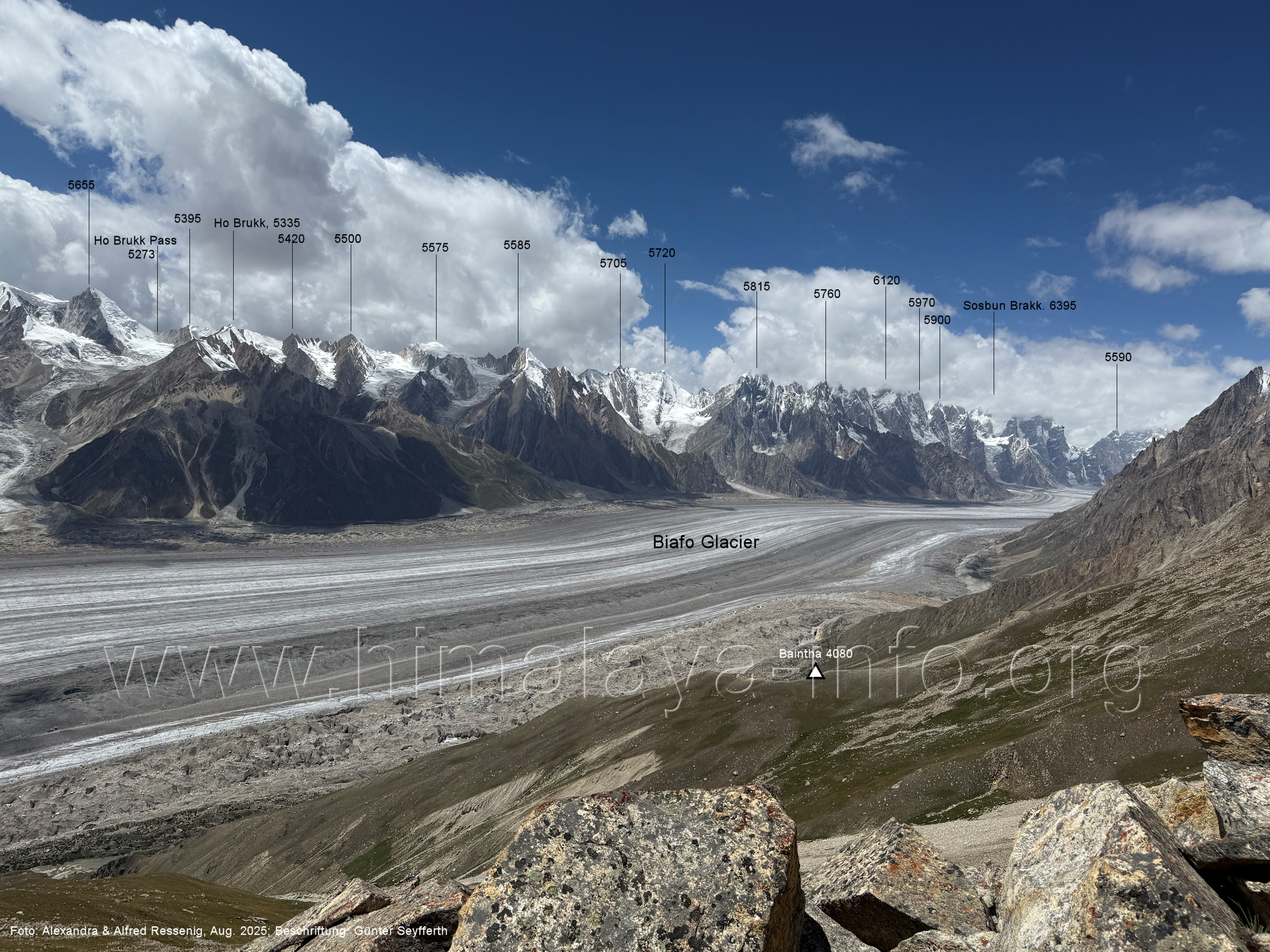 gegenüberstehenden Bergkette. Foto: Alexandra & Alfred Ressenig, Aug. 2025; Beschriftung: Günter Seyfferth (55) Blick vom Camp 4030 am Nordostrand des Biafo-Gletschers nach Südwesten zum Tongo (5904 m) Der Peak 5485 steht am Südrand des Ho Brukk-Gletschers. Foto: Alexandra & Alfred Ressenig, Aug. 2025; Beschriftung: Günter Seyfferth (56) Tele-Blick vom Hang am Nordostrand des Biafo-Gletschers nach Südwesten zum Peak 5655 und Ho Brukk-Pass (5273 m) Foto: Alexandra & Alfred Ressenig, Aug. 2025; Beschriftung: Günter Seyfferth (57) Tele-Blick vom Hang am Nordostrand des Biafo Gletschers nach Westen Diese Gipfel stehen über dem namenlosen Gletscher nördlich des Ho Brukk (5335 m). Foto: Alexandra & Alfred Ressenig, Aug. 2025; Beschriftung: Günter Seyfferth (58) Blick vom Camp 4030 am Nordostrand des Biafo-Gletschers nach Nordwesten zum Sosbun Brakk (6395 m)