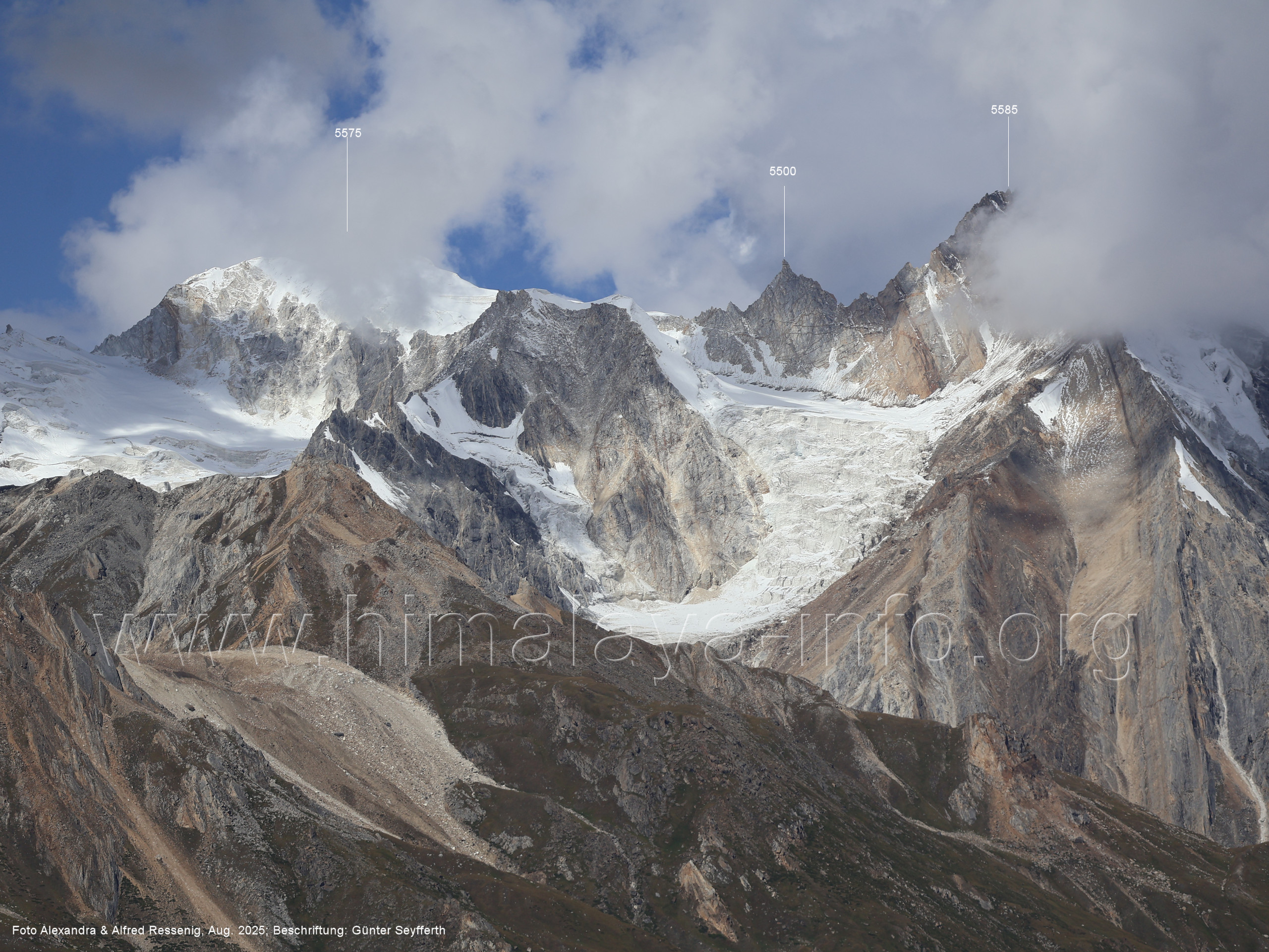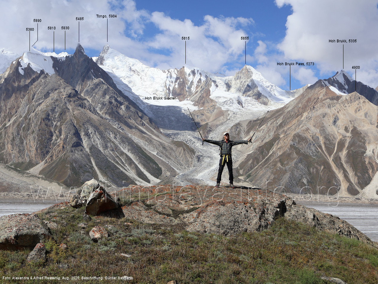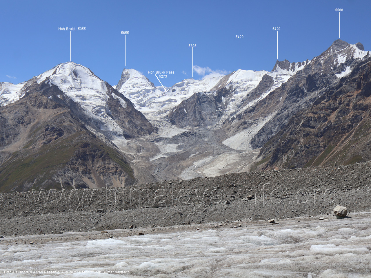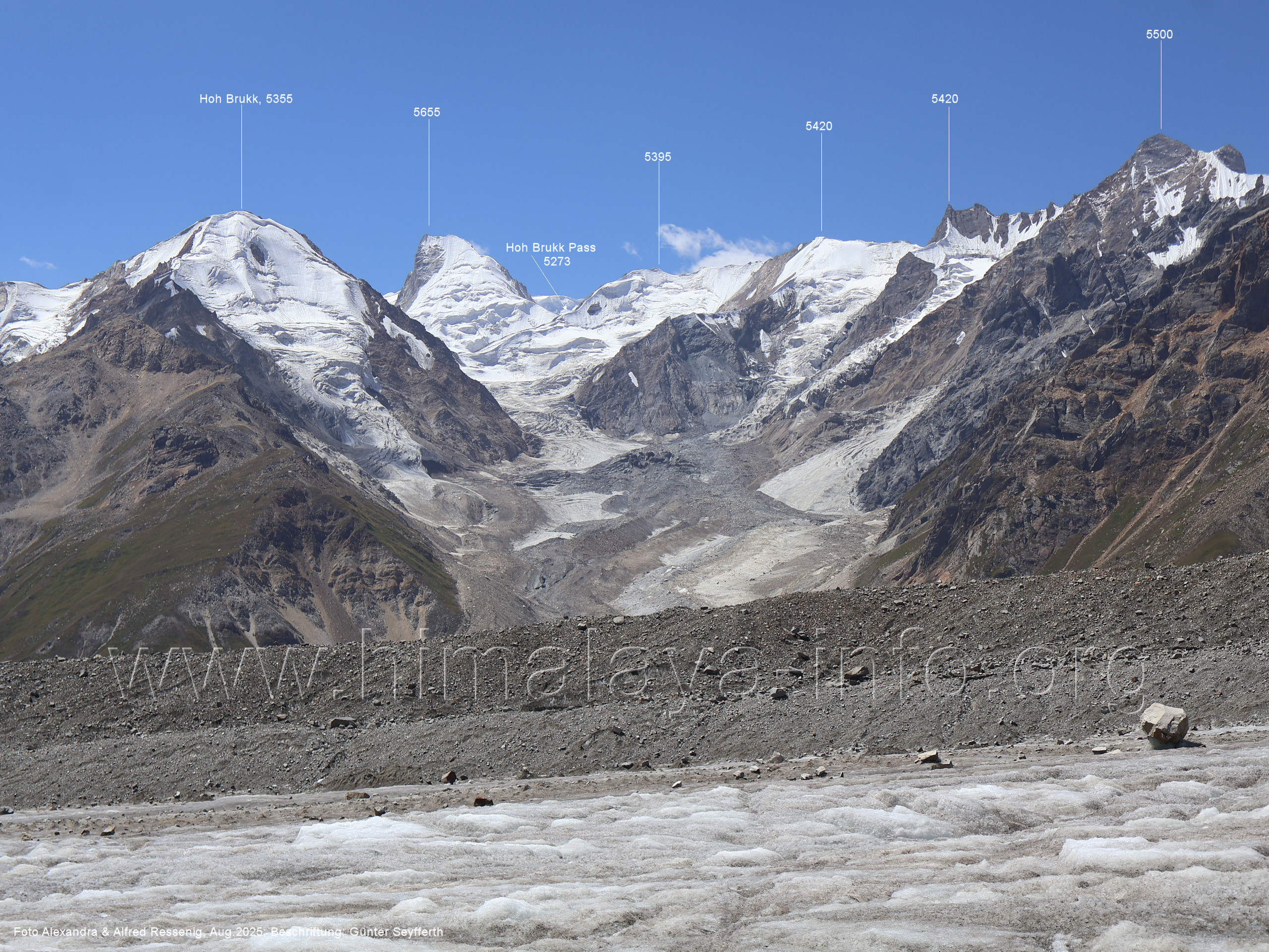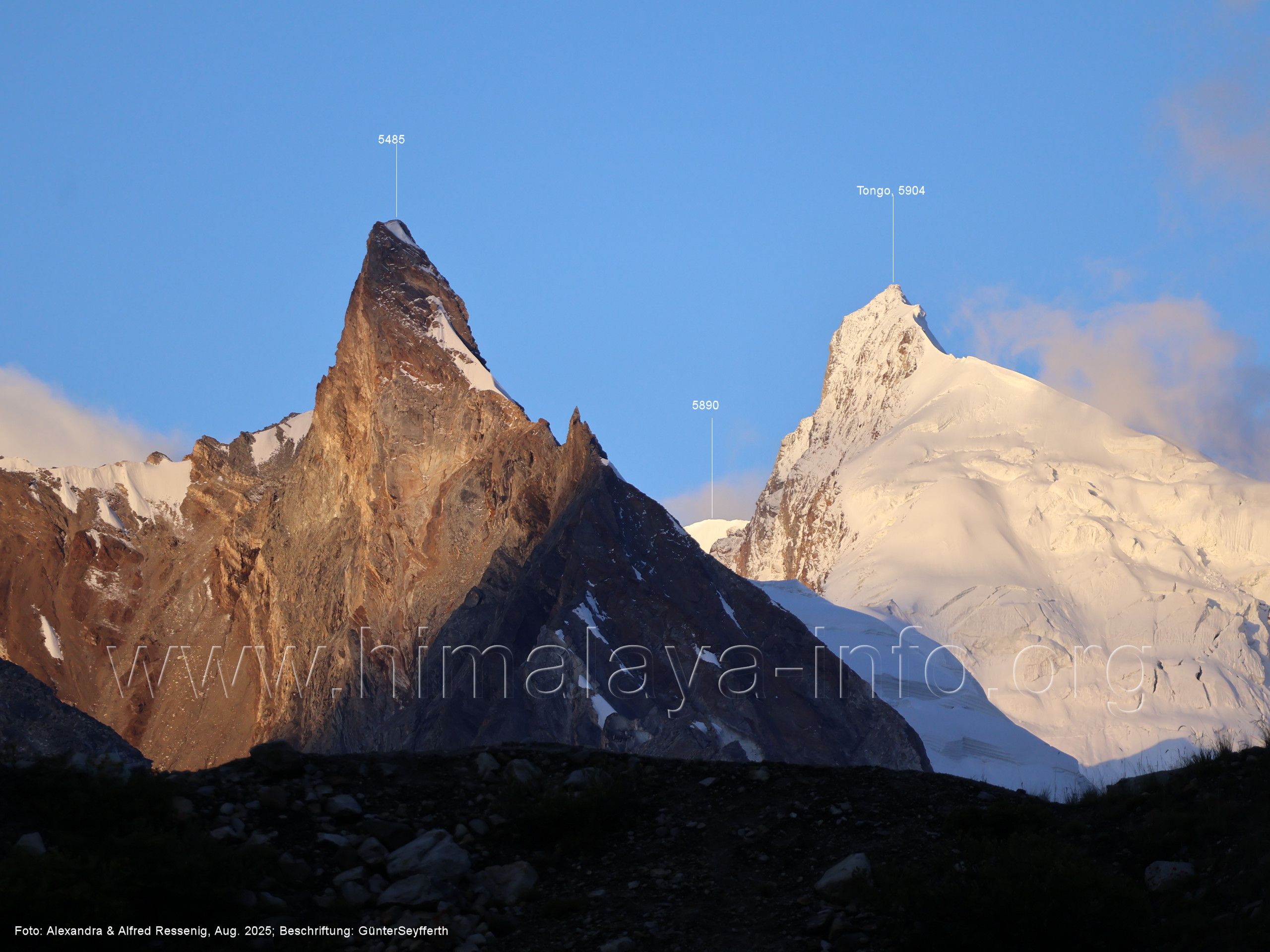 gegenüberstehenden Bergkette. Foto: Alexandra & Alfred Ressenig, Aug. 2025; Beschriftung: Günter Seyfferth (55) Blick vom Camp 4030 am Nordostrand des Biafo-Gletschers nach Südwesten zum Tongo (5904 m) Der Peak 5485 steht am Südrand des Ho Brukk-Gletschers. Foto: Alexandra & Alfred Ressenig, Aug. 2025; Beschriftung: Günter Seyfferth (56) Tele-Blick vom Hang am Nordostrand des Biafo-Gletschers nach Südwesten zum Peak 5655 und Ho Brukk-Pass (5273 m) Foto: Alexandra & Alfred Ressenig, Aug. 2025; Beschriftung: Günter Seyfferth (57) Tele-Blick vom Hang am Nordostrand des Biafo Gletschers nach Westen Diese Gipfel stehen über dem namenlosen Gletscher nördlich des Ho Brukk (5335 m). Foto: Alexandra & Alfred Ressenig, Aug. 2025; Beschriftung: Günter Seyfferth (58) Blick vom Camp 4030 am Nordostrand des Biafo-Gletschers nach Nordwesten zum Sosbun Brakk (6395 m)