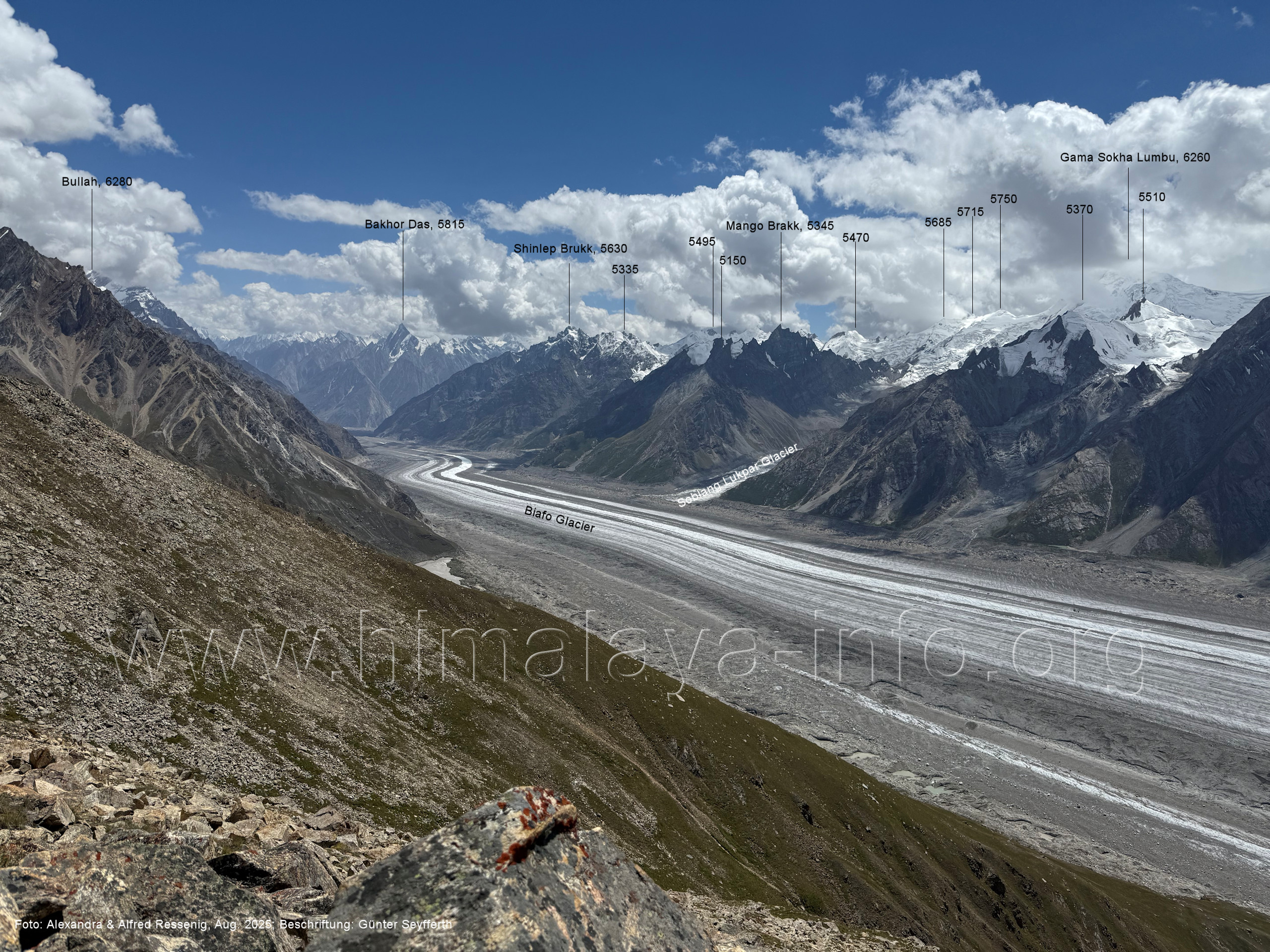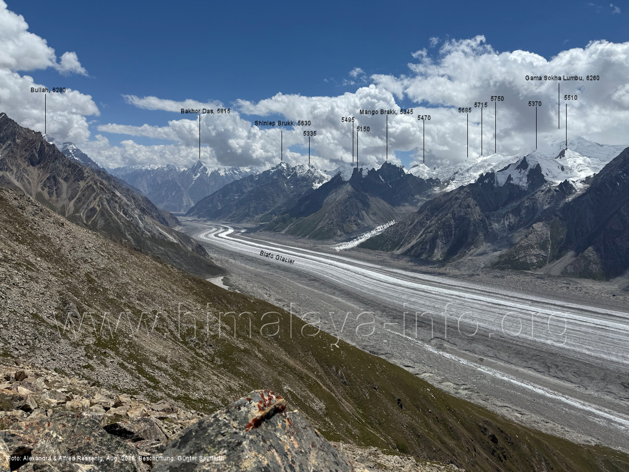 des Biafo-Gletschers. Foto: Alexandra & Alfred Ressenig, Aug. 2025; Beschriftung: Günter Seyfferth (163) Blick vom Lagerplatz Uzun (4310 m) nach West- Nordwesten zum Sosbun Brakk (6395 m) Foto: Shahid Durrani, flickr.com, Aug. 2016; Beschriftung: Günter Seyfferth Unmittelbat über dem Lagerplatz Uzun ragt der Peak 5550 in den Himmel: (164) Rückblick vom Biafo Gletscher nach Uzun mit Peak 5550
