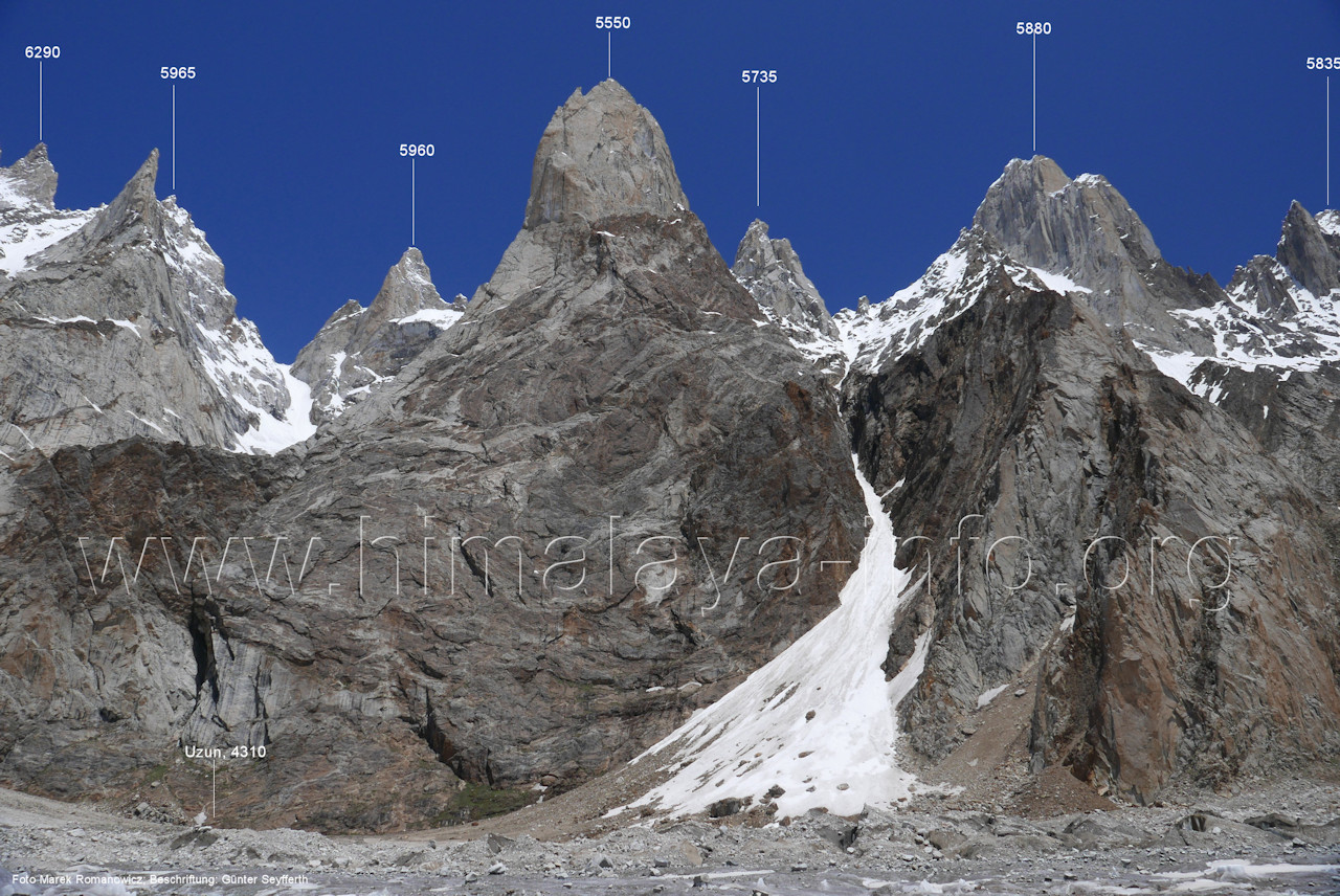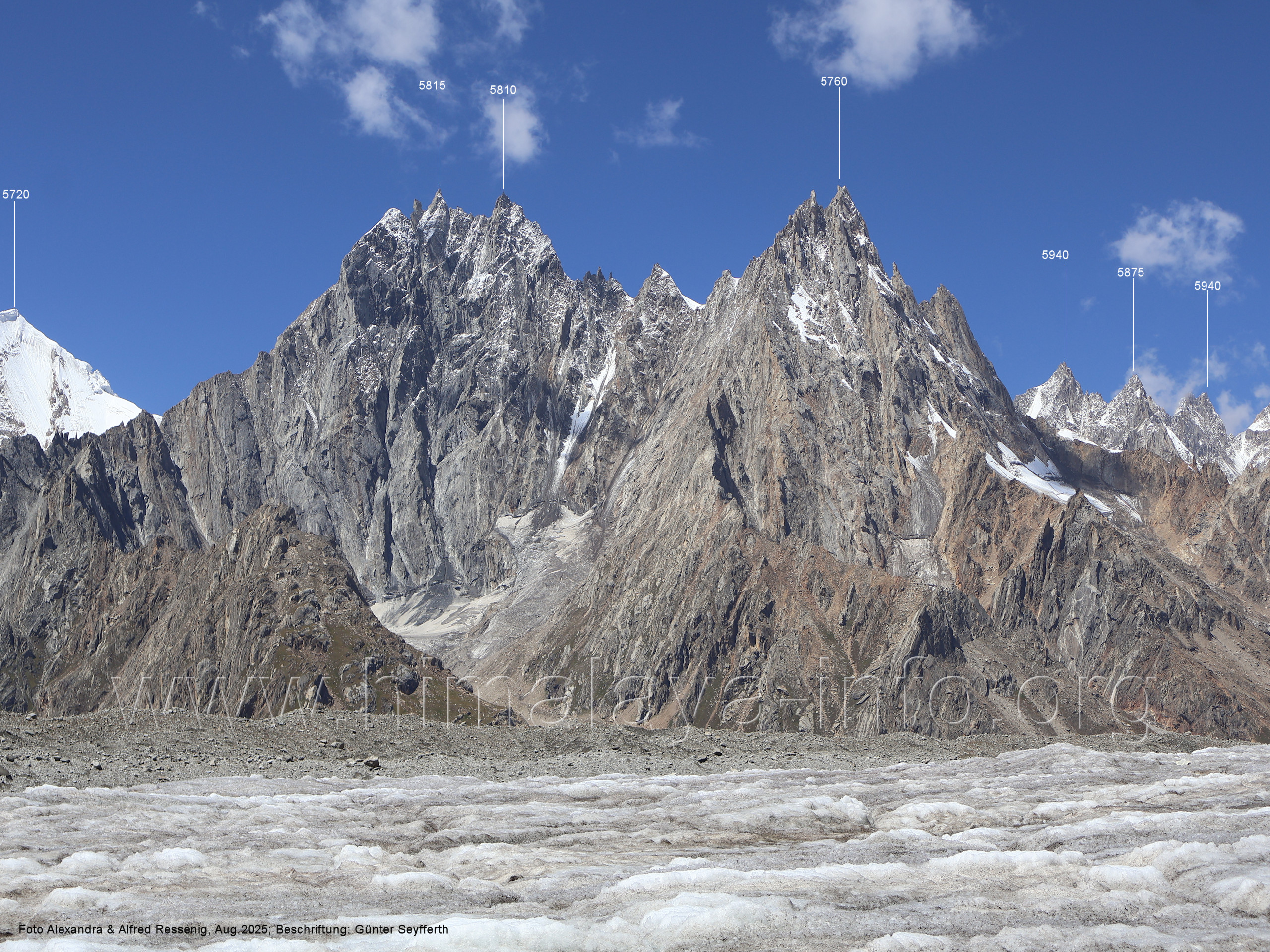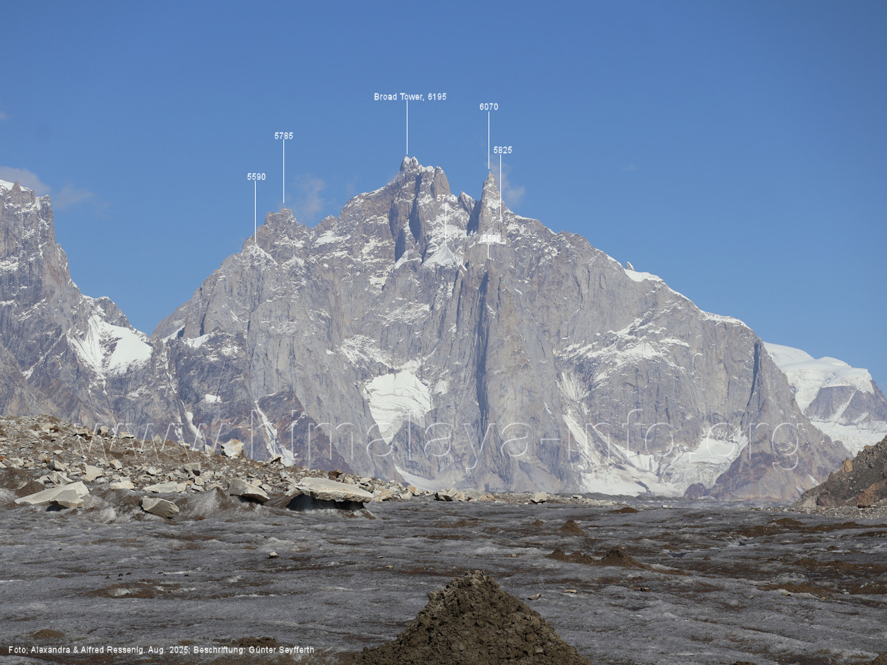 Hinter den markanten Feslzinnen in Bildmitte liegt der Ghur-Gletscher. Foto: Alexandra & Alfred Ressenig, Aug. 2025; Beschriftung: Günter Seyfferth (160) Blick beim Aufbruch in Uzun (4310 m) nach Westen zur Bergkette am Südwestrand des Biafo-Gletschers Links sieht man den Peak 5760, der auf Bild Nr. 159 in Bildmitte zu sehen ist. Foto: Alexandra & Alfred Ressenig, Aug. 2025; Beschriftung: Günter Seyfferth Das folgende Bild zeiugt die Gipfel rechts der Bildmitte im Detail: (161) Blick von Uzun (4310 m) nach Westen Foto: Alexandra & Alfred Ressenig, Aug. 2025; Beschriftung: Günter Seyfferth Die vorstehenden Gipfel swie Sosbun Brakk und Broad Tower zeigt das folgende Bild: (162) Blick von der Randmoräne des Biafo-Gletschers