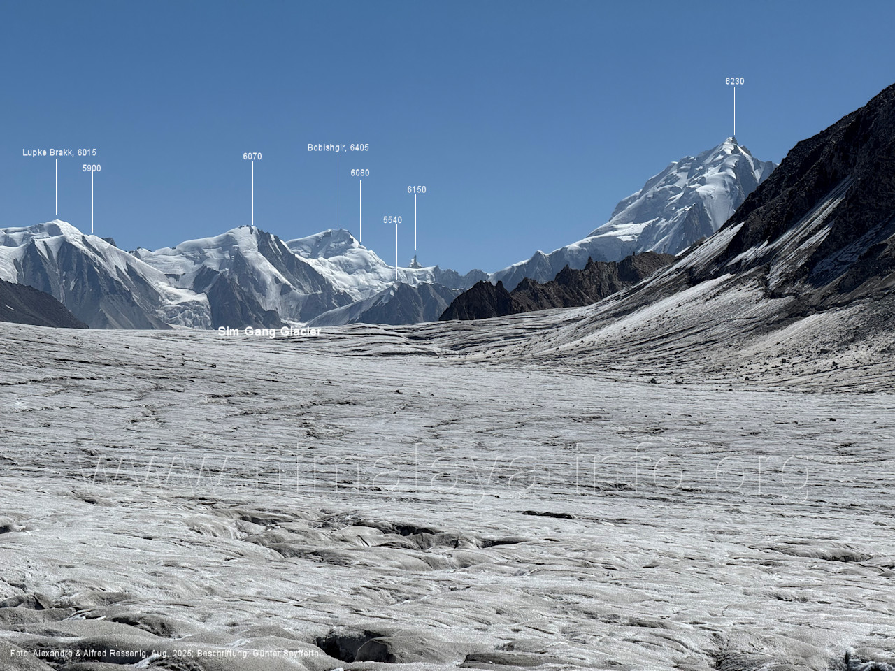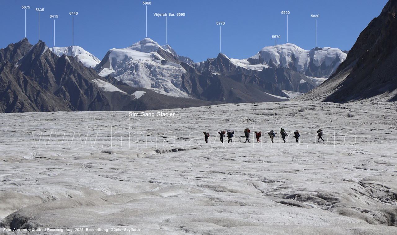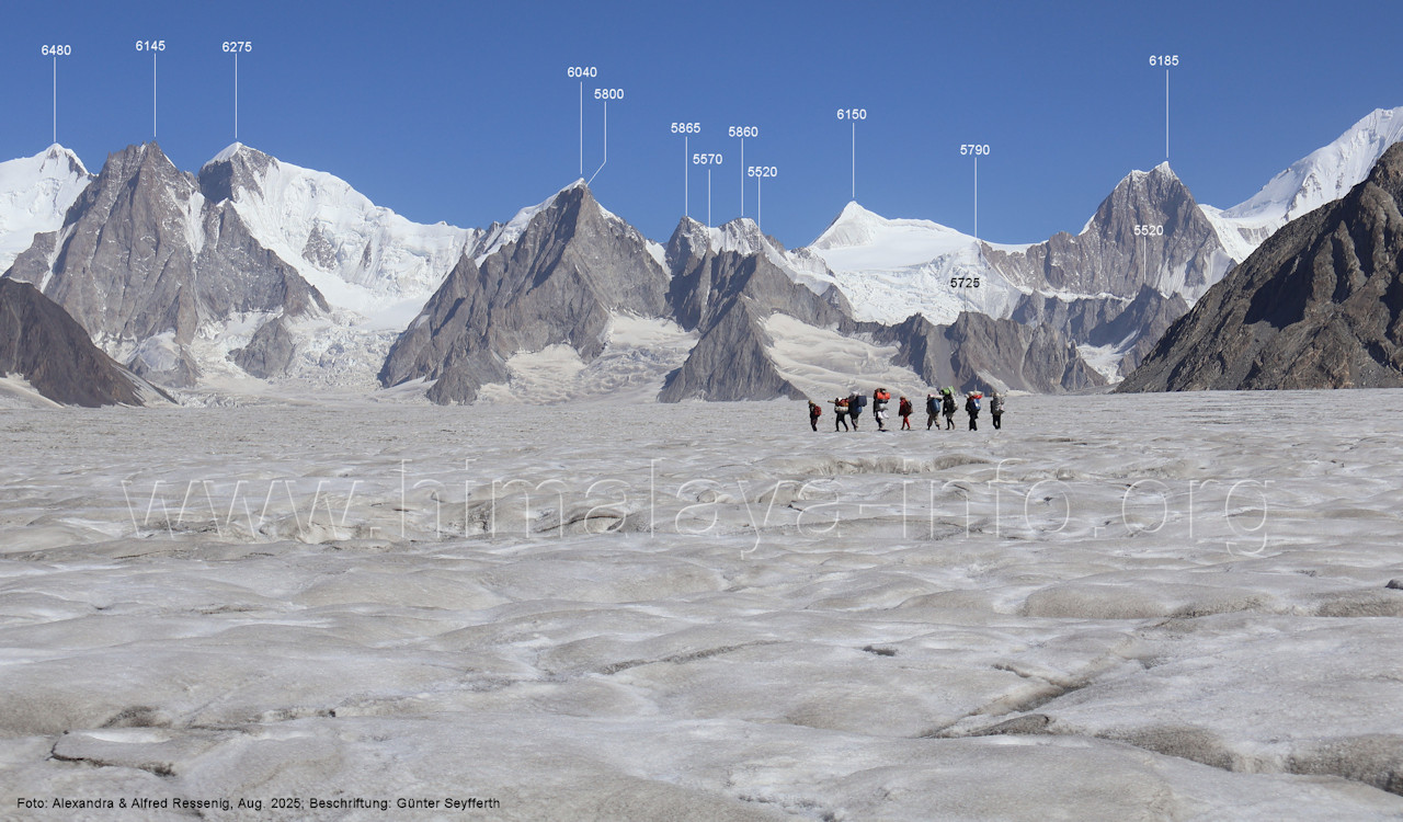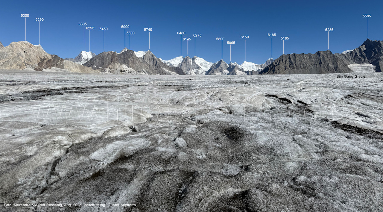 Teile der Bergkette zu sehen, (214) Blick vom westlichen Snow Lake nach Nordosten zum Peak 5960 Der Virjerab Sar (6590 m) steht weiter entfernt am Nordosterand des Snow Lake. Foto: Alexandra & Alfred Ressenig, Aug. 2025; Beschriftung: Günter Seyfferth (215) Blick vom westlichen Snow Lake in ca. 4750 m Höhe nach Nordosten zum Peak 5920 Foto: Alexandra & Alfred Ressenig, Aug. 2025; Beschriftung: Günter Seyfferth Der Standort bei der folgenden Aufnahme war weiter nördlich, gegenüber dem Hispar La: (216) Blick vom westlichen Snow Lake in ca. 4800 m Höhe nach Osten entlang des Sim Gang-Gletschers Man siehz die Gipfel am Ostrand des Snow Lake zwischen dem Lukpe Brakk (6015 ) und dem Baintha Brakk (7270 m, außerhalb des rechten Bildrrands). Foto: Alexandra & Alfred Ressenig, Aug. 2025; Beschriftung: Günter Seyfferth