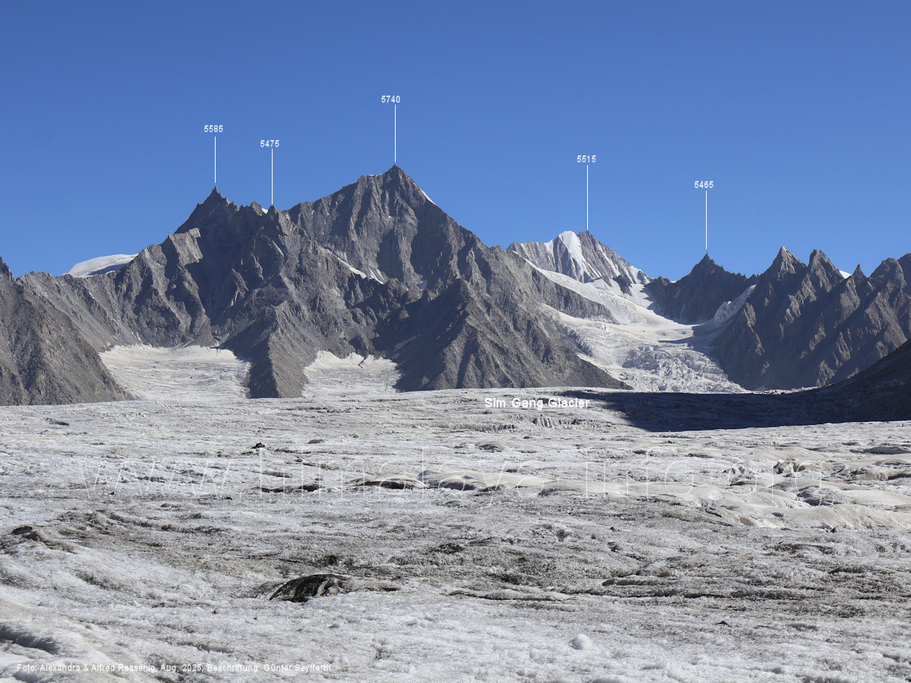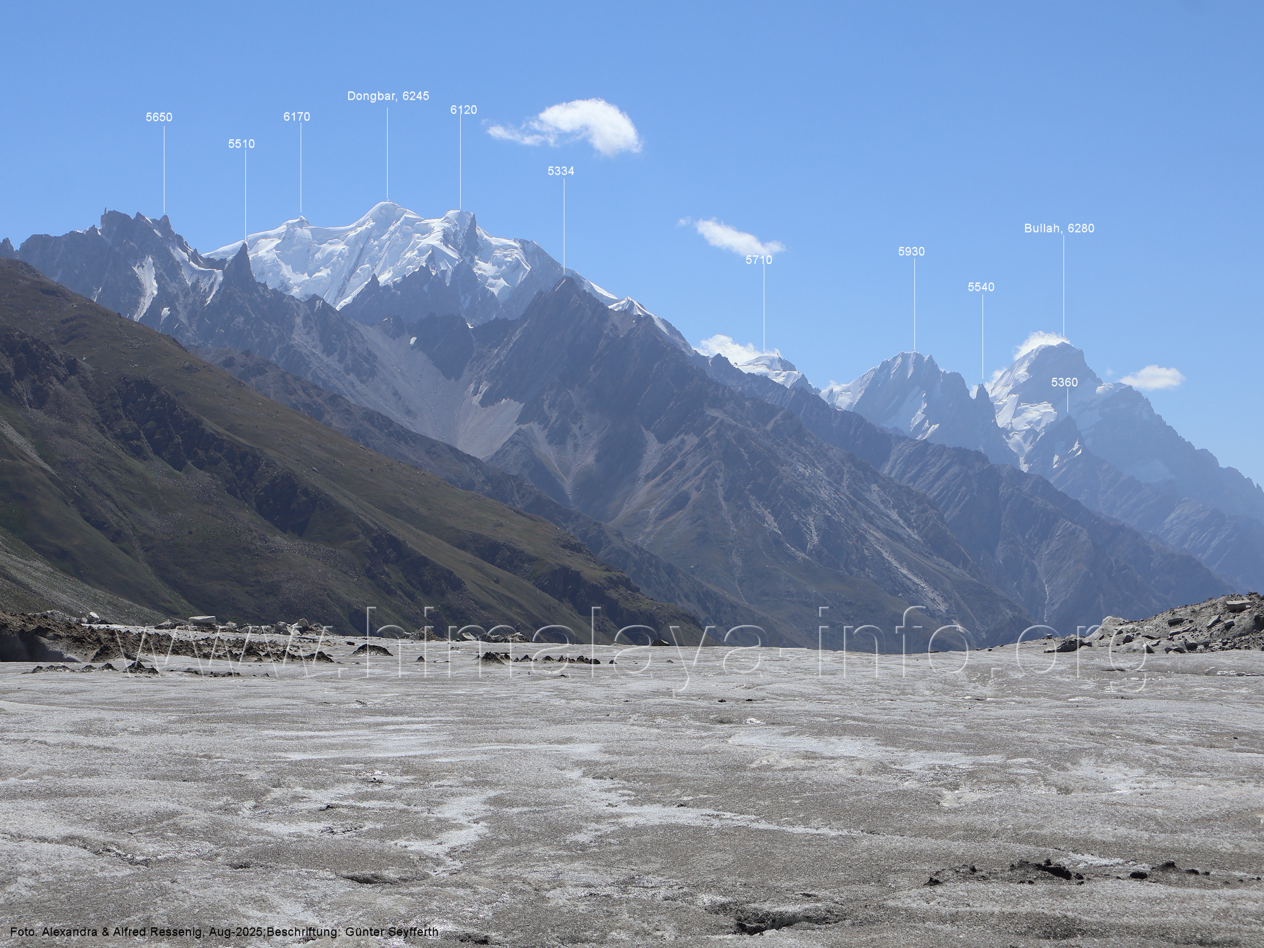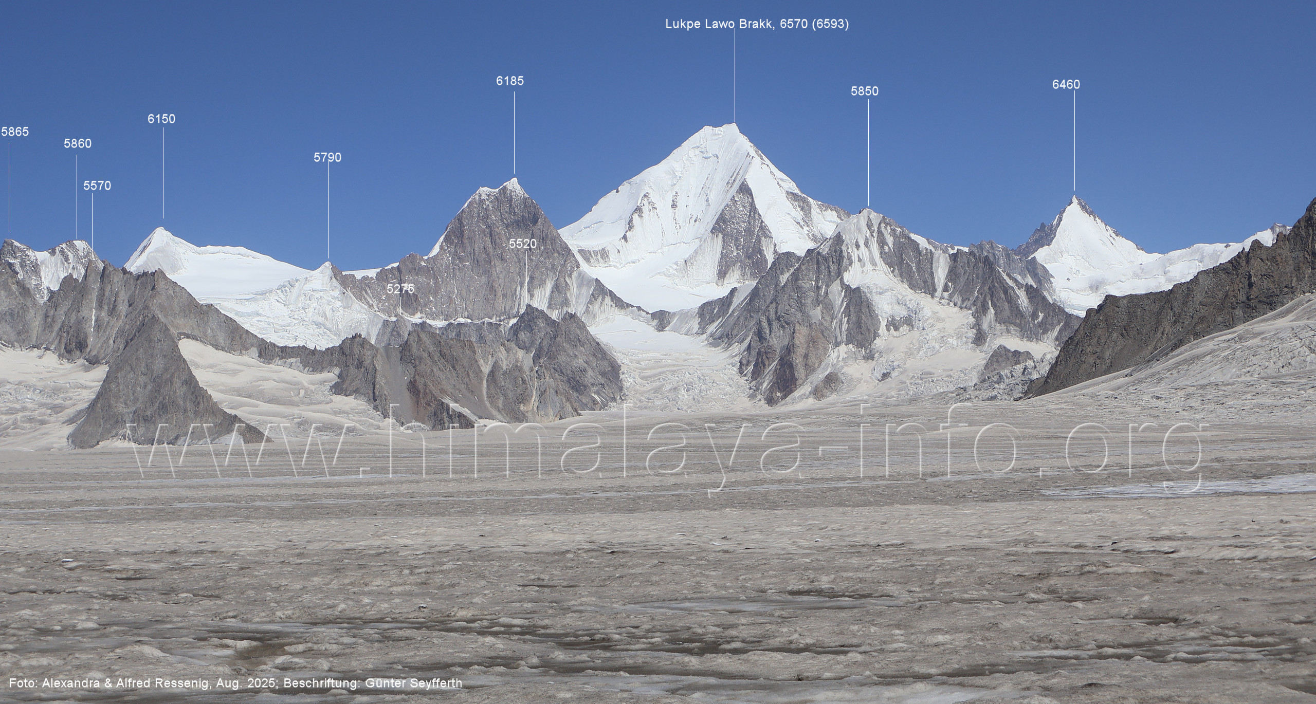 Teile der Bergkette zu sehen, (214) Blick vom westlichen Snow Lake nach Nordosten zum Peak 5960 Der Virjerab Sar (6590 m) steht weiter entfernt am Nordosterand des Snow Lake. Foto: Alexandra & Alfred Ressenig, Aug. 2025; Beschriftung: Günter Seyfferth (215) Blick vom westlichen Snow Lake in ca. 4750 m Höhe nach Nordosten zum Peak 5920 Foto: Alexandra & Alfred Ressenig, Aug. 2025; Beschriftung: Günter Seyfferth Der Standort bei der folgenden Aufnahme war weiter nördlich, gegenüber dem Hispar La: (216) Blick vom westlichen Snow Lake in ca. 4800 m Höhe nach Osten entlang des Sim Gang-Gletschers Man siehz die Gipfel am Ostrand des Snow Lake zwischen dem Lukpe Brakk (6015 ) und dem Baintha Brakk (7270 m, außerhalb des rechten Bildrrands). Foto: Alexandra & Alfred Ressenig, Aug. 2025; Beschriftung: Günter Seyfferth