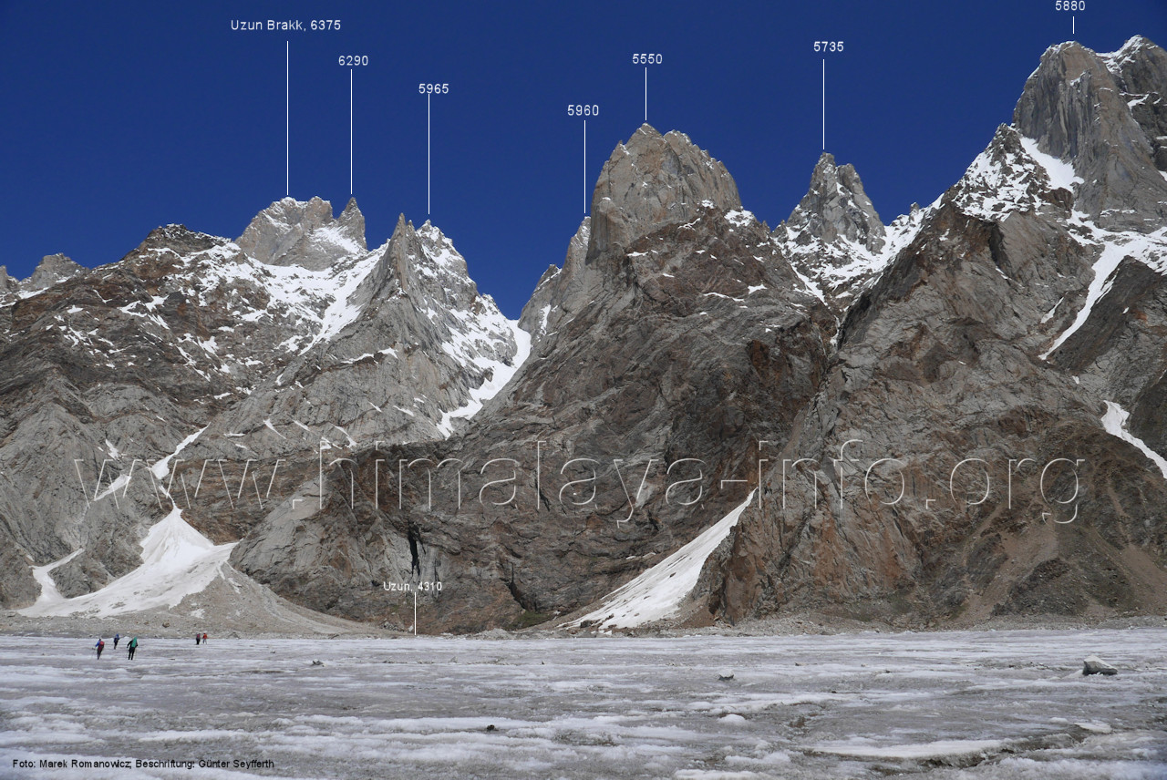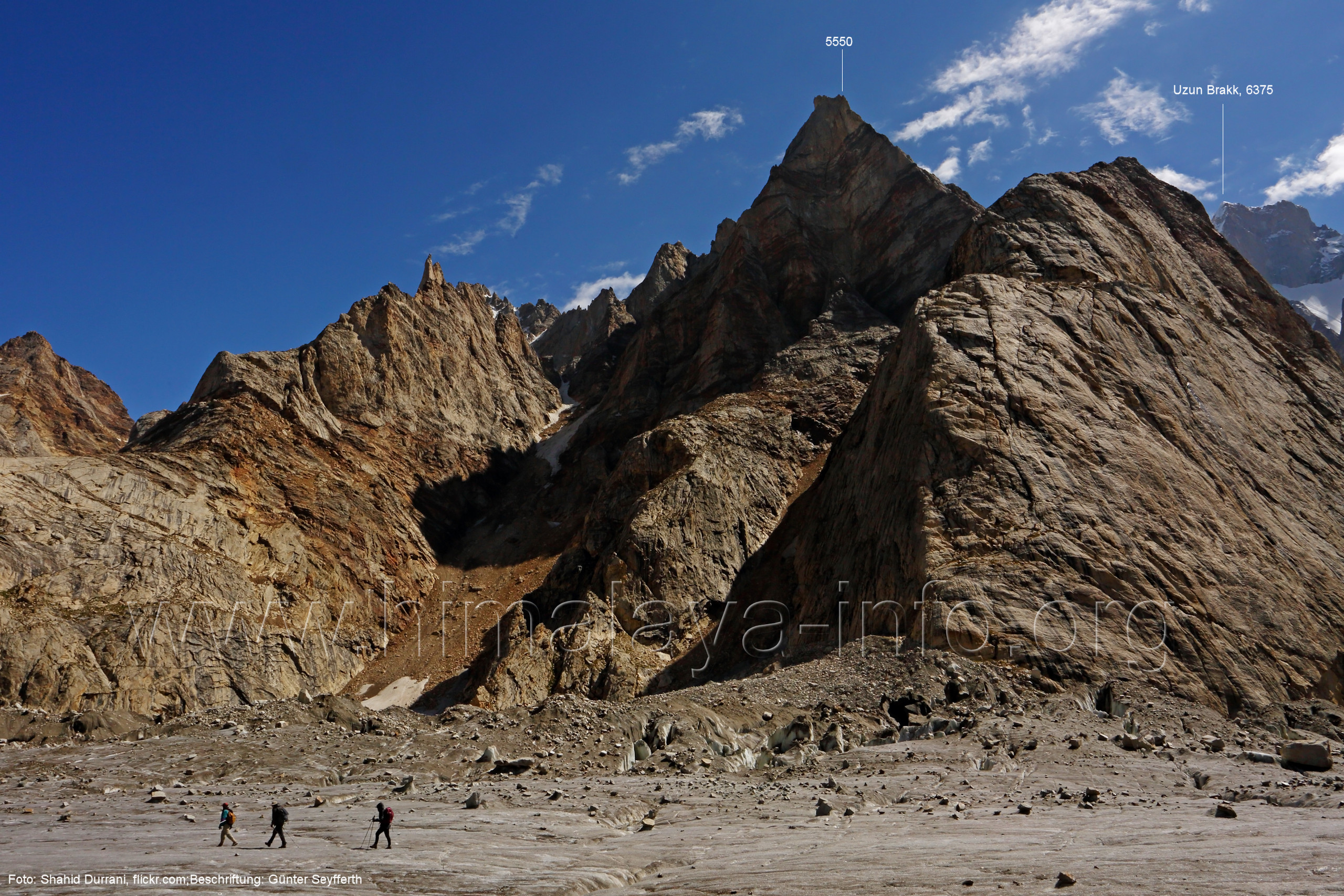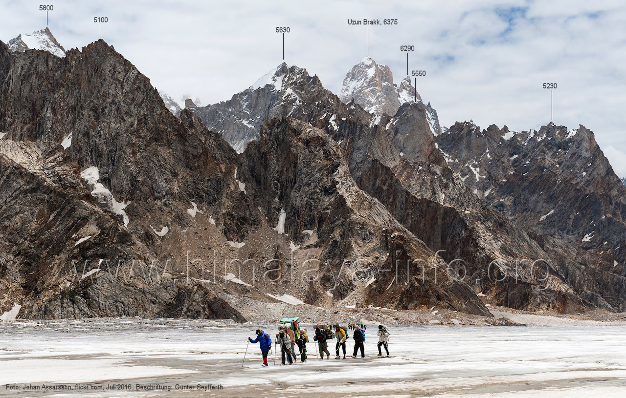 Biafo-Gletscher zu sehen. Foto: unbekannt, Juli 2007; Beschriftung: Günter Seyfferth (21) Erster Blick zwischen Namla und Mango zum Uzun Brakk (6375 m) im Nordwesten Foto: Paul Boslooper, flickr.com, Aug. 2010; Beschriftung: Günter Seyfferth
