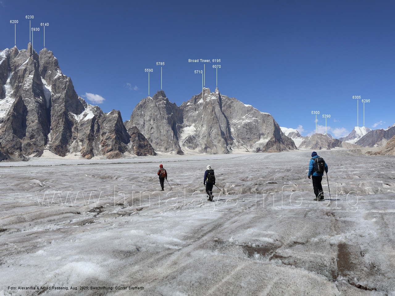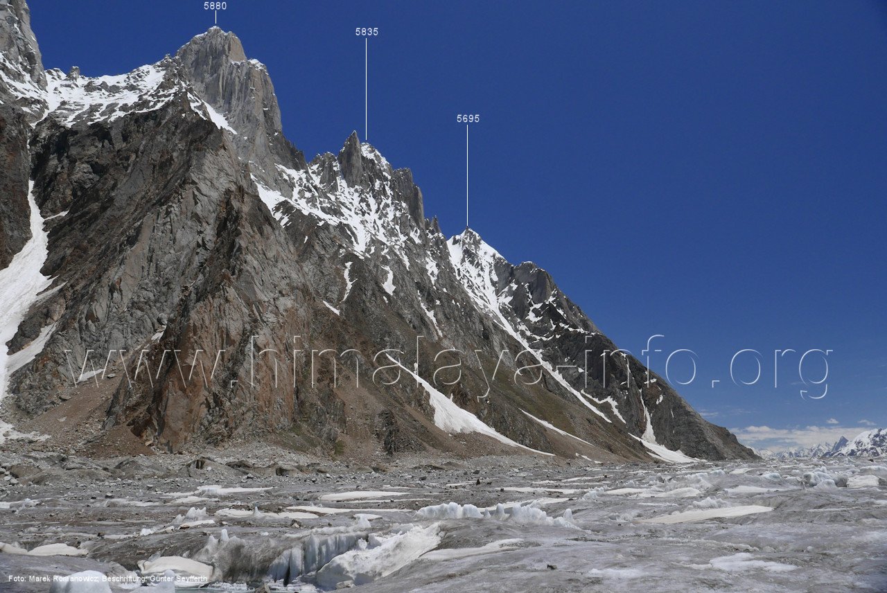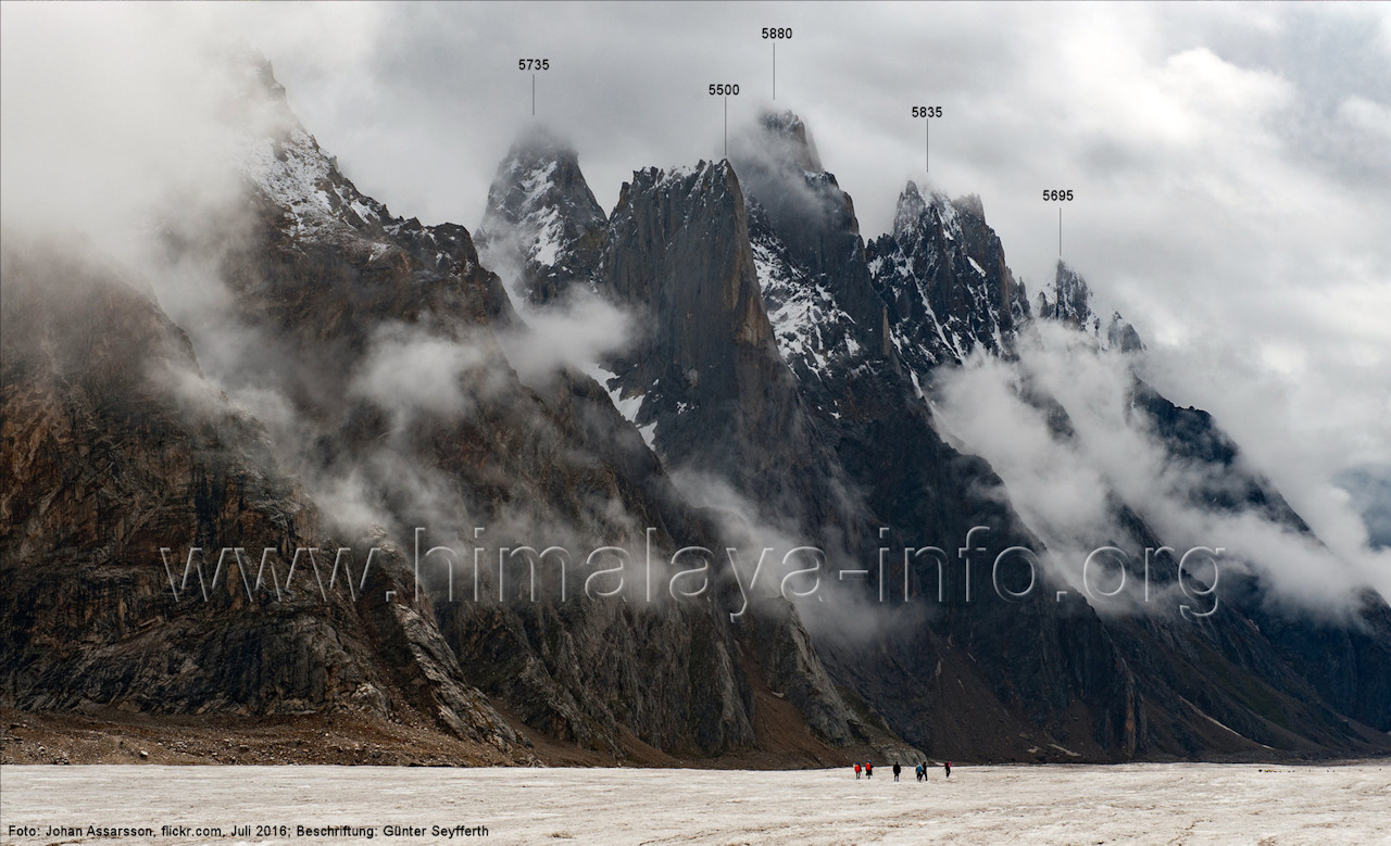 Gipfel 5760 und 5815, Foto: Paul Boslooper, flickr.com, Aug. 2010; Beschriftung: Günter Seyfferth (199) Blick aus ca. 4680 m Höhe nach Westen zum Broad Tower (6195 m) Rechts sind schon die Solu Towers zu sehen; der Fotograf steht am Übergang zum Snow Lake. Foto: Shahid Durrani, flickr.com, Aug. 2016; Beschriftung: Günter Seyfferth