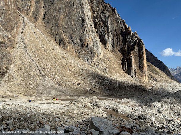 einzige Platz am unteren Biafo-Gletscher, Foto: Marek Romanovic, Juli 2019z; Beschriftung: Günter Seyfferth
