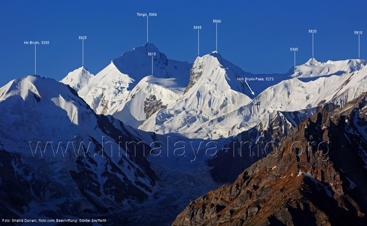nach Süden Bild Nr. 158 zeigt die Bildmitte im Detail. Foto: Johan Assarsson, flick.com, Juli 2016; Beschriftung: Günter Seyfferth (156) Tele-Blick von Uzun (4310 m) nach Süden mit Sokha Lumbu ( 5630 m) und Gama Sokha Lumbu (6260 m) Foto: Alexandra & Alfred Ressenig, Aug. 2025; Beschriftung: Günter Seyfferth (157) Tele-Blick von Uzun (4310 m) nach Süden zum Gama Sokha Lumbu (6260 m) Dieses Foto wurde bei idealem Sonnenstand aufgenommen. Licht und Schatten machen alle Details der Hanfstrukturen erkennbar. Foto: Alexandra & Alfred Ressenig, Aug. 2025; Beschriftung: Günter Seyfferth (158) Tele-Blick vom Rastplatz Uzun (4310 m) nach Süden zum Ho Brukk (5335 m) und Tongo (5904 m) Das Bild zeigt die Mitte von Bild Nr. 154. Die Lage des Hoh Brukk-Passes nördlich des P 5655 ist hier markiert. Foto: Shahid Durrani, flickr.com, Aug. 2016; Beschriftung: Günter Seyfferth (159) Blick von Uzun (4310 m) nach Südwesten bis Westen