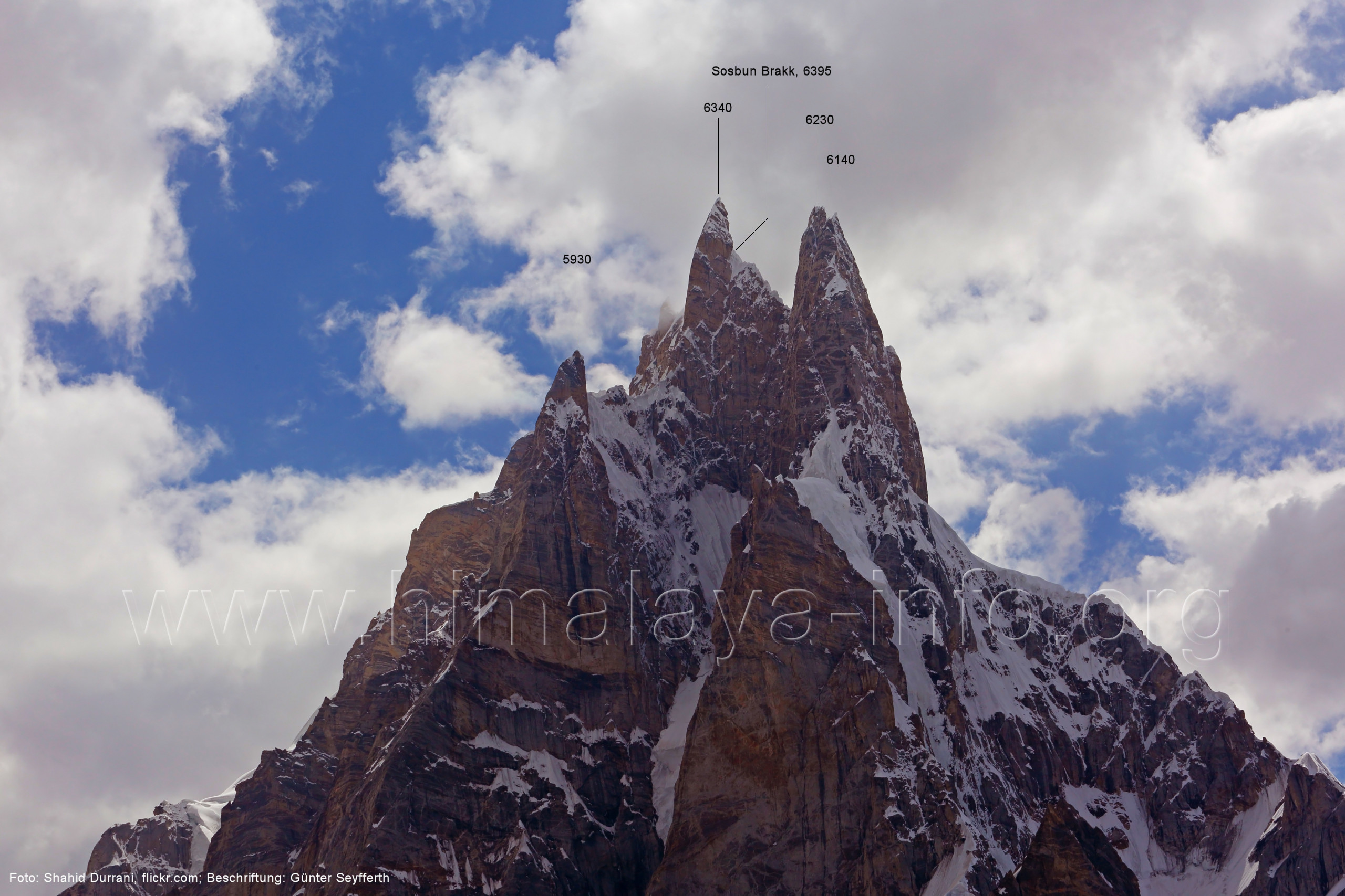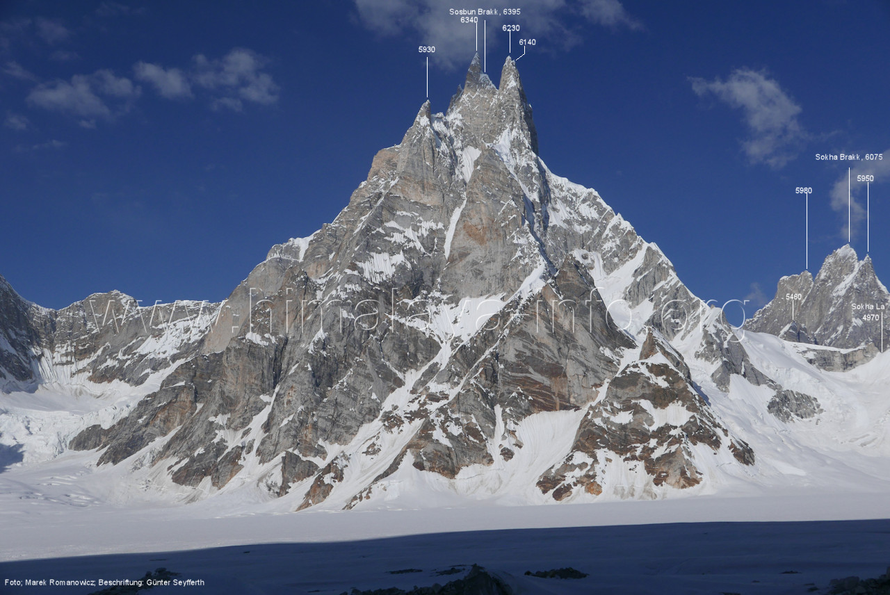 deshalb im Blick nach oben vergleichsweise niedrig. Foto: unbekannt; Beschriftung: Günter Seyfferth (188) Blick vom Lagerplatz 4600 auf dem Biafo-Gletscher nach Südwesten zum Sosbun Brakk (6395 m) und Sokha Brakk (6075 m) Foto: Marek Romanovicz; Beschriftung: Günter Seyfferth (189) Blick vom Lagerplatz 4600 auch dem Bisfo-Gletscher zum Gipfel des Sosbun Brakk (6395 m) Der Hauptgipfel ist nur zu erahnen. Zur richtigen Deutung dieser Sicht braucht man den Seitenblick wie auf Bild Nr. 163 oder Bild Nr. 177. Foto: Shahid Durrani, flickr.com; Beschriftung: Günter Seyfferth (190) Blick bi Sonnenaufgang vom Lagerplatz 4600 auf derm Biafo-Gletscher nach Südwesten zum Sokha Brakk (6075 m)