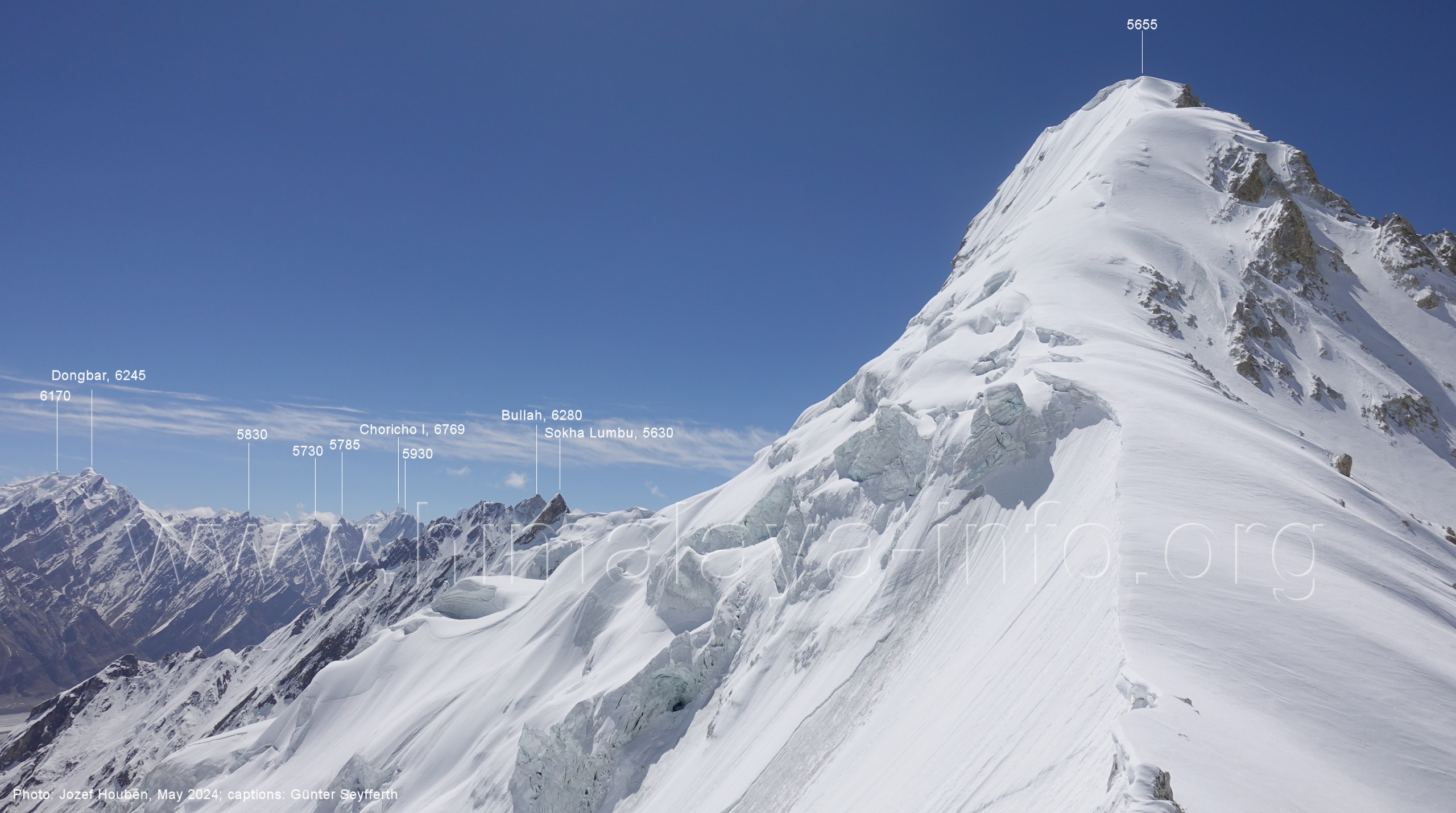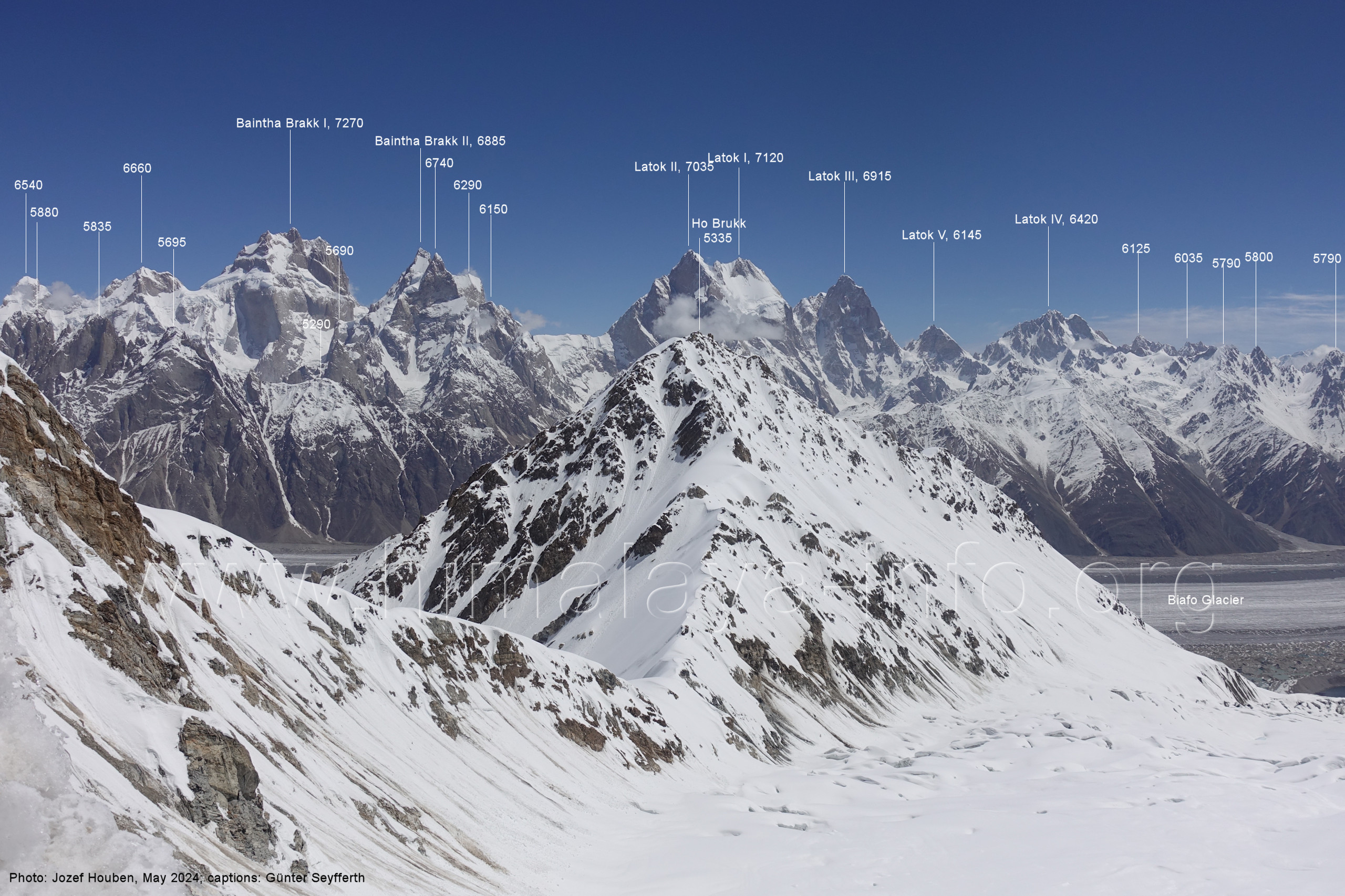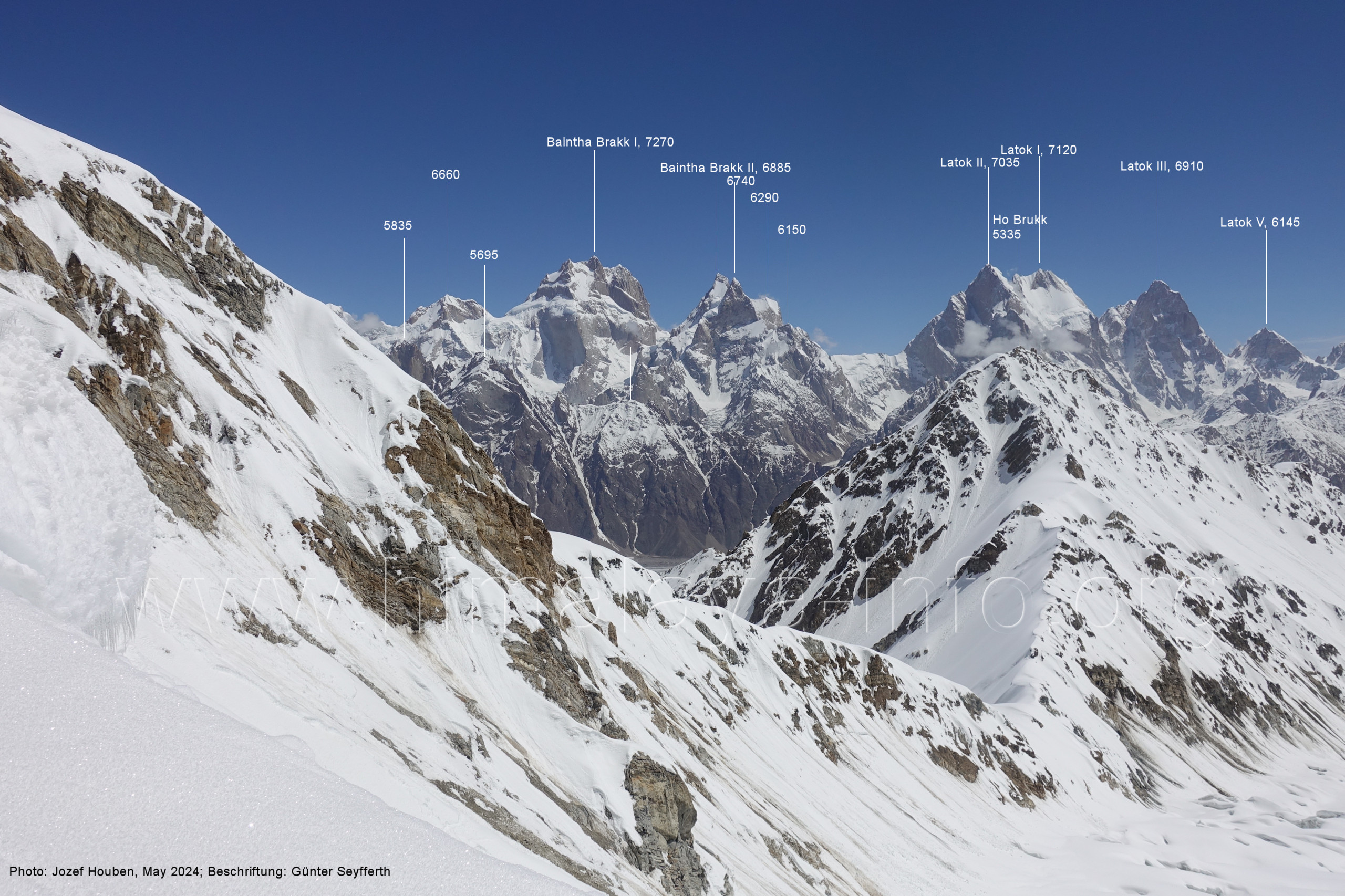 den Luftbildern am Beginn der Beschreibung. Der Baintha Brakk I ist der höchste Gipfel dieser Region im Zentrum des Karakorum. Foto: Jozef Houben, Mai 2024; Beschriftung: Günter Seyfferth