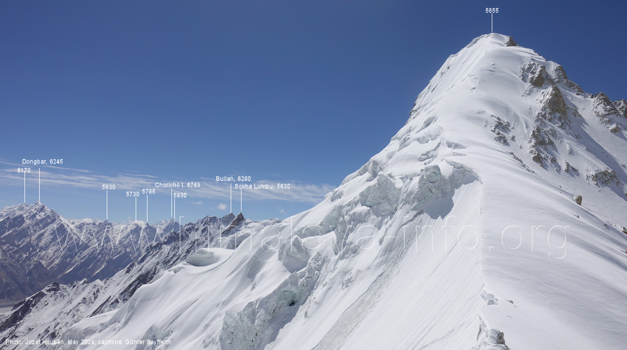 Sicht vom gegenüber liegenden Talhang. Foto: Jozef Houben, Mai 2024; Beschriftung: Günter Seyfferth (60) Blick vom Ho Brukk-Pass (5273 m) nach Osten