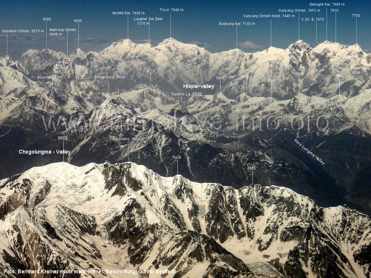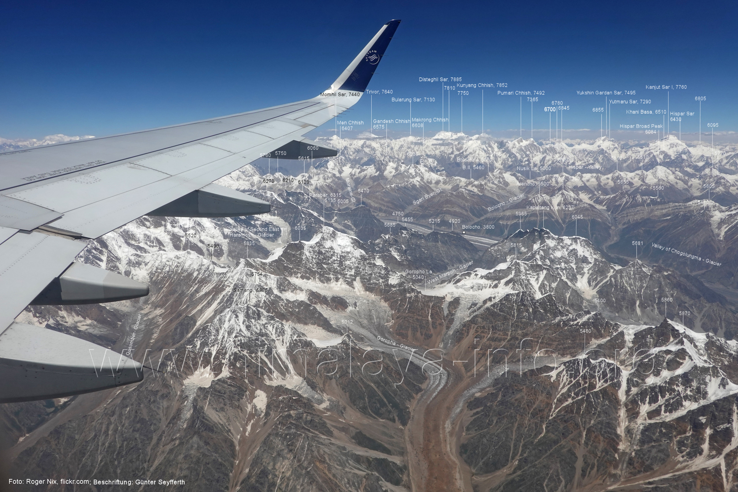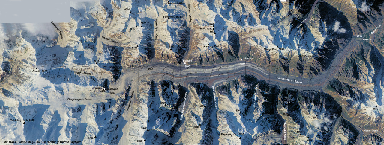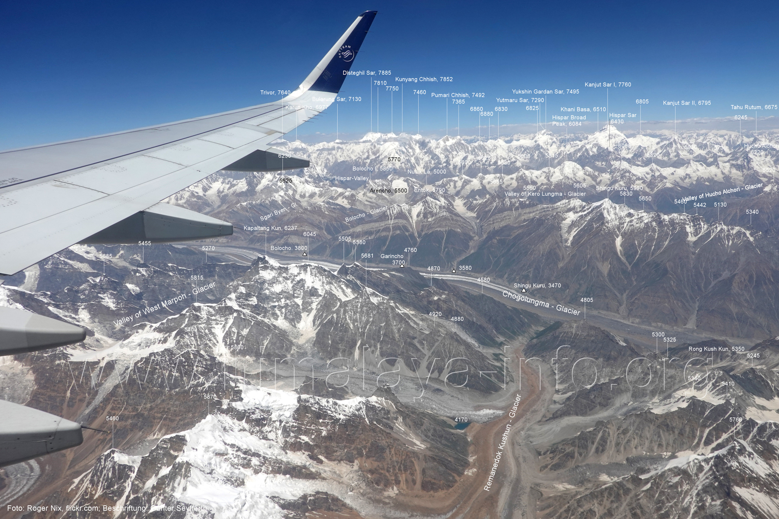 Kero Lungma (Bild Nr. 12); das am Nushik La (Bildmitte) beginnt. Foto: Roger Nix, flickr.com; Beschriftung: Günter Seyfferth (6) Luftbild von Süden zum mittleren Abschnitt des Chogolungma-Gletschers und zum Hispar Muztagh
