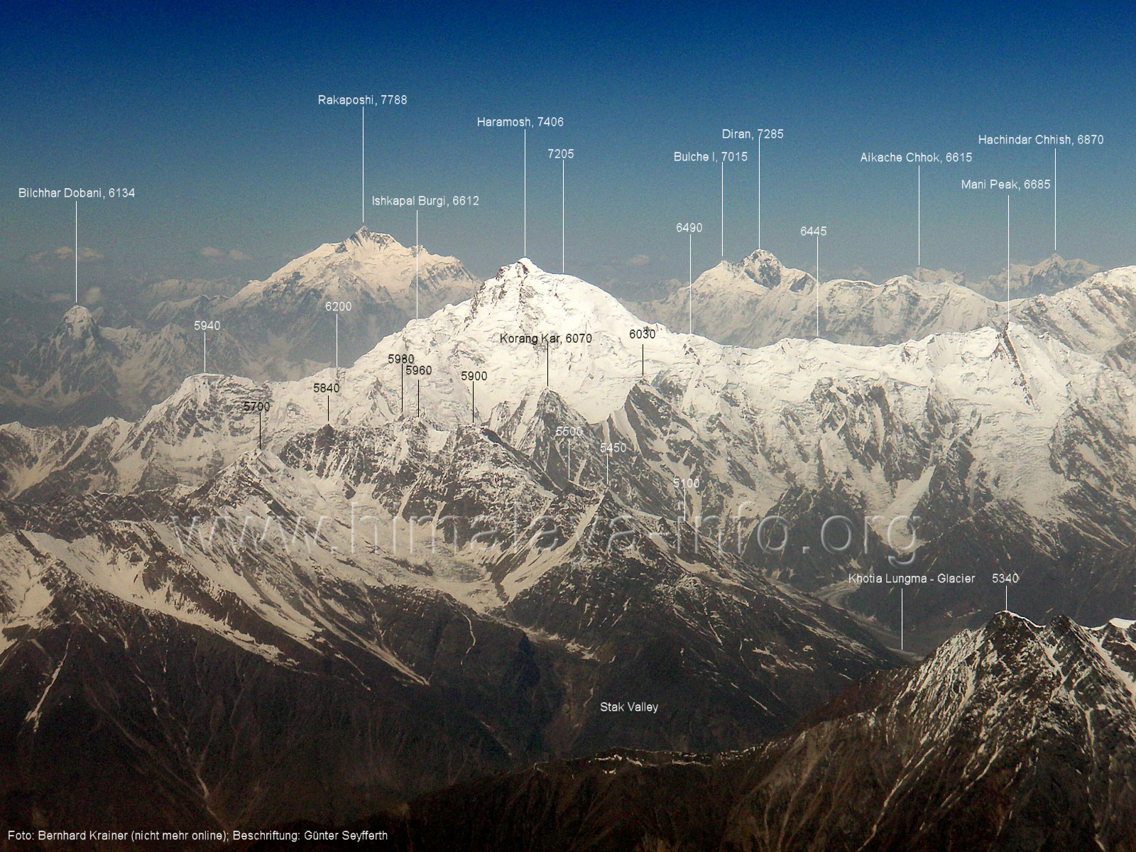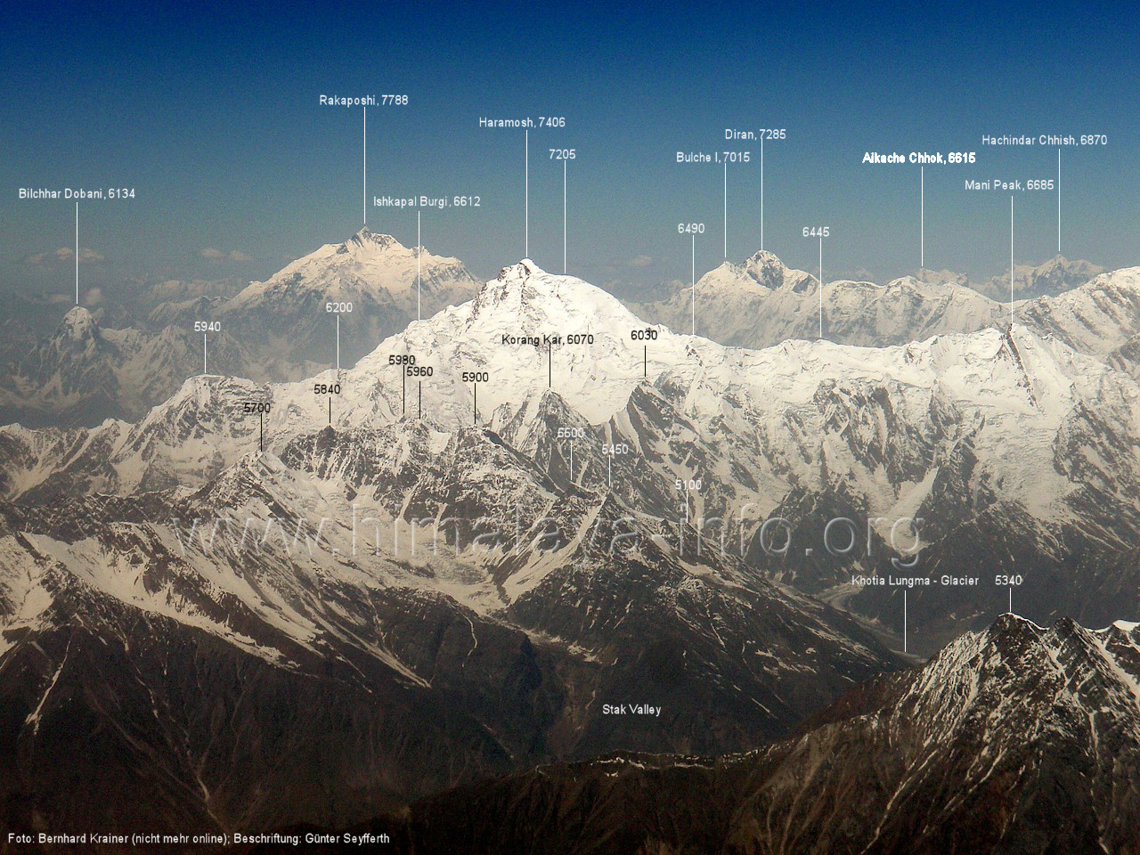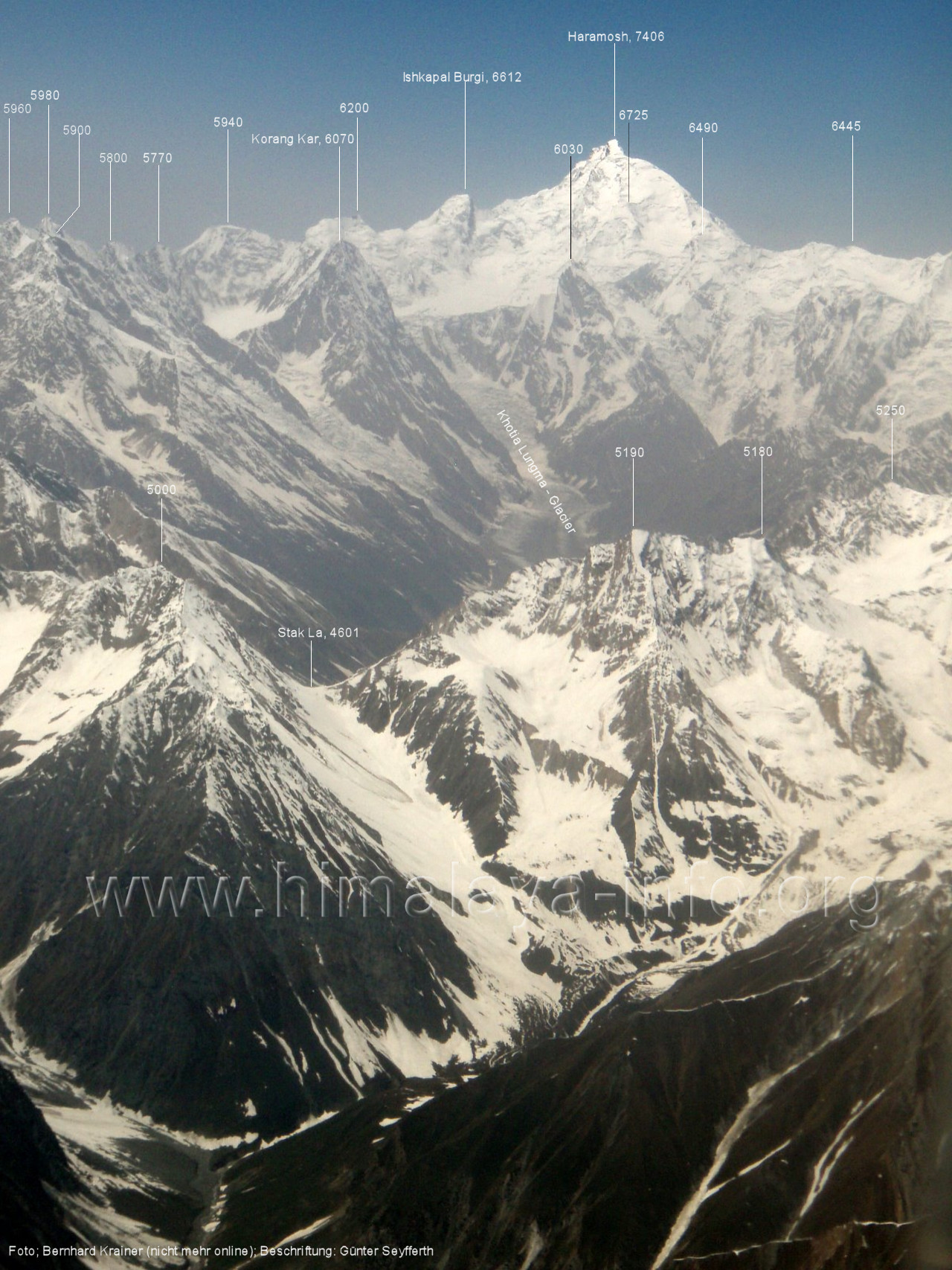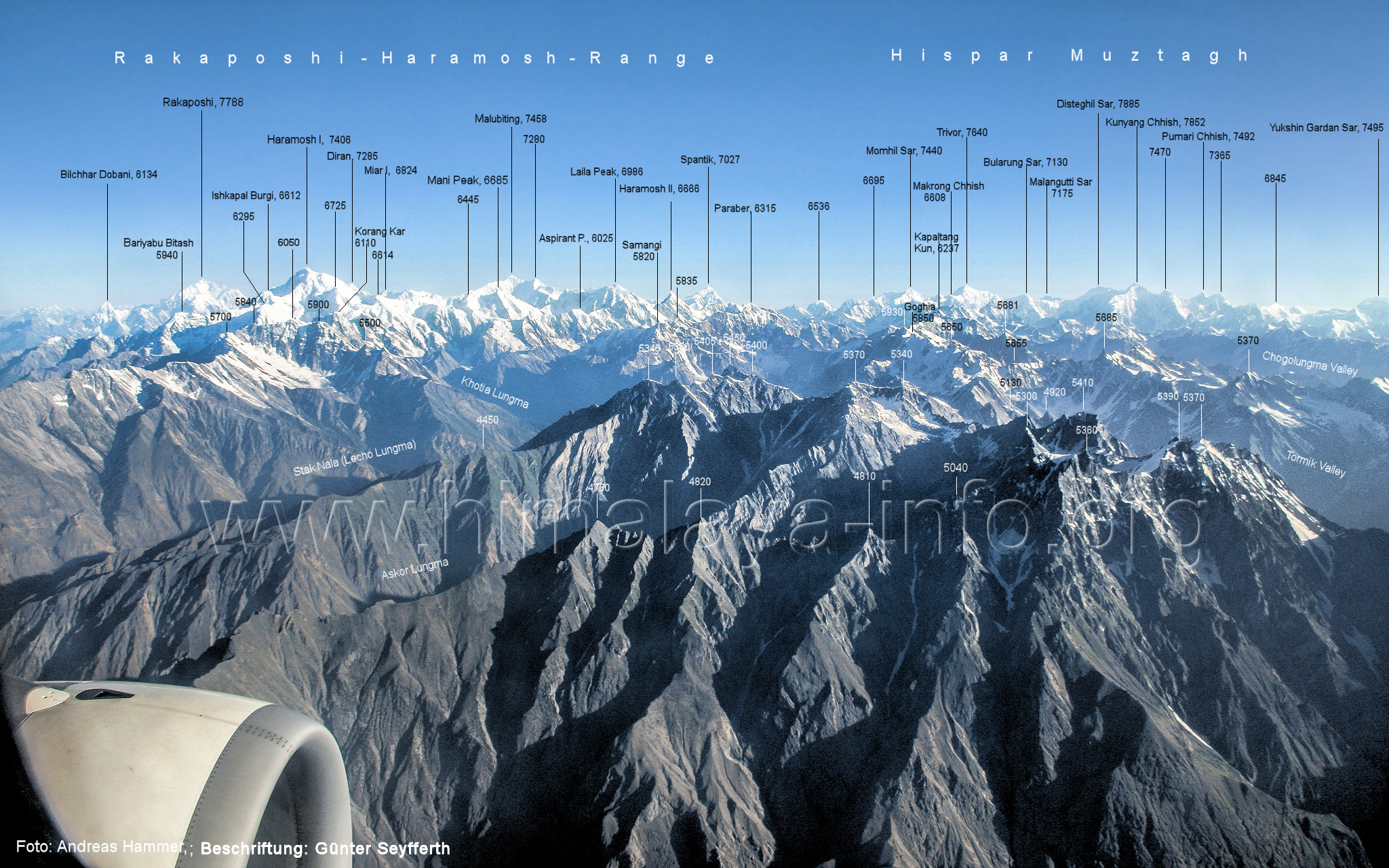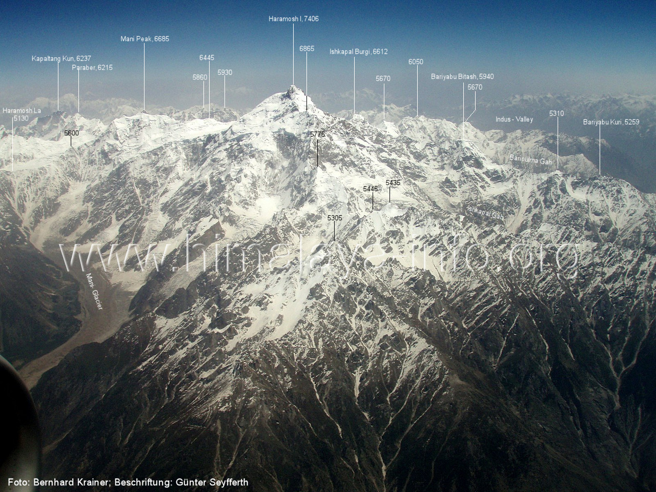 Die Position des Flugzeugs befindet sich über dem Tal des Tormik Lungma. Foto: Bernhard Krainer, Juli 2007; Beschriftung: Günter Seyfferth Von einer Position etwas weiter nördlich präsentiert sich die Ostflanke des Haramosh I wie folgt: