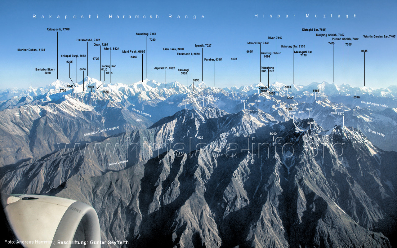 macht die Gipfelbestimmung Foto: Andreas Hammer, Juli 2017; Beschriftung: Günter Seyfferth Das folgende Bild zeigt die Gipfel in der linken Bildhälfte aus einer Position, die etwas weiter östlich ist. (267) Luftbild des Haramosh I (7406 m) von Südosten