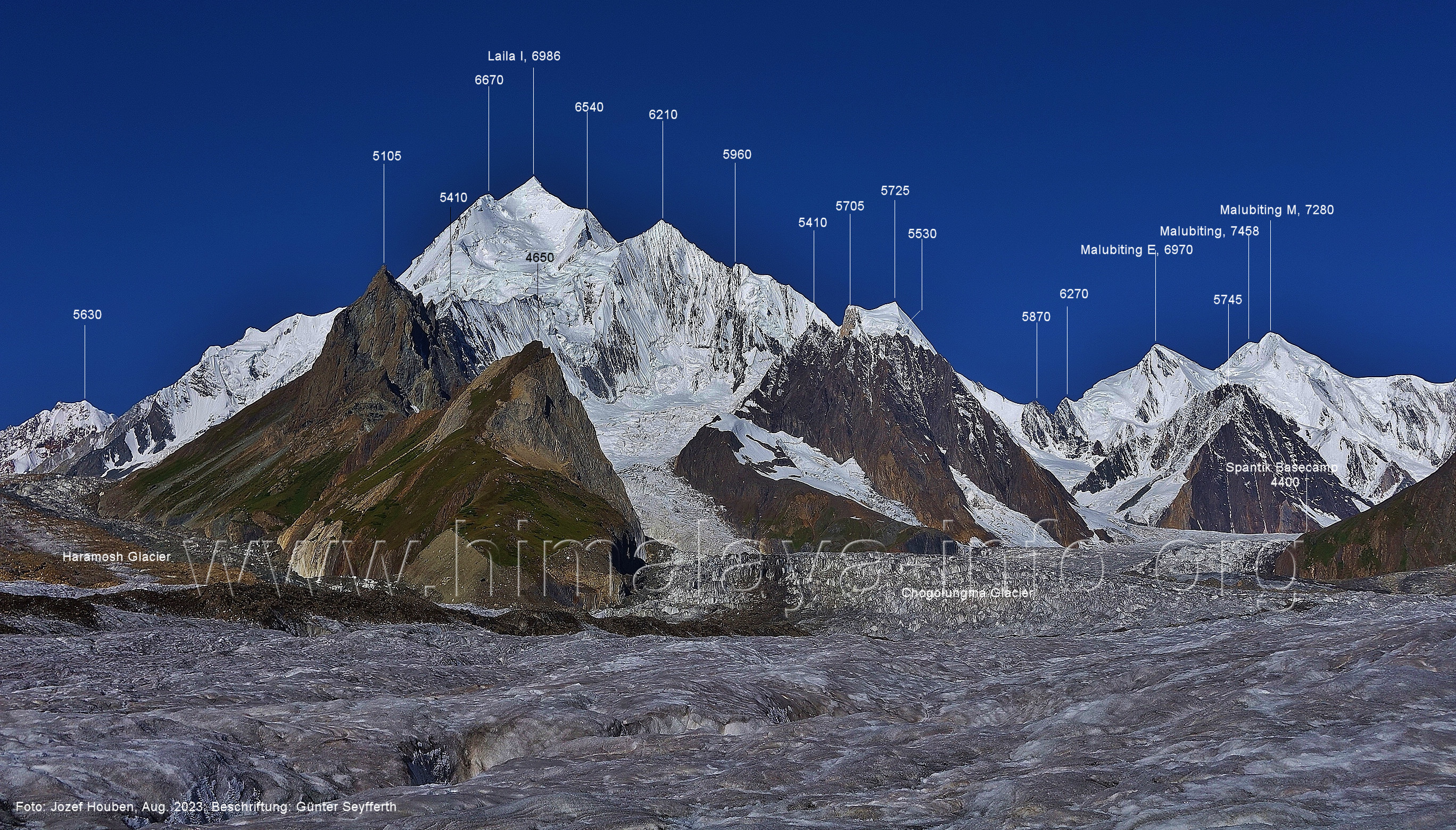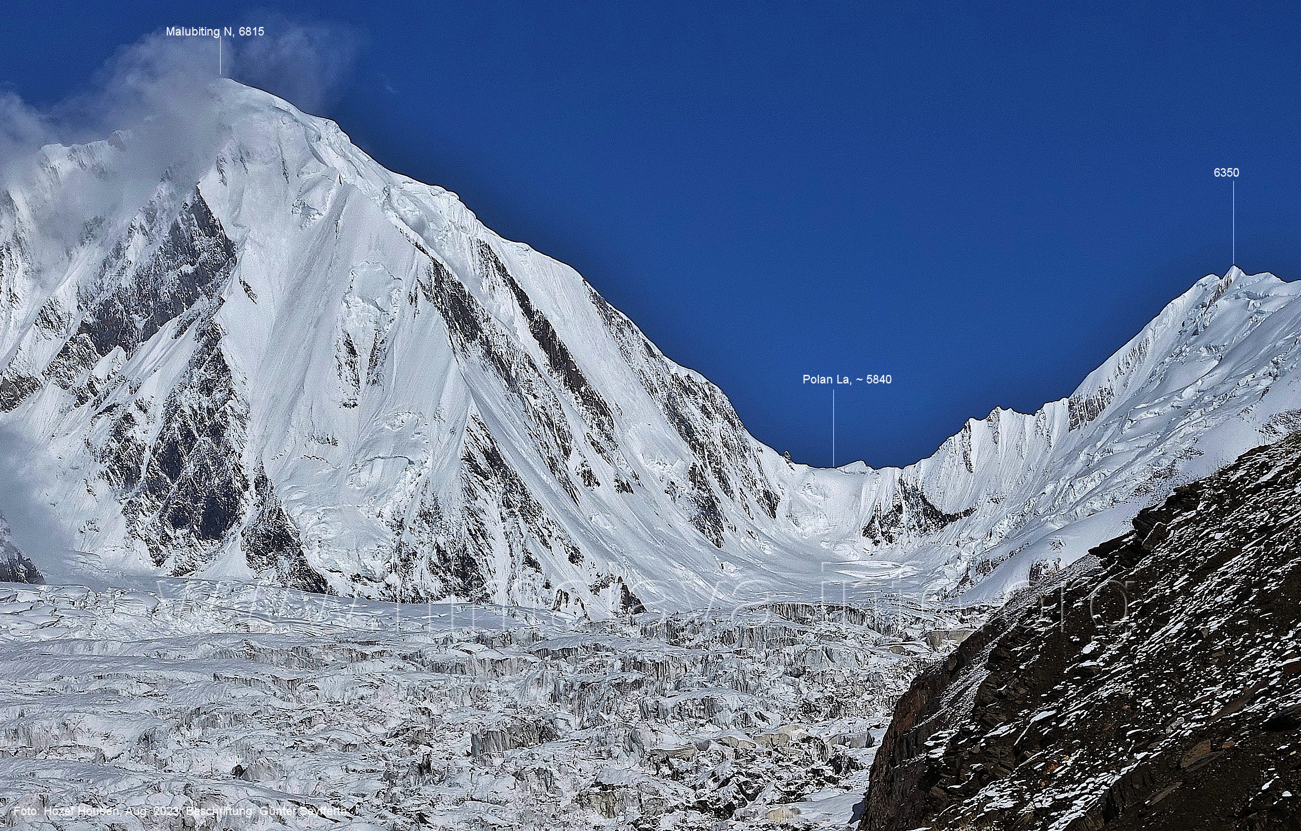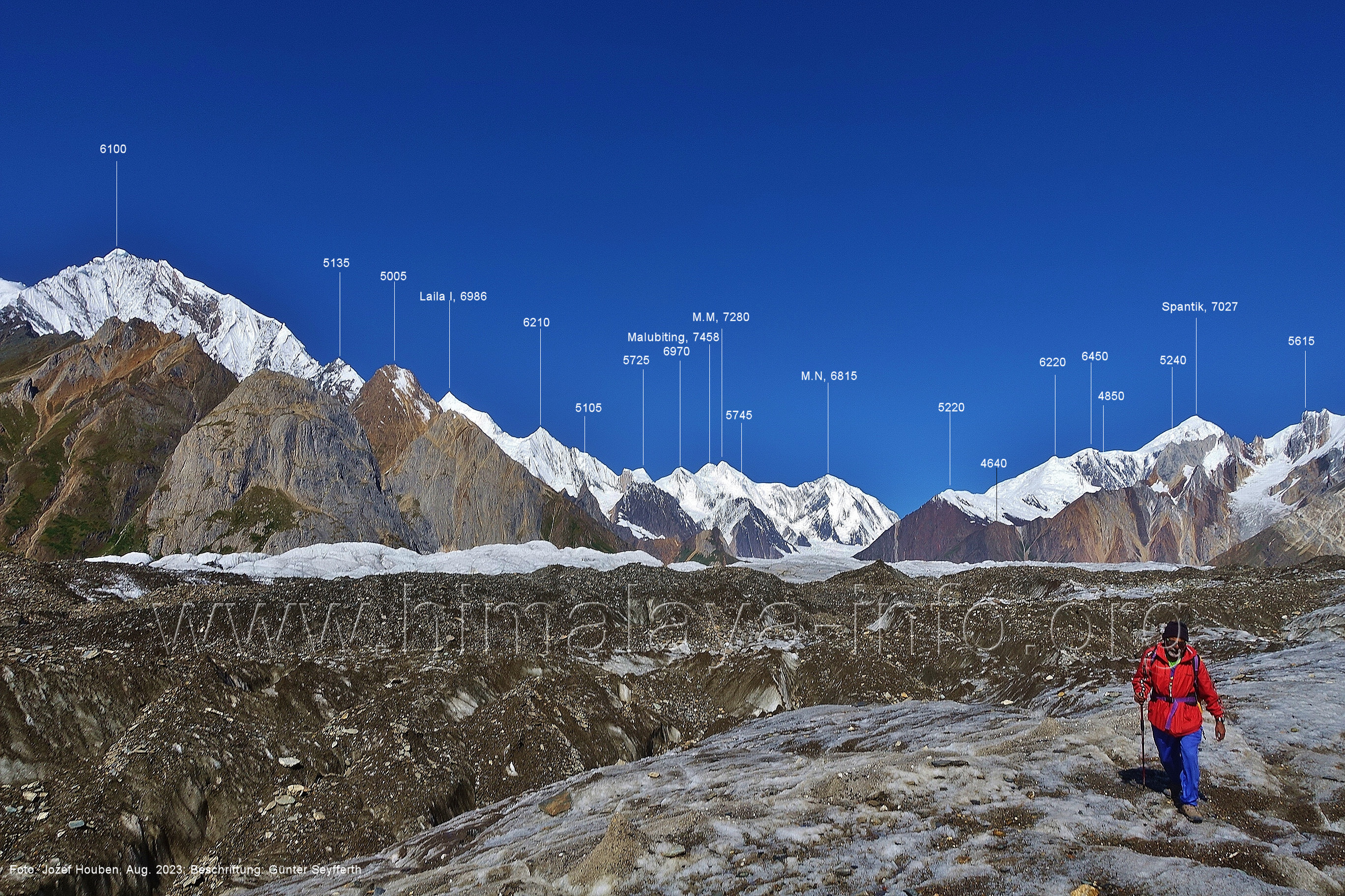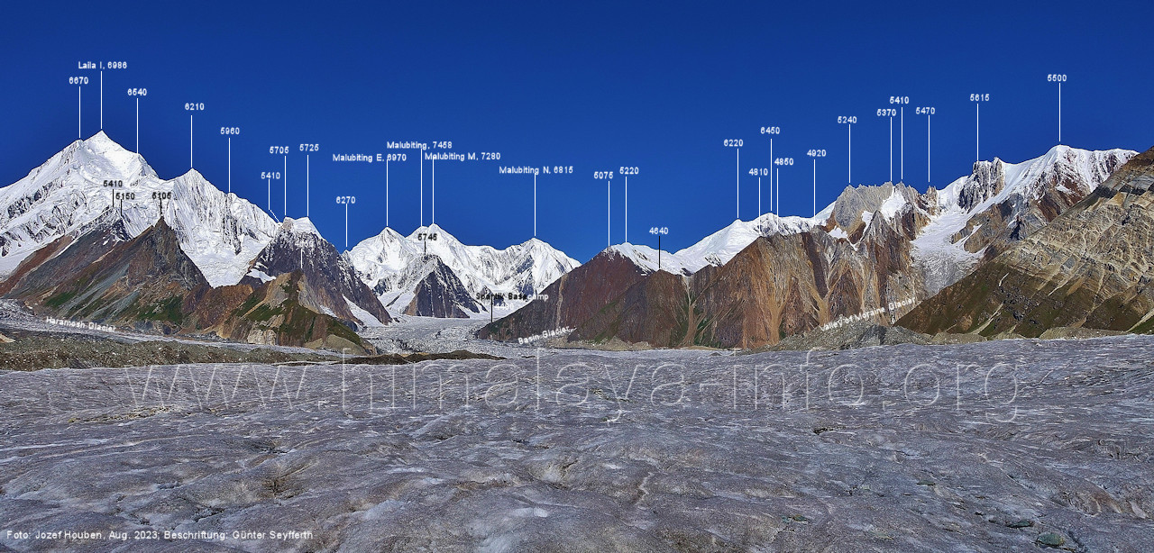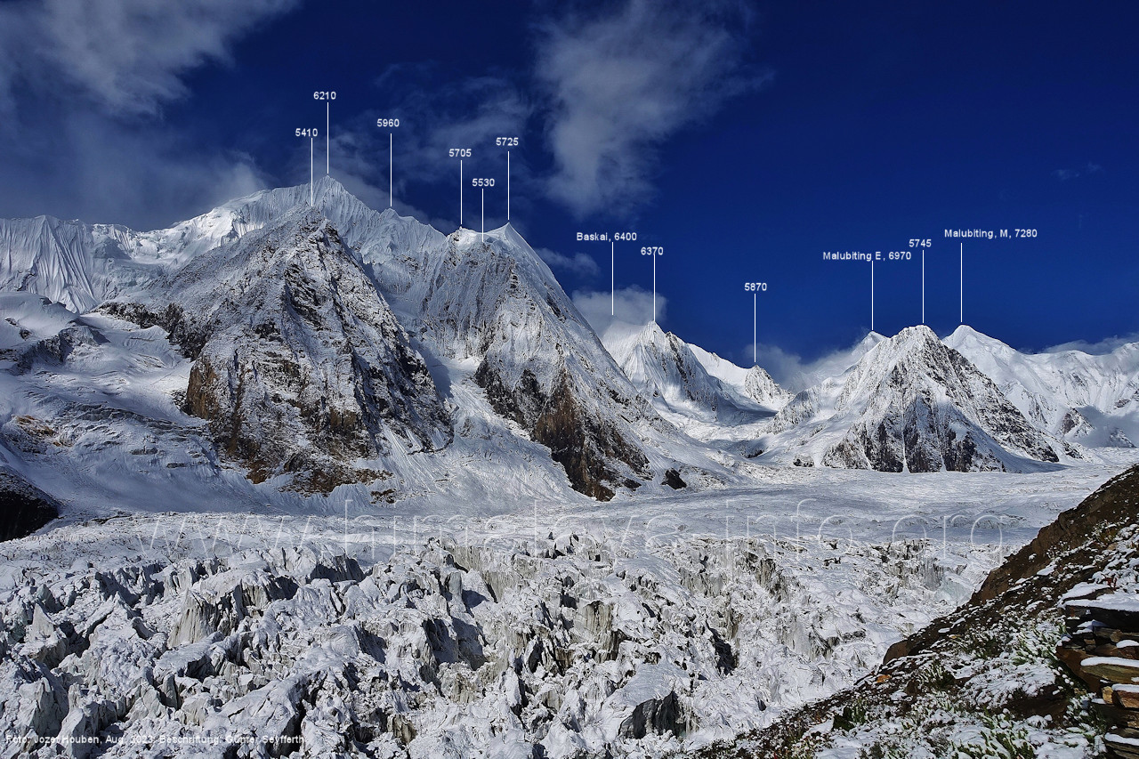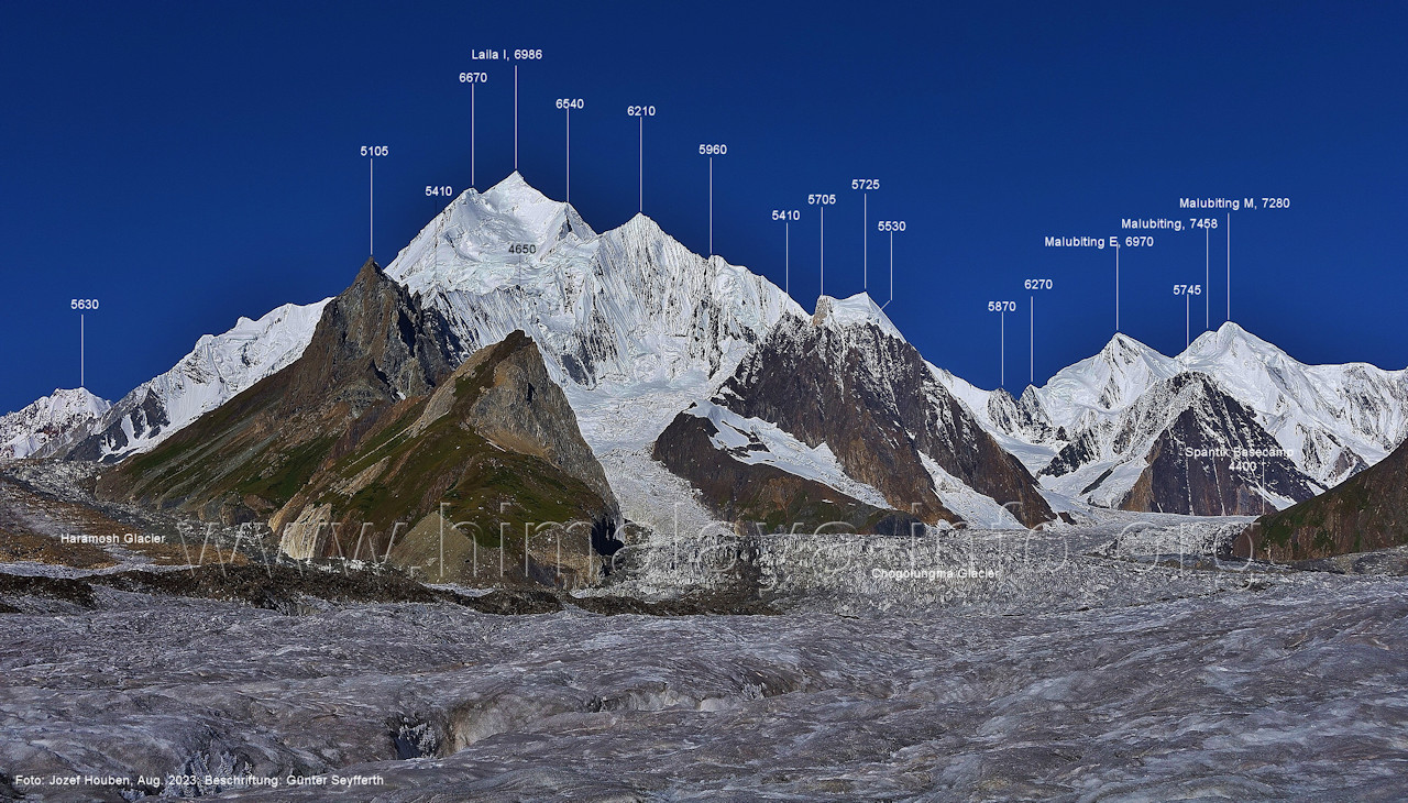 m), Bolocho VII (5290 m), Arencho (5500 m), Der Shel Chapka steht östlich des Basha River und gehört zur Region um den Sosbun-Gletscher. Foto: Jozef Houben, Aug. 2023; Beschriftung: Günter Seyfferth (79) Blick bei 75°03'30" in ca. 4025 m Höhe nach Südwesten mit Laila I (6986 m) und Malubiting (7458 m)
