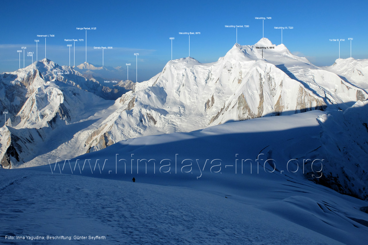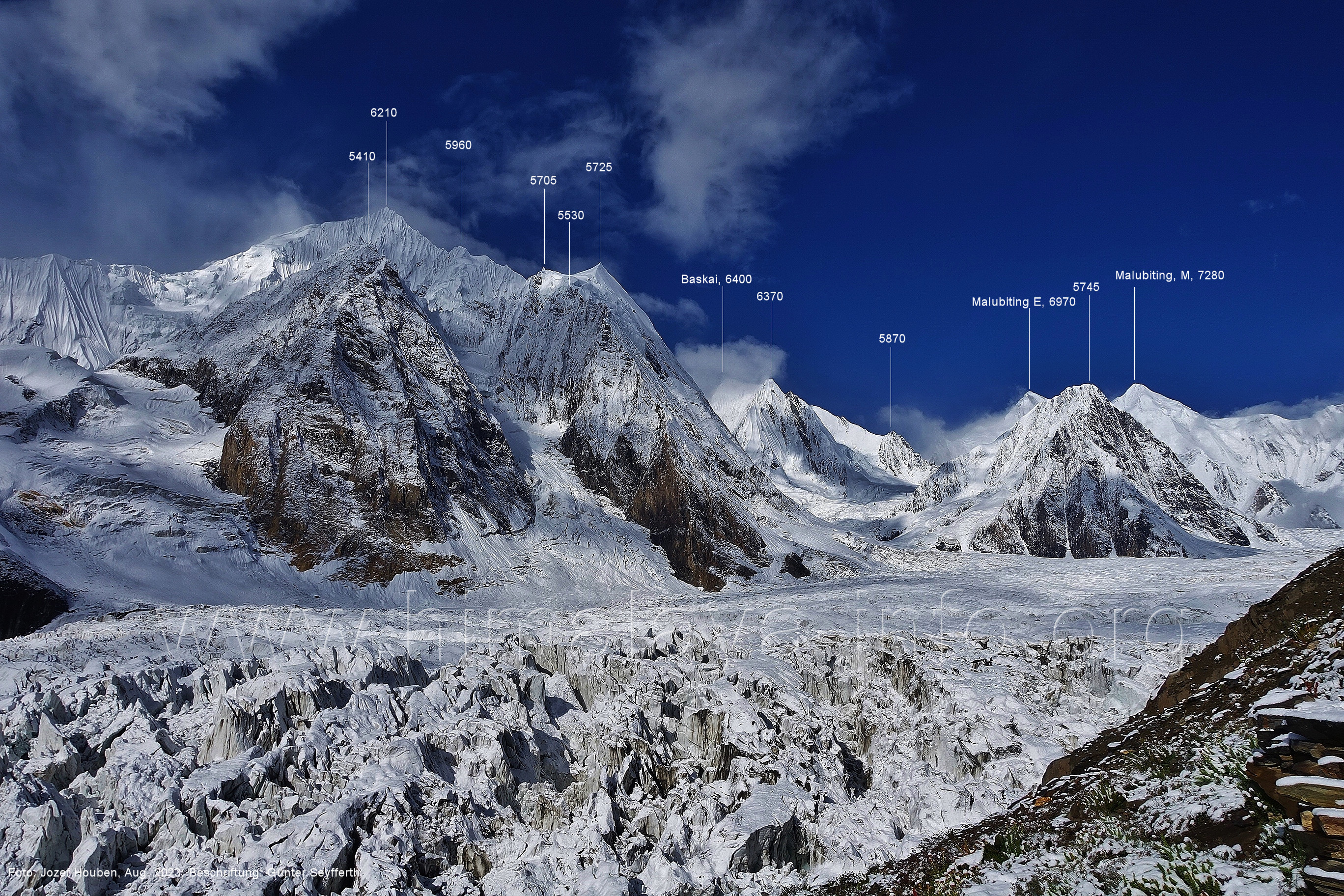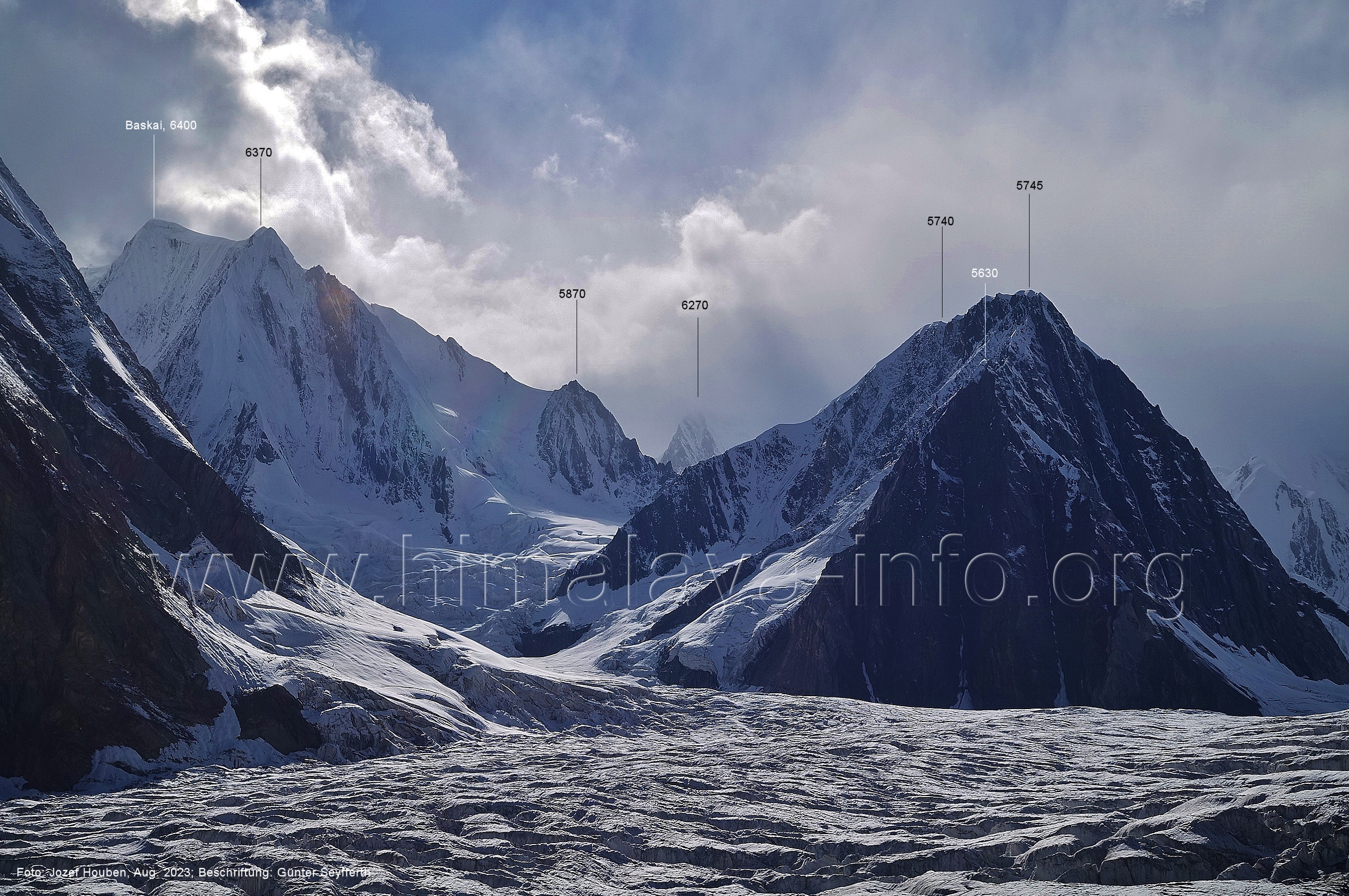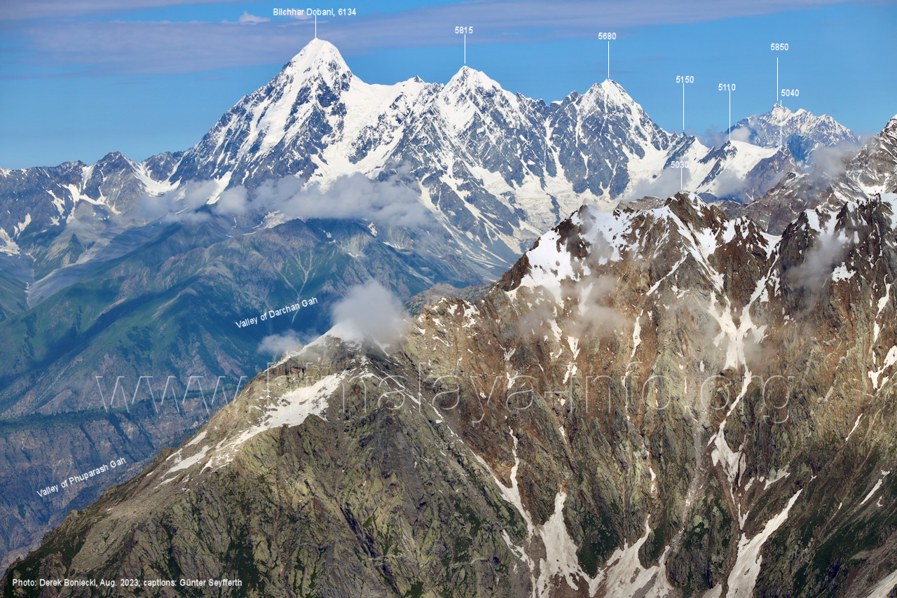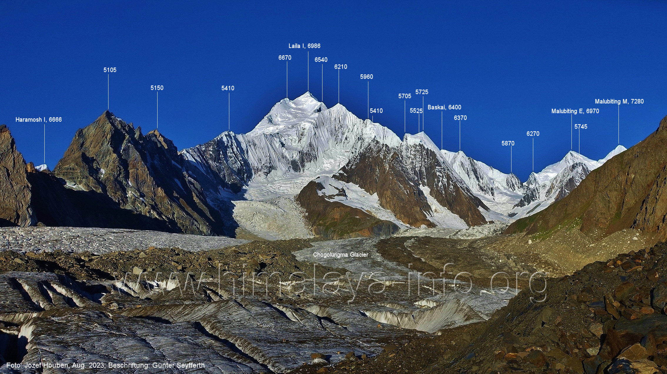m), Bolocho VII (5290 m), Arencho (5500 m), Der Shel Chapka steht östlich des Basha River und gehört zur Region um den Sosbun-Gletscher. Foto: Jozef Houben, Aug. 2023; Beschriftung: Günter Seyfferth (79) Blick bei 75°03'30" in ca. 4025 m Höhe nach Südwesten mit Laila I (6986 m) und Malubiting (7458 m)