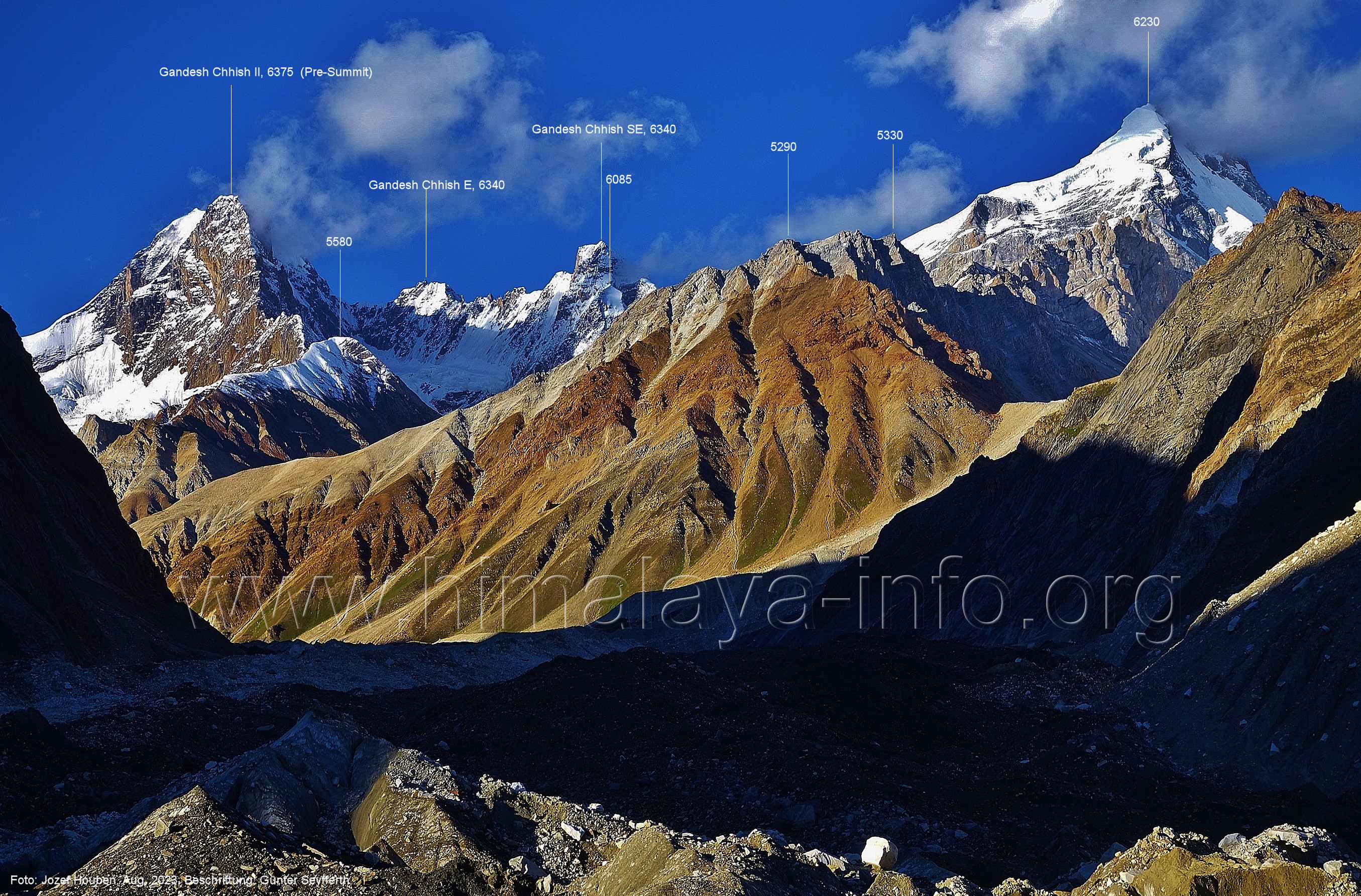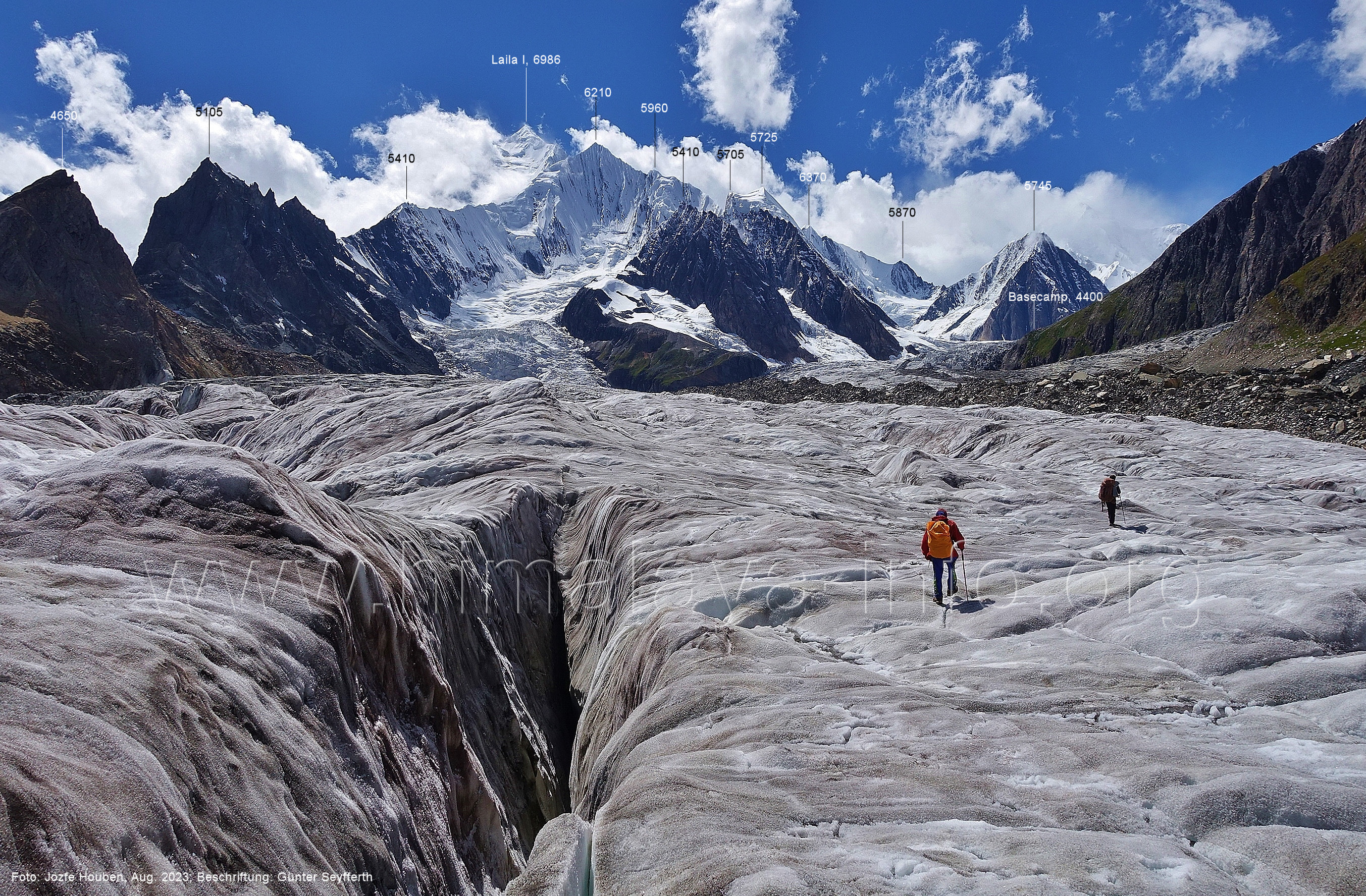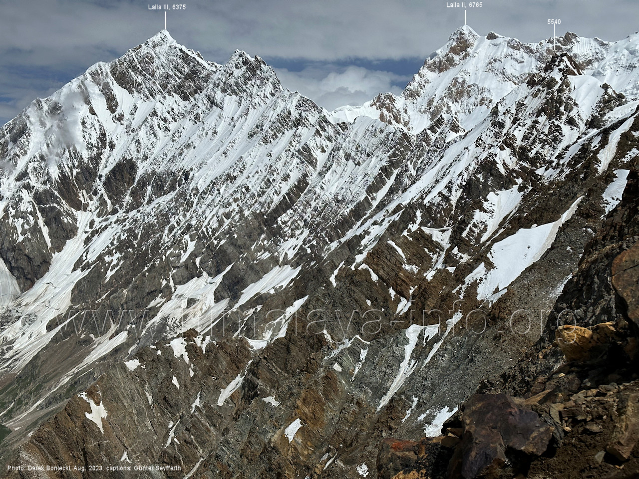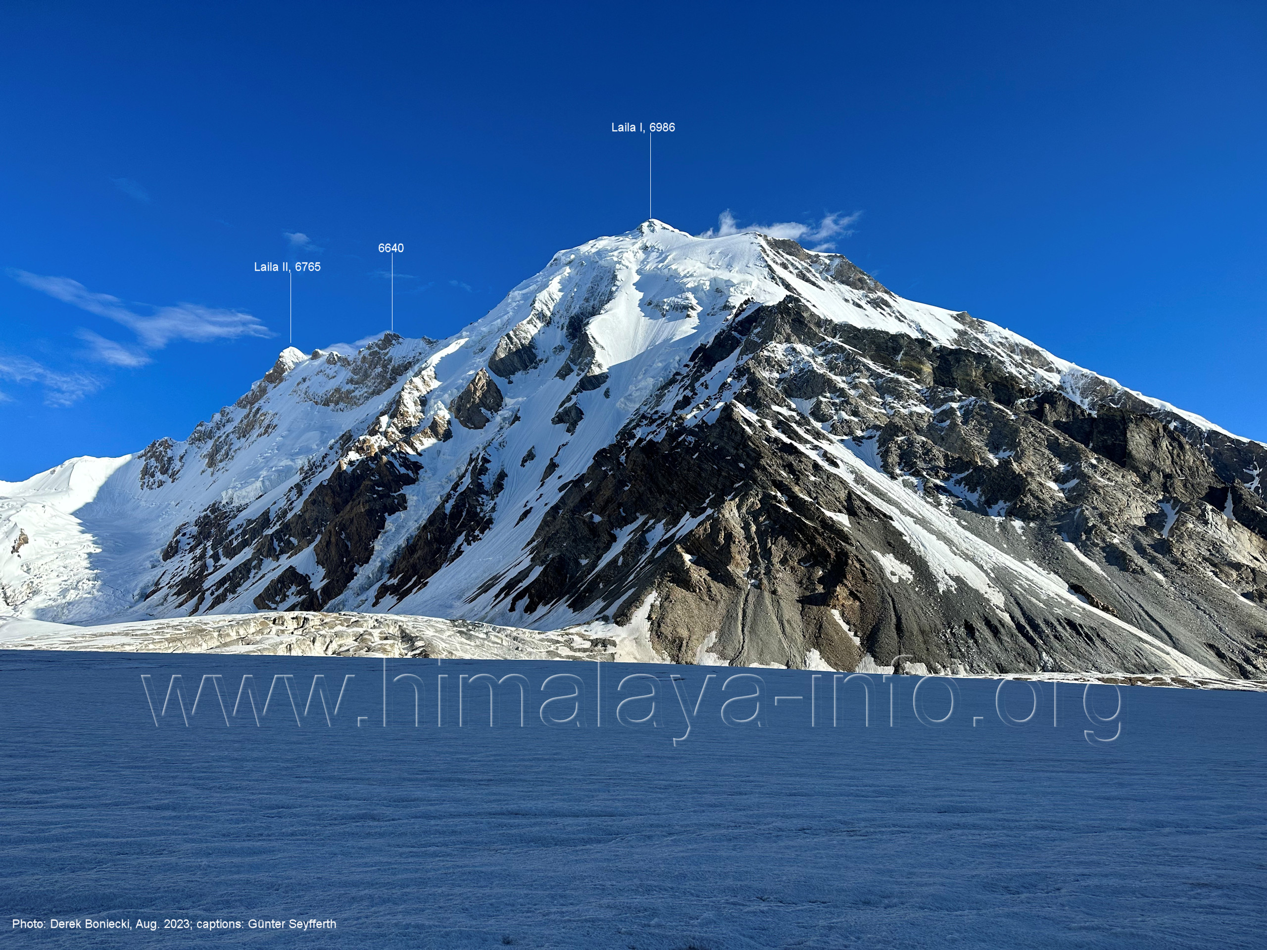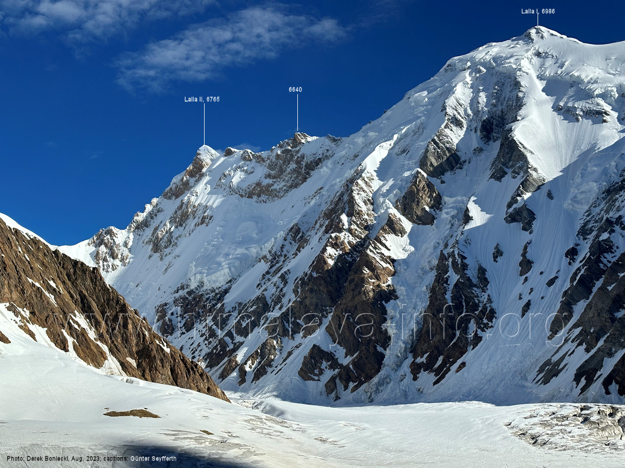 m), Bolocho VII (5290 m), Arencho (5500 m), Der Shel Chapka steht östlich des Basha River und gehört zur Region um den Sosbun-Gletscher. Foto: Jozef Houben, Aug. 2023; Beschriftung: Günter Seyfferth (79) Blick bei 75°03'30" in ca. 4025 m Höhe nach Südwesten mit Laila I (6986 m) und Malubiting (7458 m)