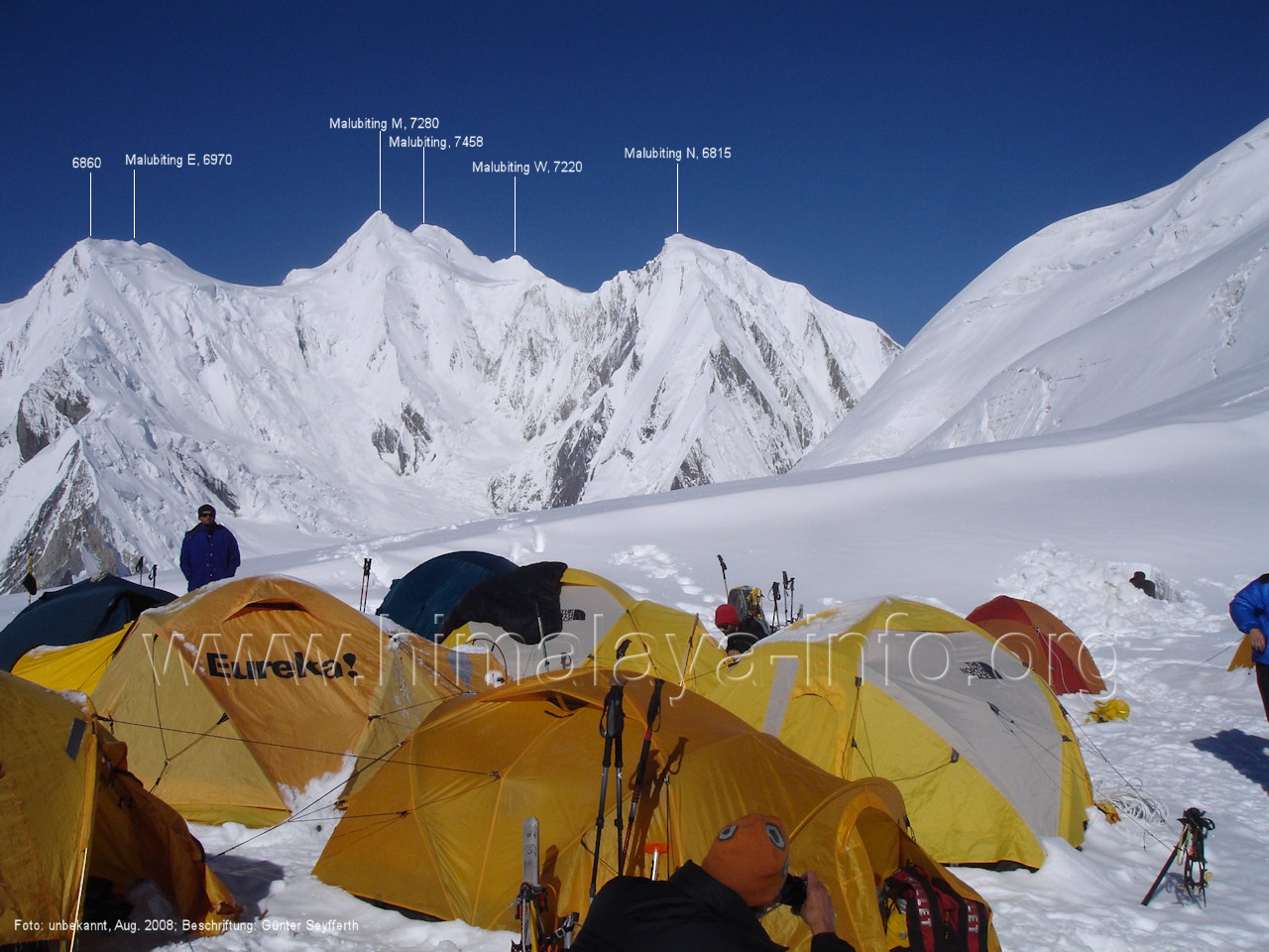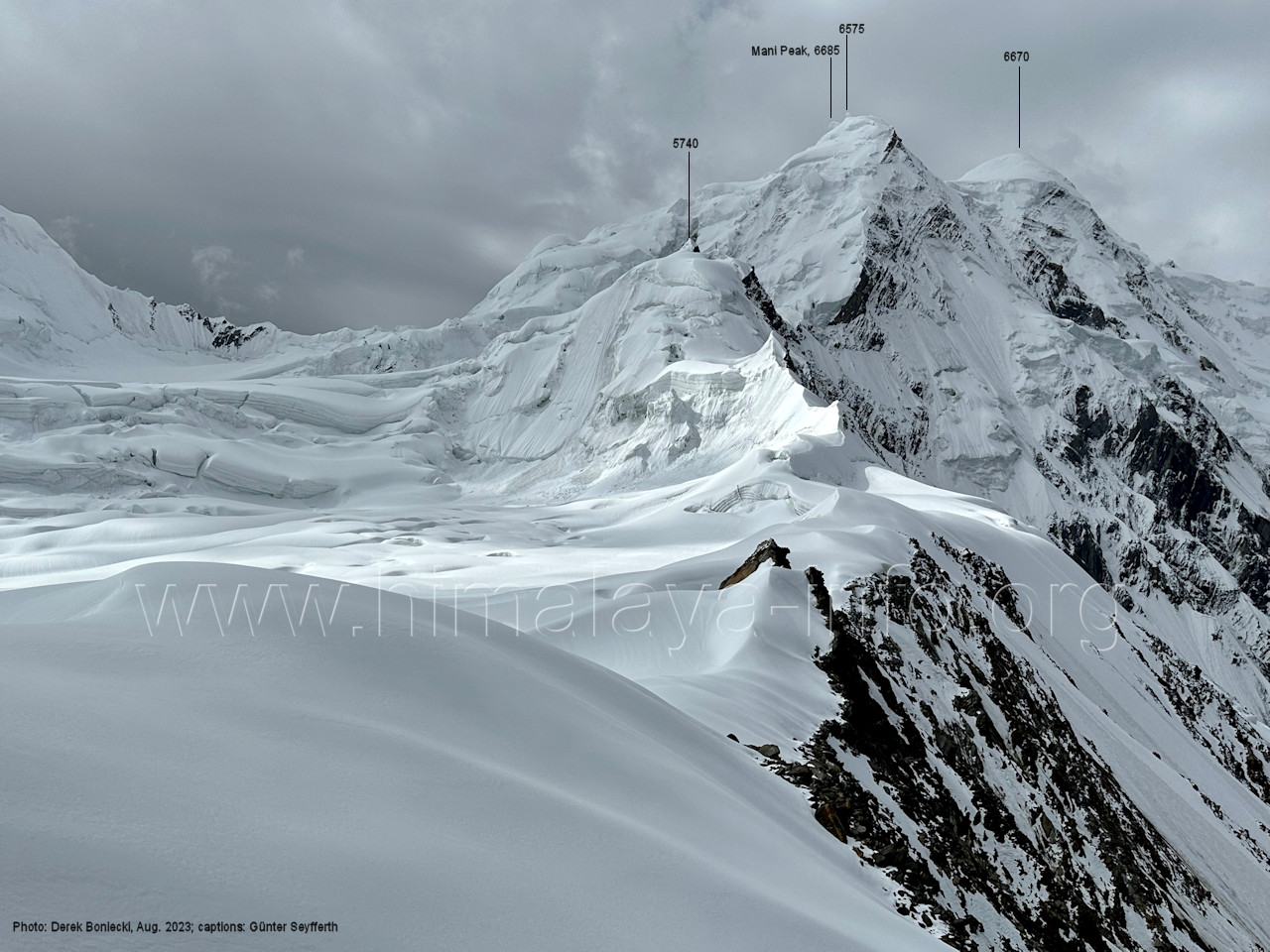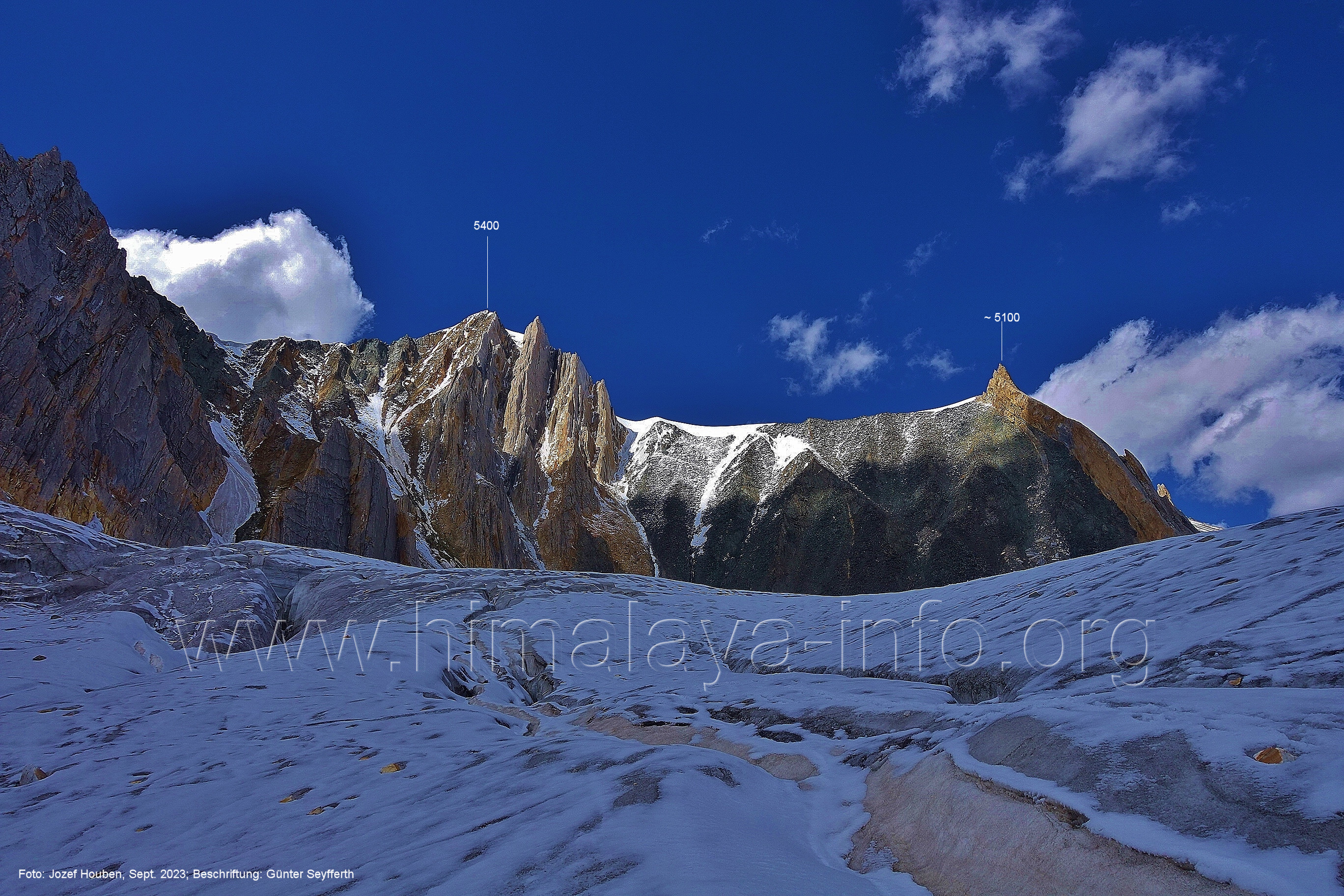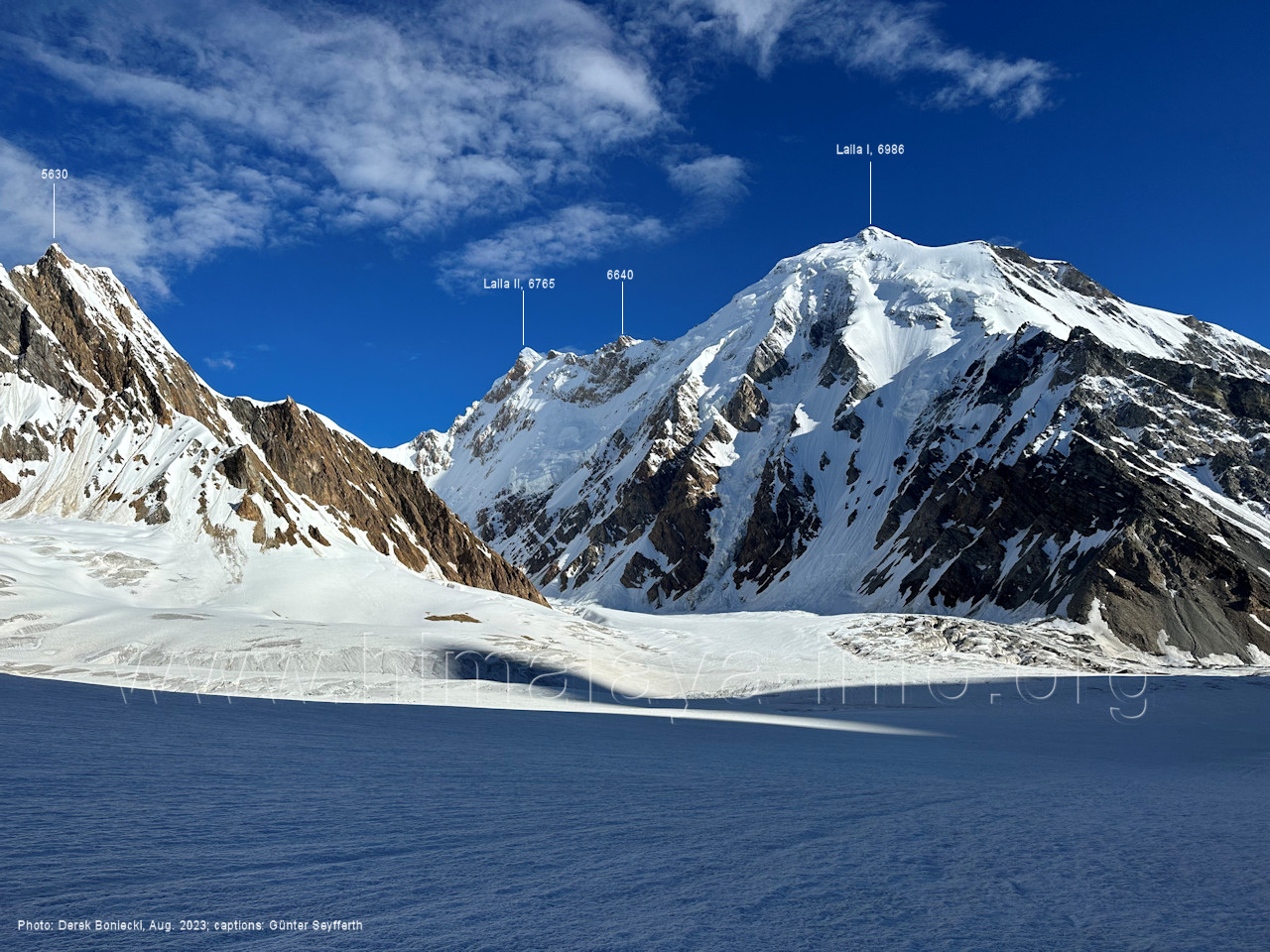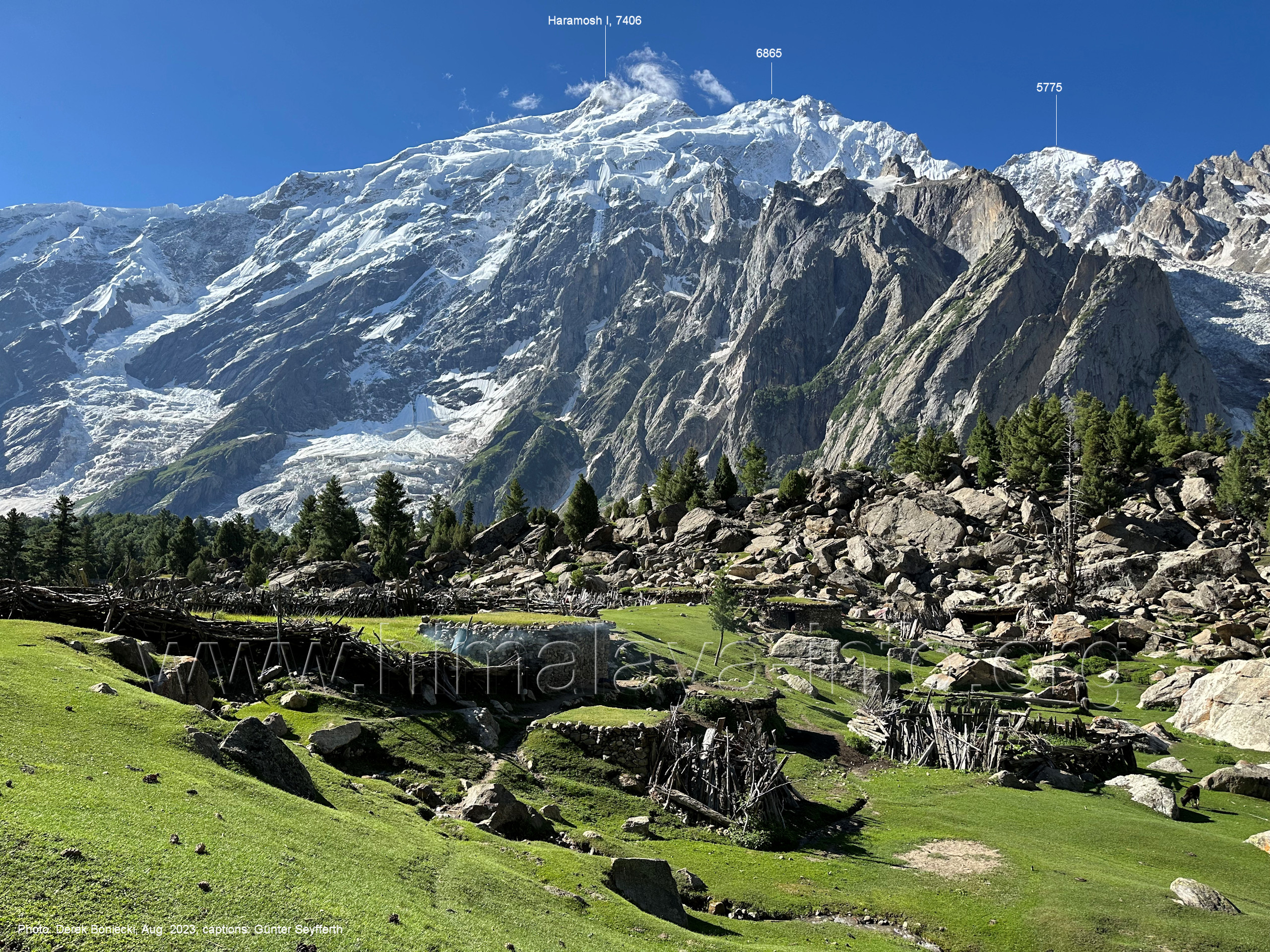 m), Bolocho VII (5290 m), Arencho (5500 m), Der Shel Chapka steht östlich des Basha River und gehört zur Region um den Sosbun-Gletscher. Foto: Jozef Houben, Aug. 2023; Beschriftung: Günter Seyfferth (79) Blick bei 75°03'30" in ca. 4025 m Höhe nach Südwesten mit Laila I (6986 m) und Malubiting (7458 m)