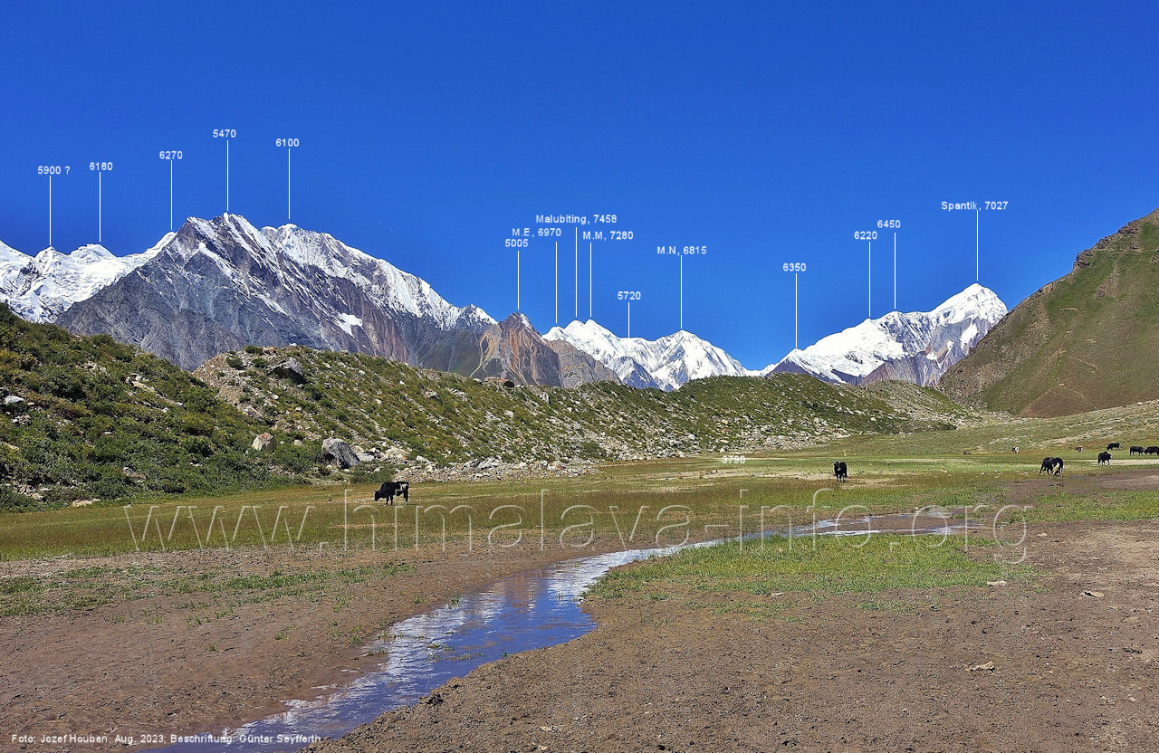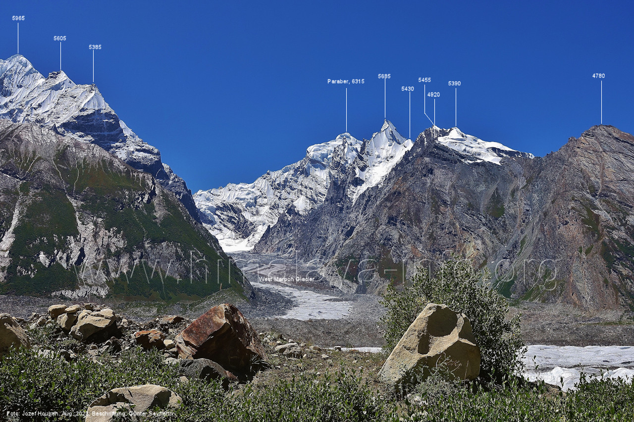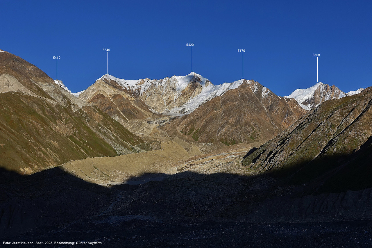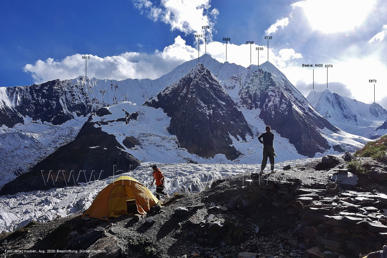 Peak (5500 m) und Entok (5790 m). Foto: Jozef Houben, Aug. 2023; Beschriftung: Günter Seyfferth (56) Blick bei 75°07'15" an der Mündung des Bolocho-Tals nach Süden zu Kapaltang Kun (6237 m) und Paraber (6315 m) Foto: Jozef Houben, Aug. 2023; Beschriftung: Günter Seyfferth (57) Blick bei 75°07'05" in ca. 3840 m Höhe nach Südwesten mit Laila I (6986 m), Malubiting (7458 m) und Spantik (7027 m).