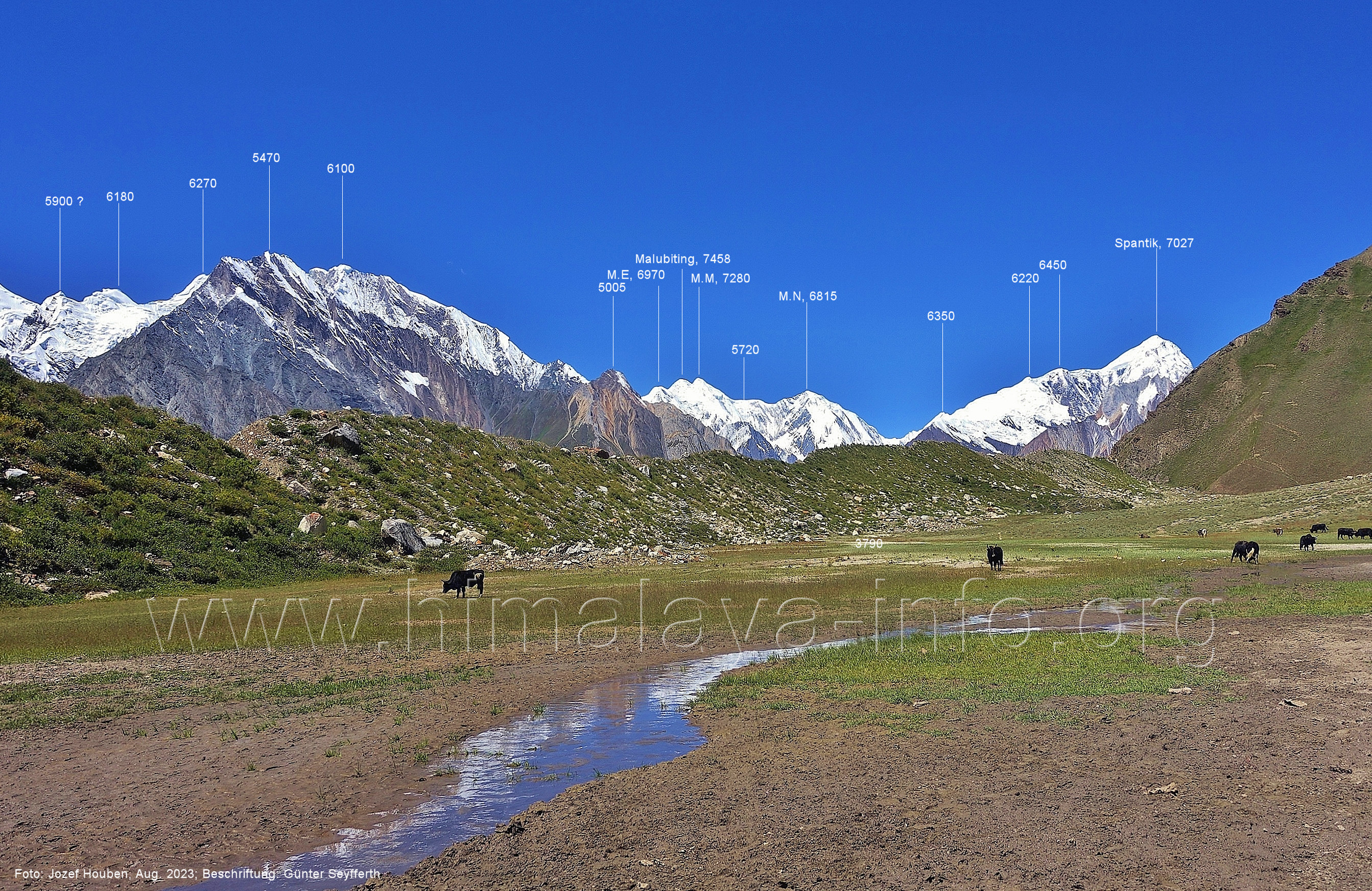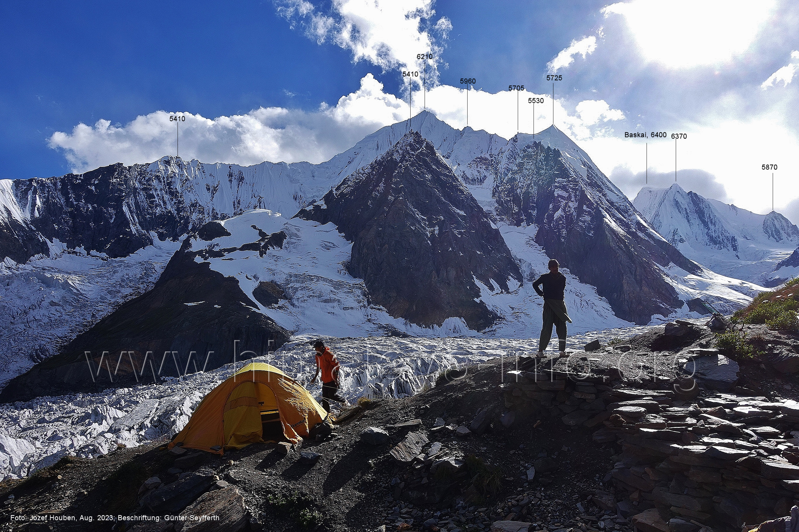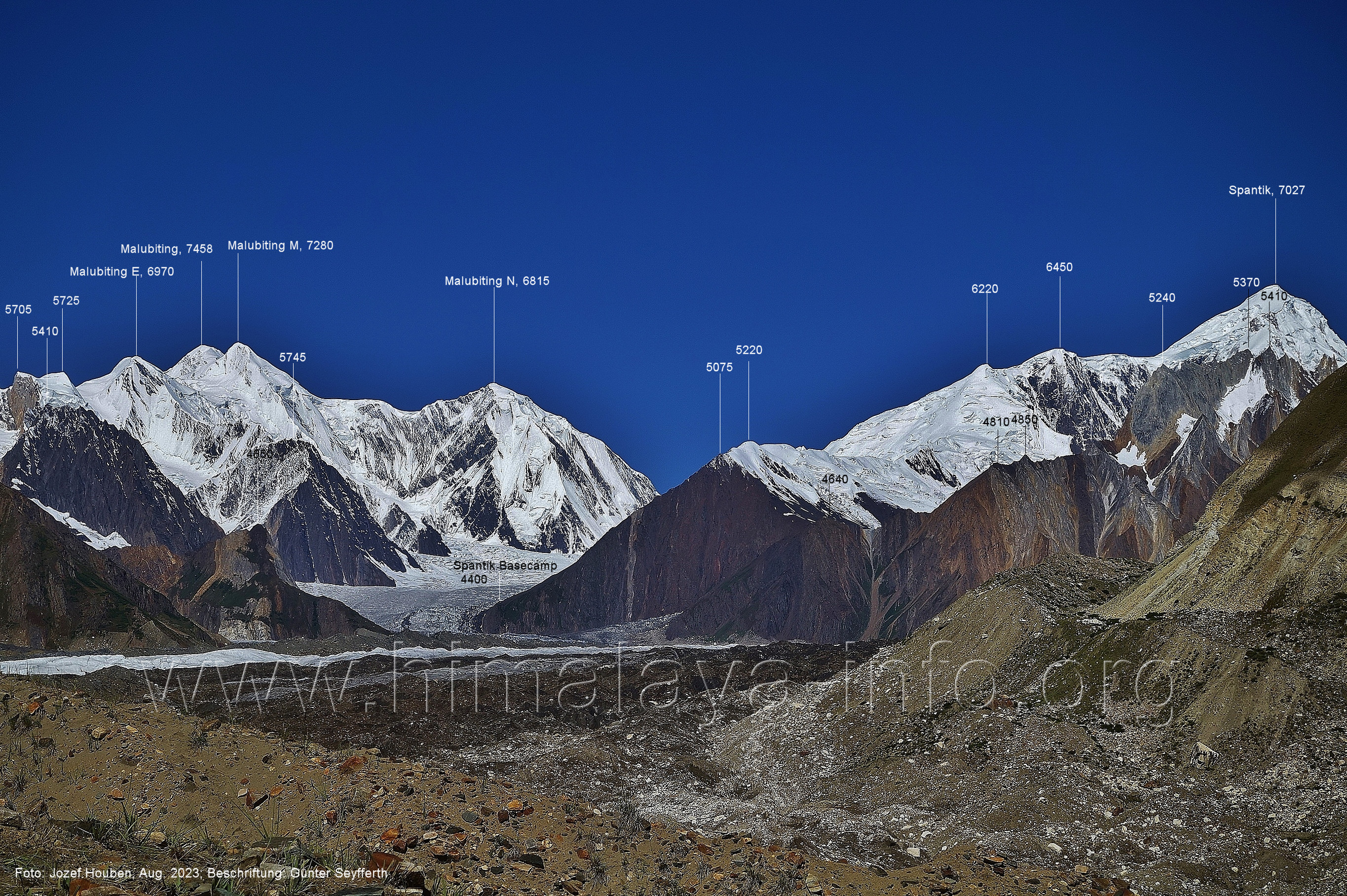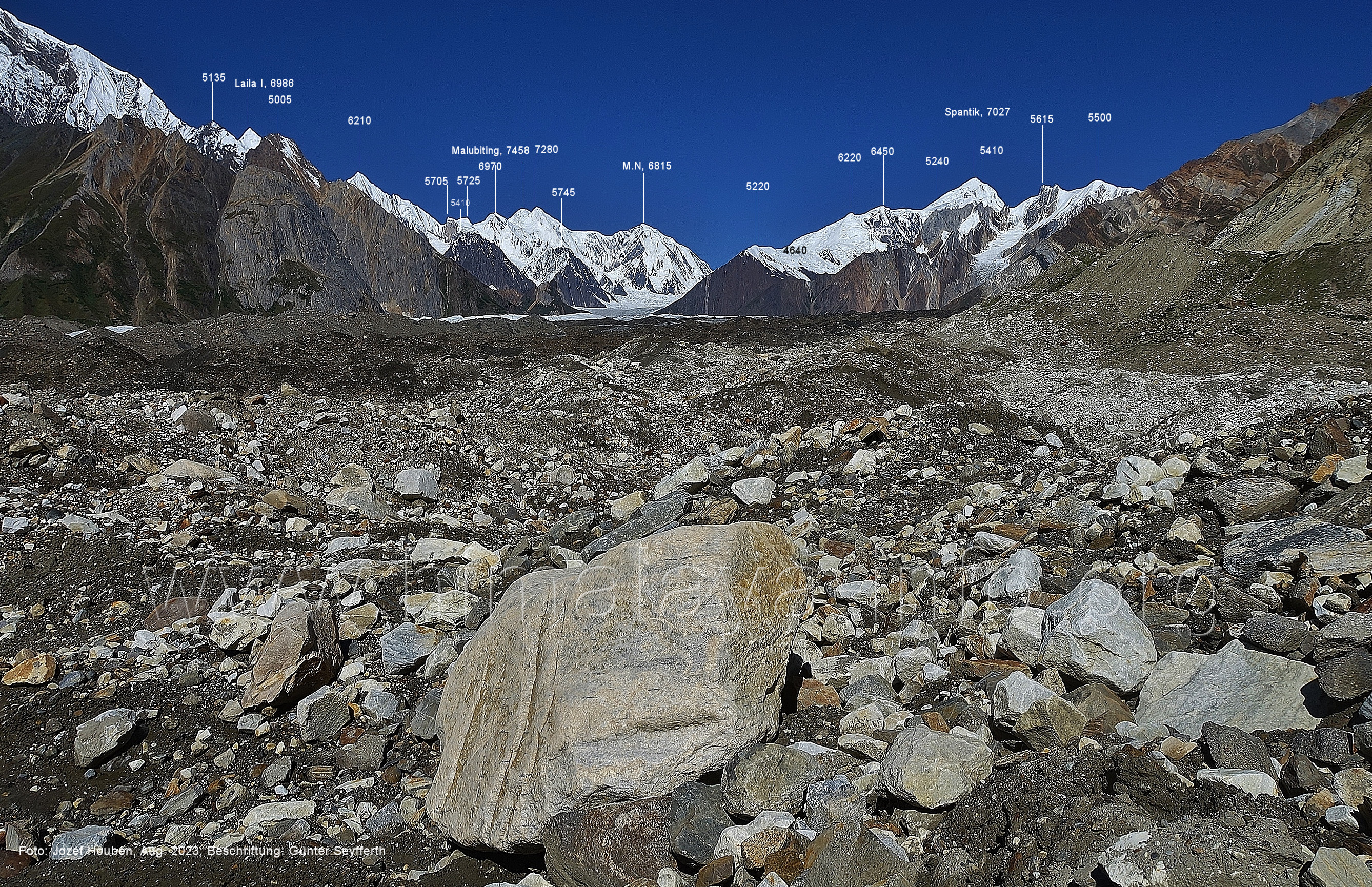 Peak (5500 m) und Entok (5790 m). Foto: Jozef Houben, Aug. 2023; Beschriftung: Günter Seyfferth (56) Blick bei 75°07'15" an der Mündung des Bolocho-Tals nach Süden zu Kapaltang Kun (6237 m) und Paraber (6315 m) Foto: Jozef Houben, Aug. 2023; Beschriftung: Günter Seyfferth (57) Blick bei 75°07'05" in ca. 3840 m Höhe nach Südwesten mit Laila I (6986 m), Malubiting (7458 m) und Spantik (7027 m).