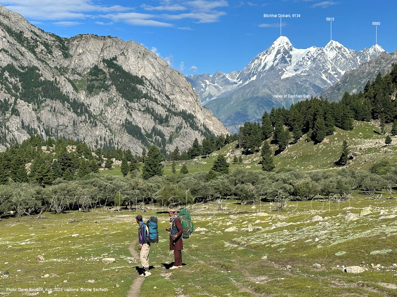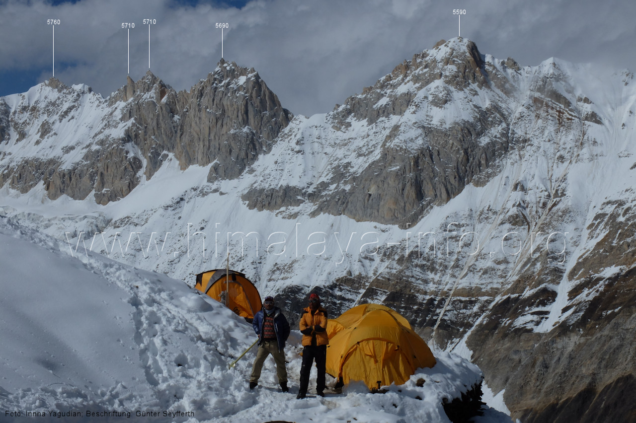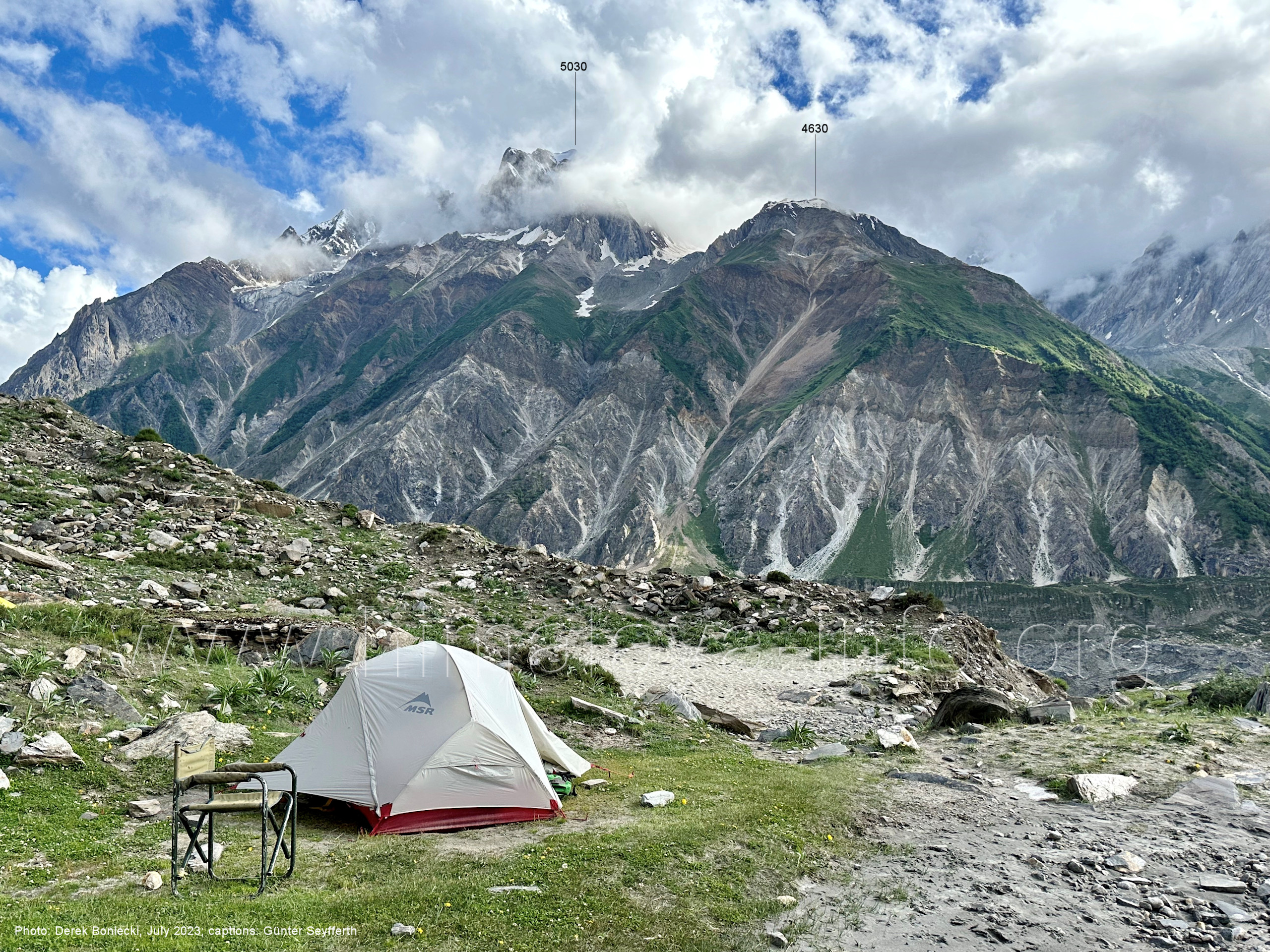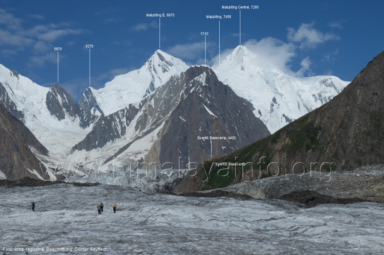 Peak (5500 m) und Entok (5790 m). Foto: Jozef Houben, Aug. 2023; Beschriftung: Günter Seyfferth (56) Blick bei 75°07'15" an der Mündung des Bolocho-Tals nach Süden zu Kapaltang Kun (6237 m) und Paraber (6315 m) Foto: Jozef Houben, Aug. 2023; Beschriftung: Günter Seyfferth (57) Blick bei 75°07'05" in ca. 3840 m Höhe nach Südwesten mit Laila I (6986 m), Malubiting (7458 m) und Spantik (7027 m).