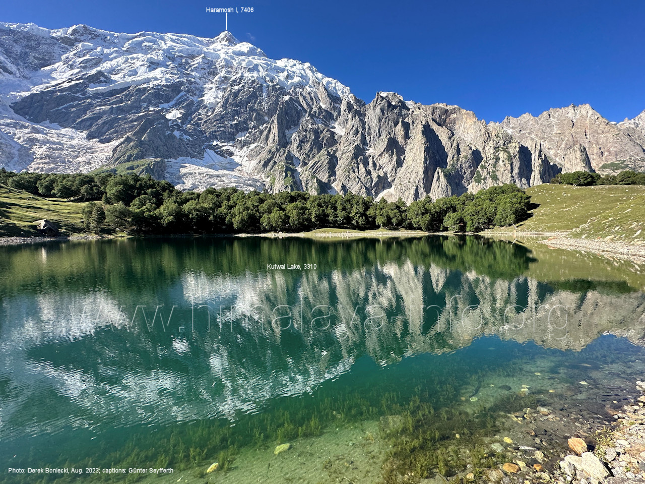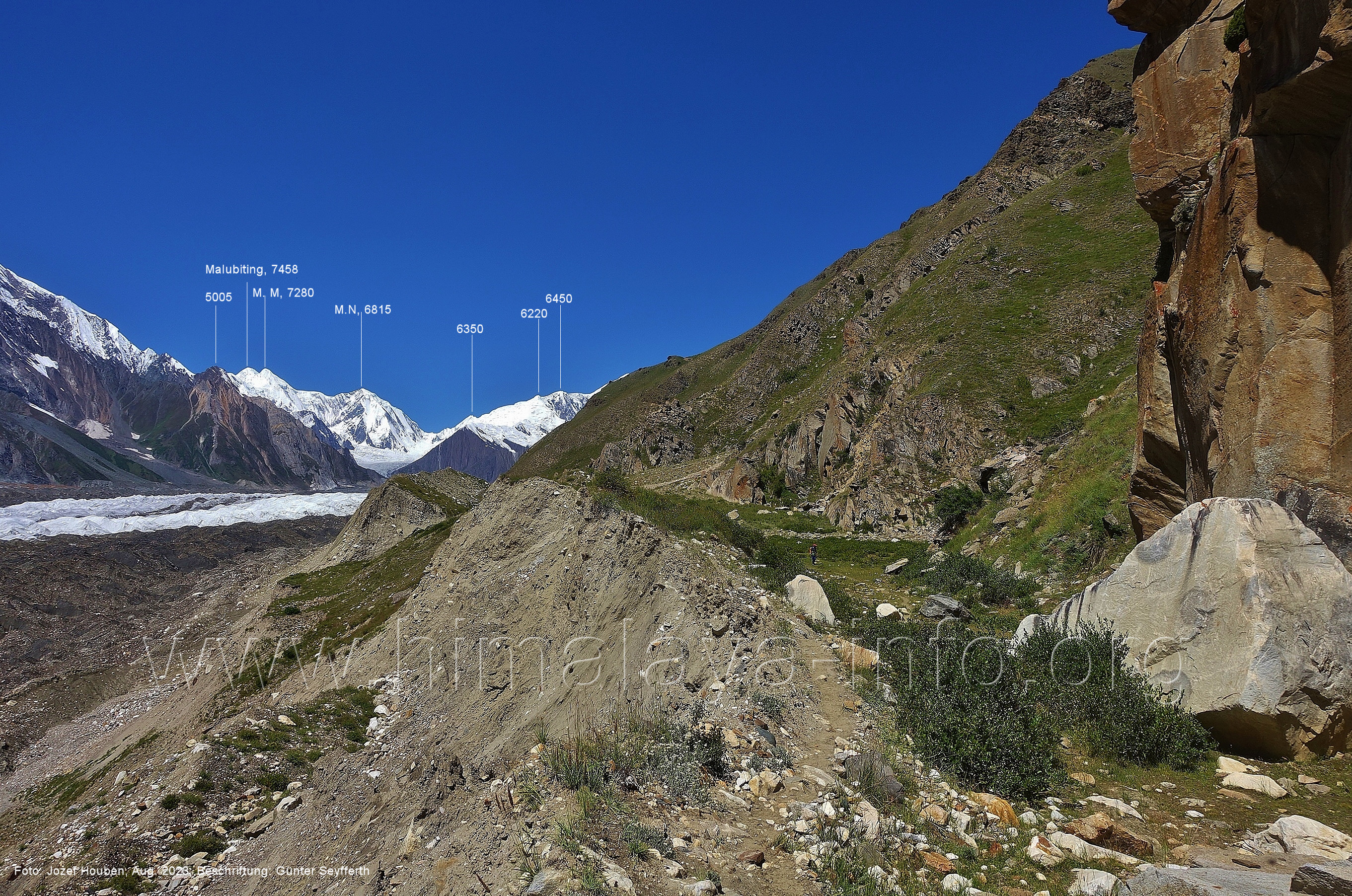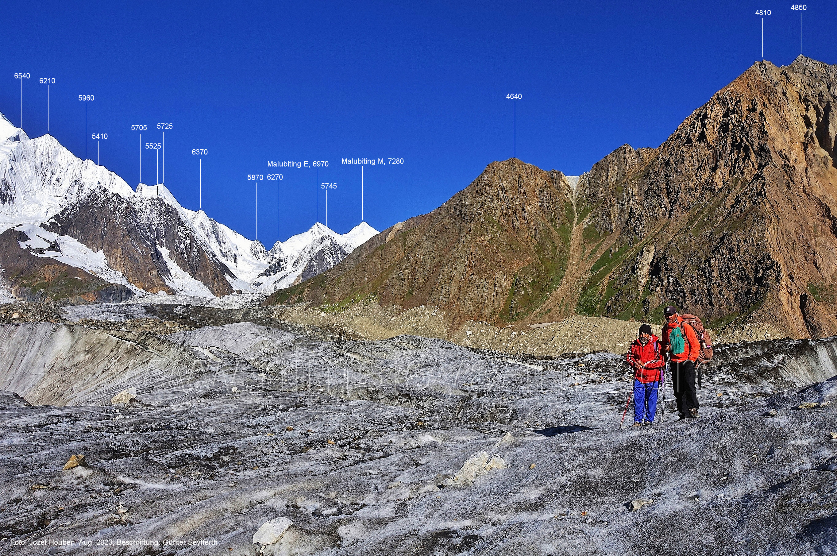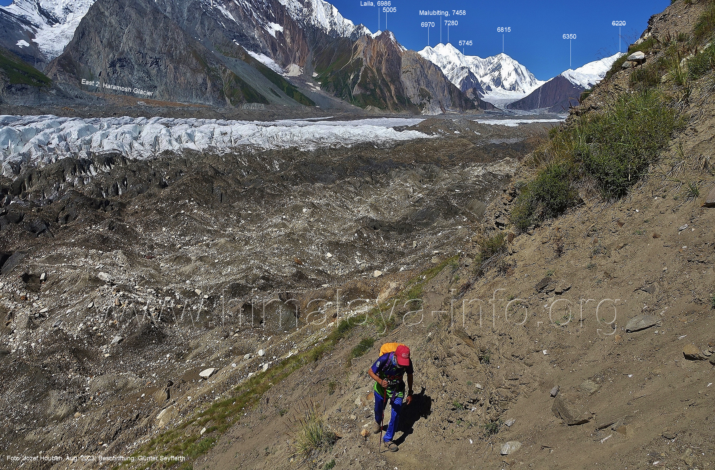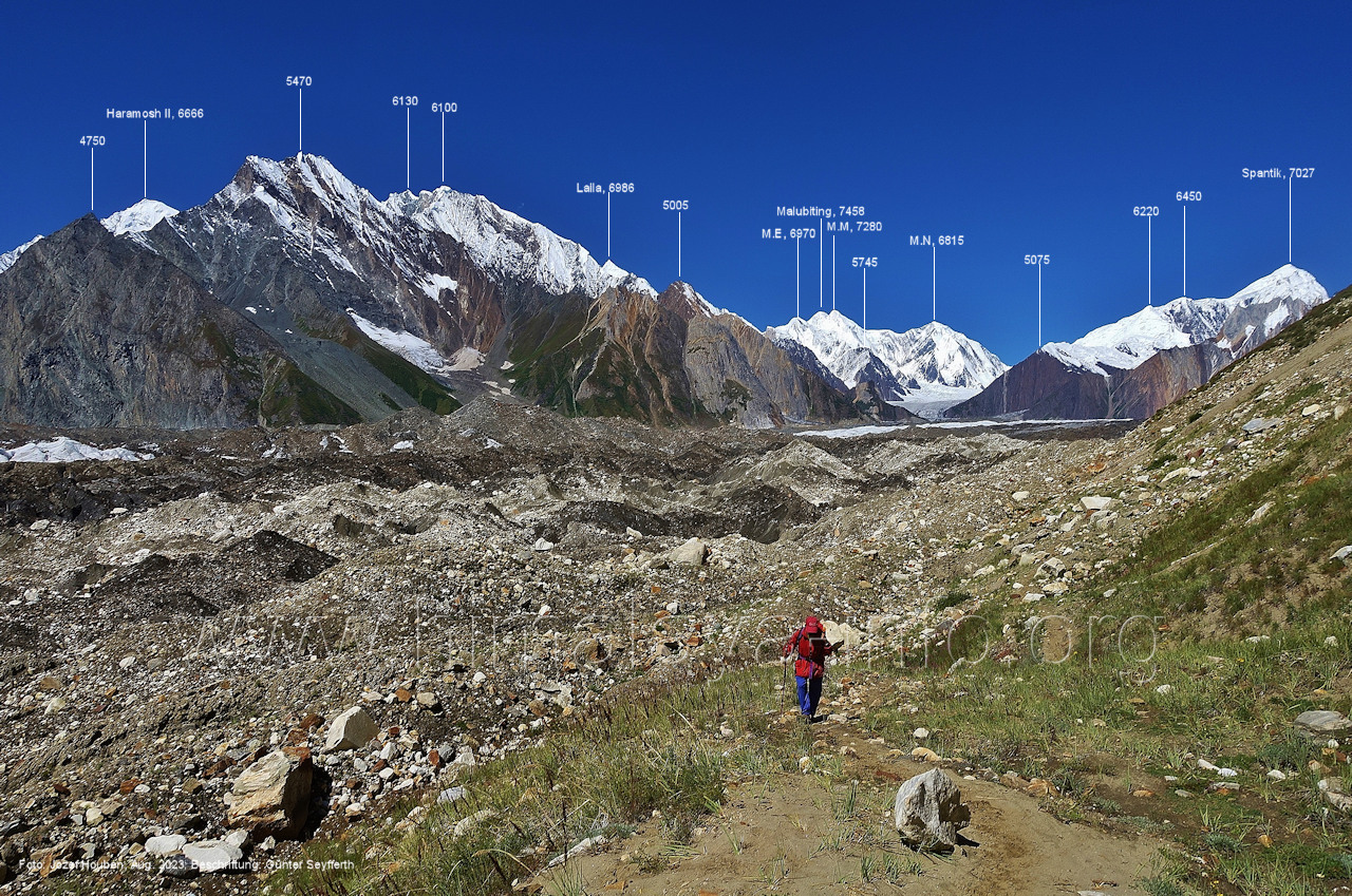 gefärbte Schmelzwasser in den Chogolungma-Gletscher ergießen. Foto: Jozef Houben, Aug. 2023; Beschriftung: Günter Seyfferth (33) Rückblick bei 75°11'56" nach Süd-Südosten Foto: Jozef Houben, Aug. 2023; Beschriftung: Günter Seyfferth (34) Blick bei 75°11'40 " nach West-Nordwesten mit Haramosh II (6666 m), Malubiting (7458 m) und Spantik (7026 m) Voraus hat man ab hier nun auch den Malubiting im Blick, den höchsten Gipfel der Chogolungma-Region. Foto: Jozef Houben, Aug. 2023; Beschriftung: Günter Seyfferth (35) Blick bei 75°11'38" (H = 3575 m) nach Süden