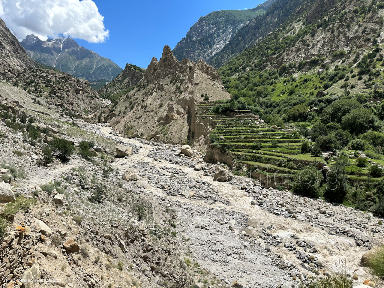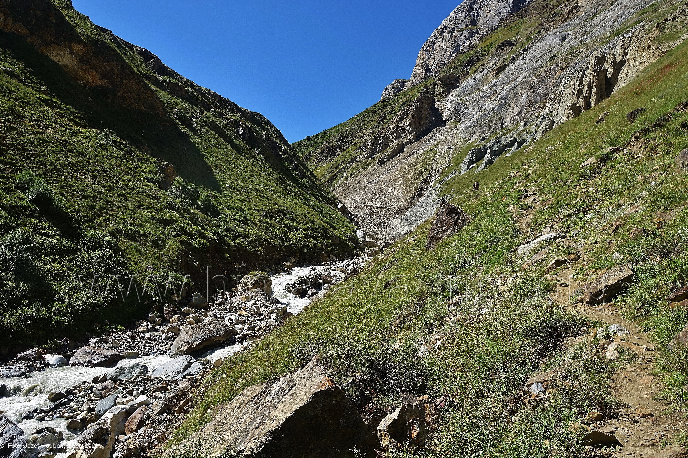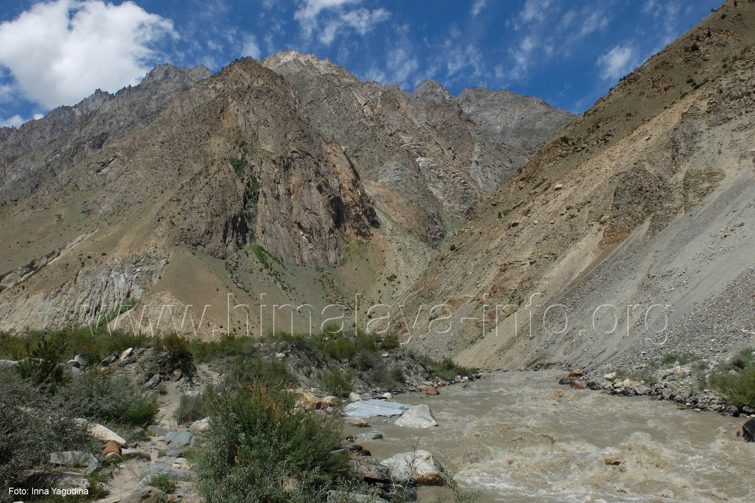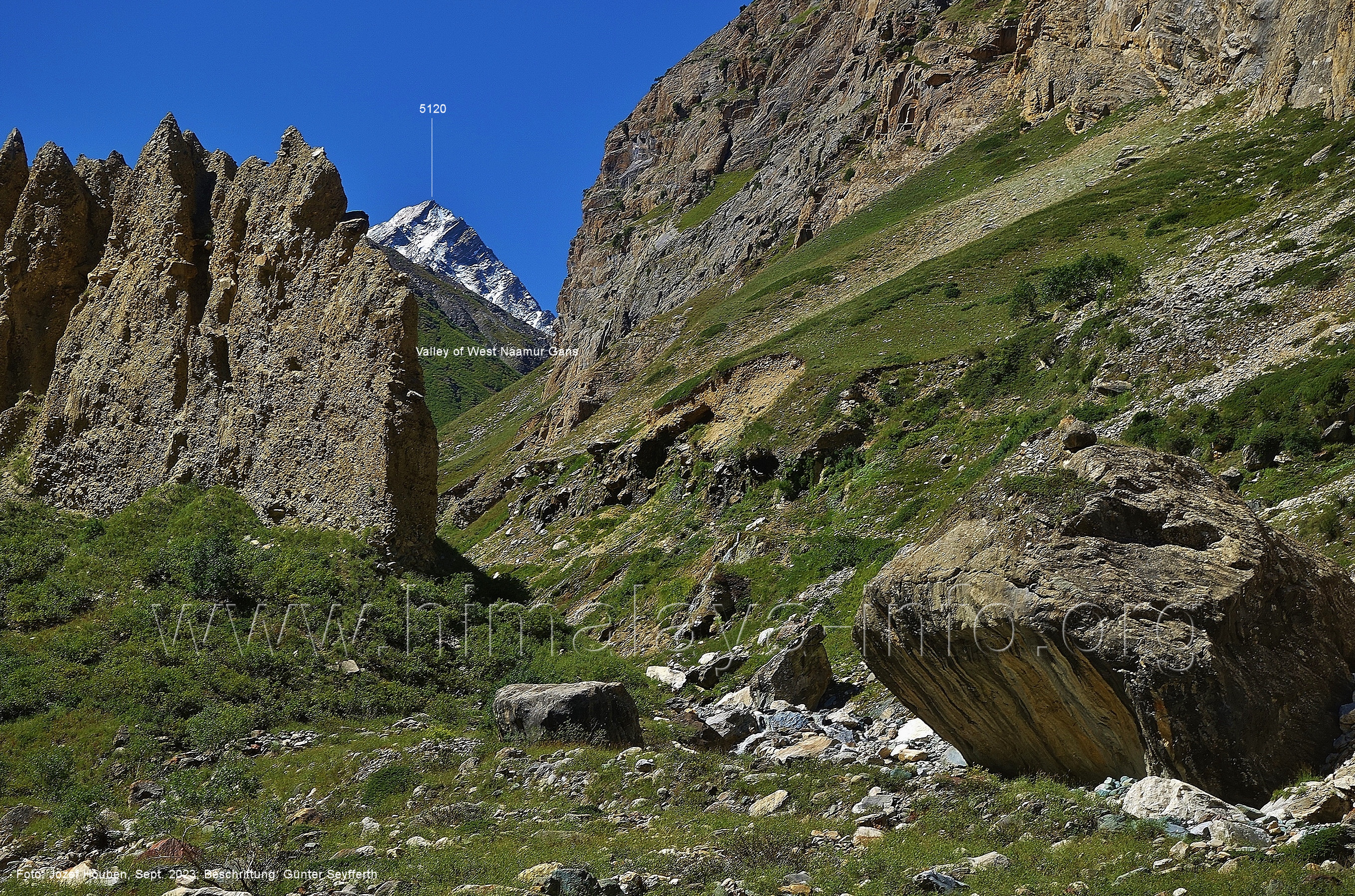 Perspektive nicht zu sehen und auch nicht die vielen anderen Gipfel Foto: Inna Yagudina, Aug. 2018; Beschriftung: Günter Seyfferth Vom Punkt des Richtungswechsels des Haupttals zeigen sich die Seitentäler Sencho und Naamur wie folgt: (16) Blick bei 75°14'30" (H = 3250) nach Südosten zu den Seitentälern des Sencho Nala und des Naamur Nala Foto: Jozef Houben, Aug. 2023; Beschriftung: Günter Seyfferth Nur wenig weiter talufwärts hat ein Bergbach eine