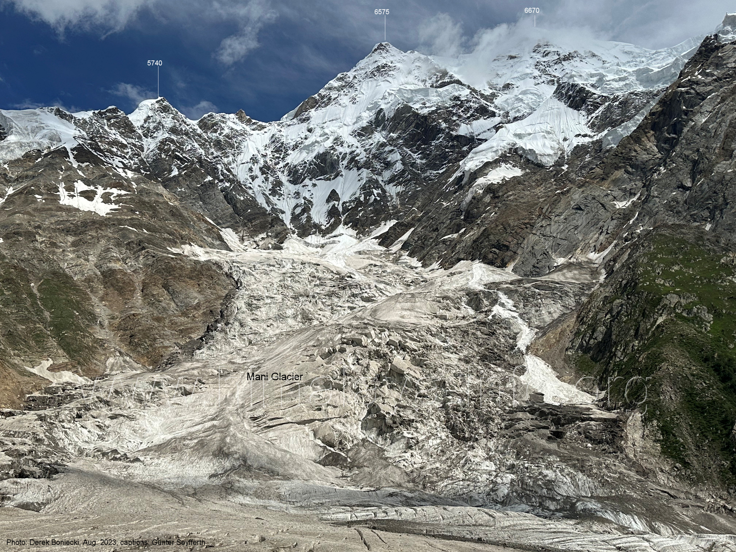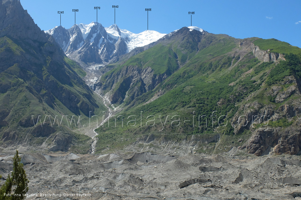 mehr von Geröll bedeckt und relativ eben ist. Foto: Jozef Houben, Aug. 2023; Beschriftung: Günter Seyfferth (44) Blick bei 75°09'08" nach Südosten Rechts sieht man den mittleren Gratausläufer des Kapaltang Kun. Foto: Jozef Houben, Aug. 2023; Beschriftung: Günter Seyfferth (45) Bick bei 75°08'30" (H = 3770 m) nach Westen mit Malubiting (7458 m) und Spantik (7027 m)