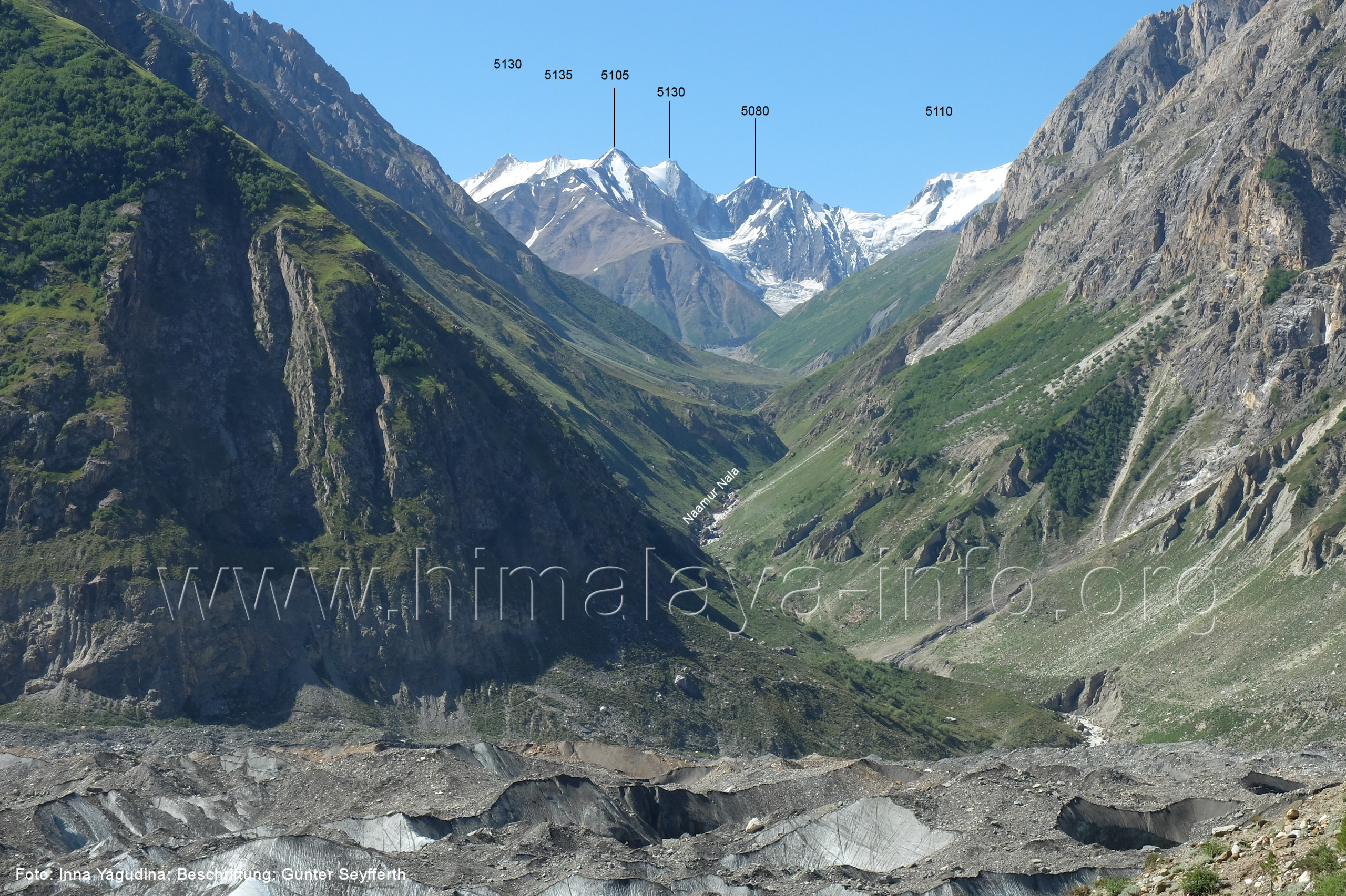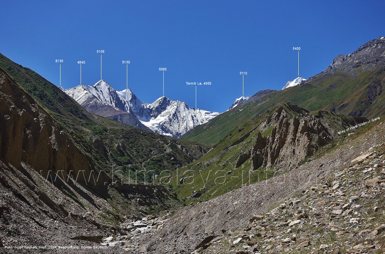 Stelle (230) Blick aus ca: 3670 m Höhe im Tal des Naamur Gans nach Süden Rechts des Peak 5080 liegt der Pass Tormik La (4950 m). Die unteren Hänge des Tals sind auch hier noch grün, obwohl die Fotos erst zum Ende des Sommers entstanden. (231) Blick aus ca. 3740 m Höhe im Tal des Naamur Gans nach Süd-Südosten Voraus sieht man die gemeinsme Zunge des mittleren und östlichen Naamur Gans. (232) Rückblick aus ca. 3740 m Höhe nach Norden zum Shingu Kuru (5990 m) Vor der Felswand in der linken Bildhälfte mündet der West Naamur Nala. (233) Vor dem Gletschertor des Naamur Gans in ca. 3850 m Höhe