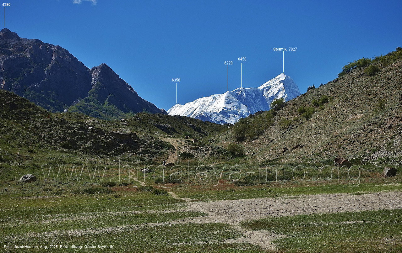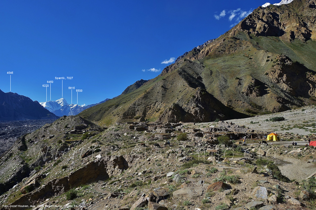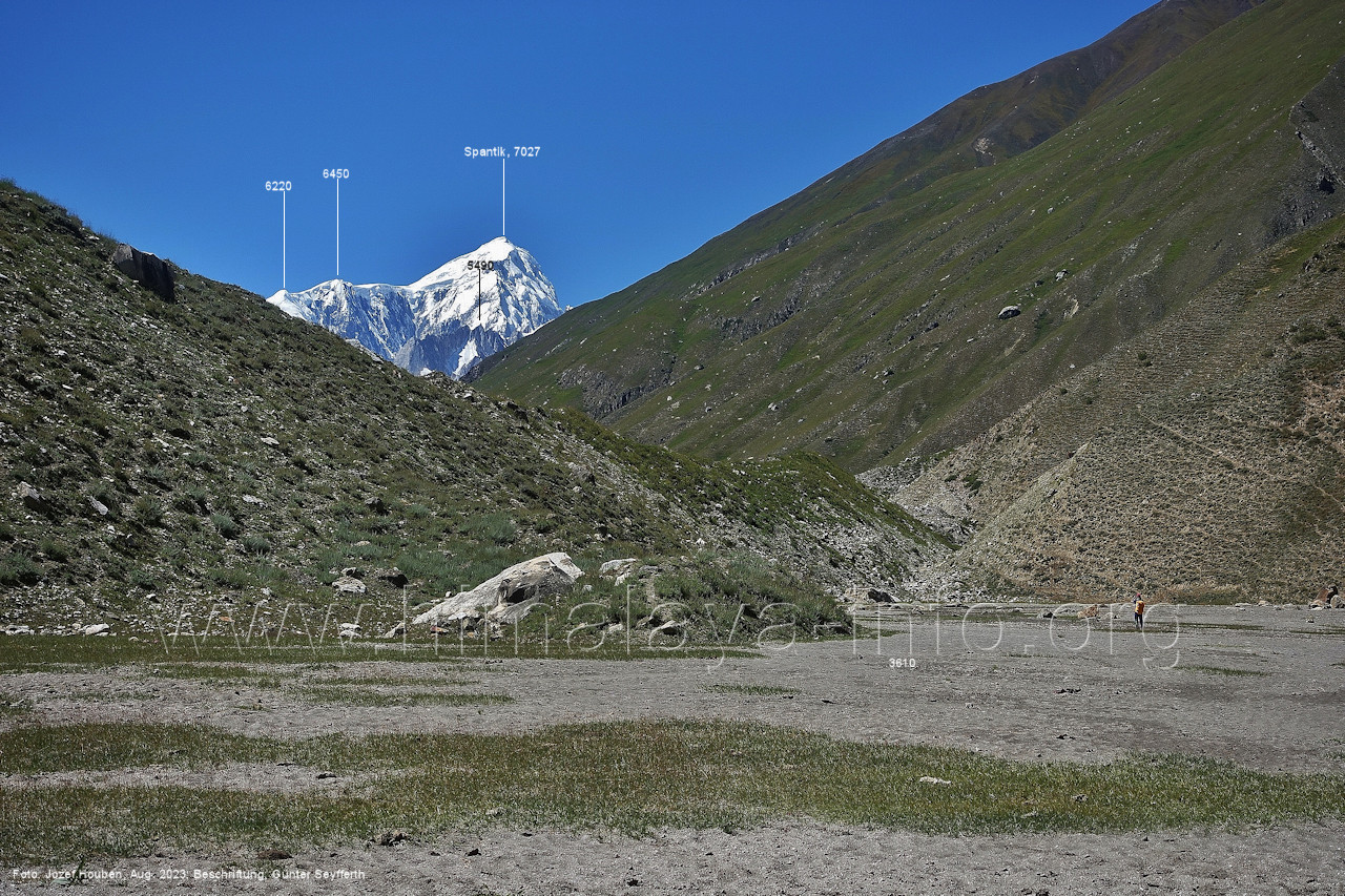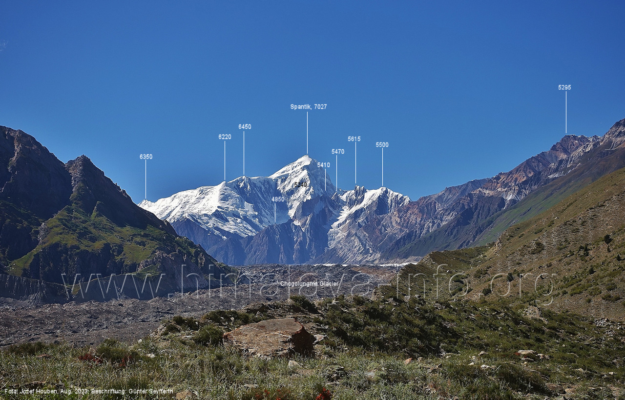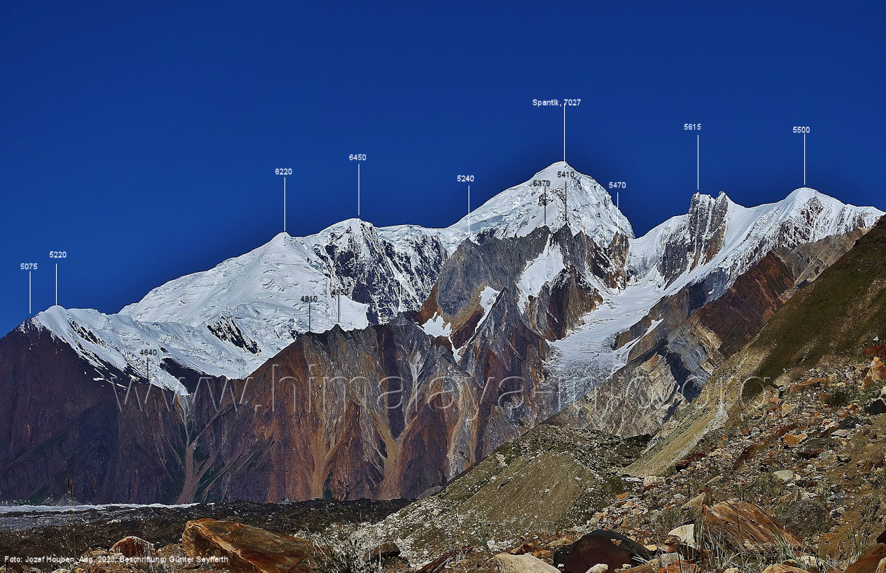 und kurzen Seitentäler Foto: Jozef Houben, Aug. 2023; Beschriftung: Günter Seyfferth Fast ständig hat man den Spantik so oder ähnlich vor Augen: (27) Blick bei 75°12'55" nach Nordwesten zum Spantik (7027 m) Foto: Jozef Houben, Aug. 2023; Beschriftung: Günter Seyfferth (28) Blick bei 75°12'53" nach West-Nordwesten zu Gipfeln des Kapaltang Kun-Massivs und zum Spantik (7027 m) Foto: Jozef Houben, Aug. 2023; Beschriftung: Günter Seyfferth Und wieder quert man eine Schwemmebene hinter der Moräne des Chogolungma-Gletchers: (29) Blick bei 75°12'30" (H = 3430 m) nach Nordwesten zum Spantik (7027 m) Foto: Jozef Houben, Aug. 2023; Beschriftung: Günter Seyfferth Die Rückblicke nach Südosten variieren nur wenig, sind aber immer überwältigend schön: (30) Rückblick bei 75°12'17" nach Südosten Foto: Jozef Houben, Aug. 2023; Beschriftung: Günter Seyfferth (31) Blick bei 75°12'09" nach Nordwesten zum Spantik (7027 m)