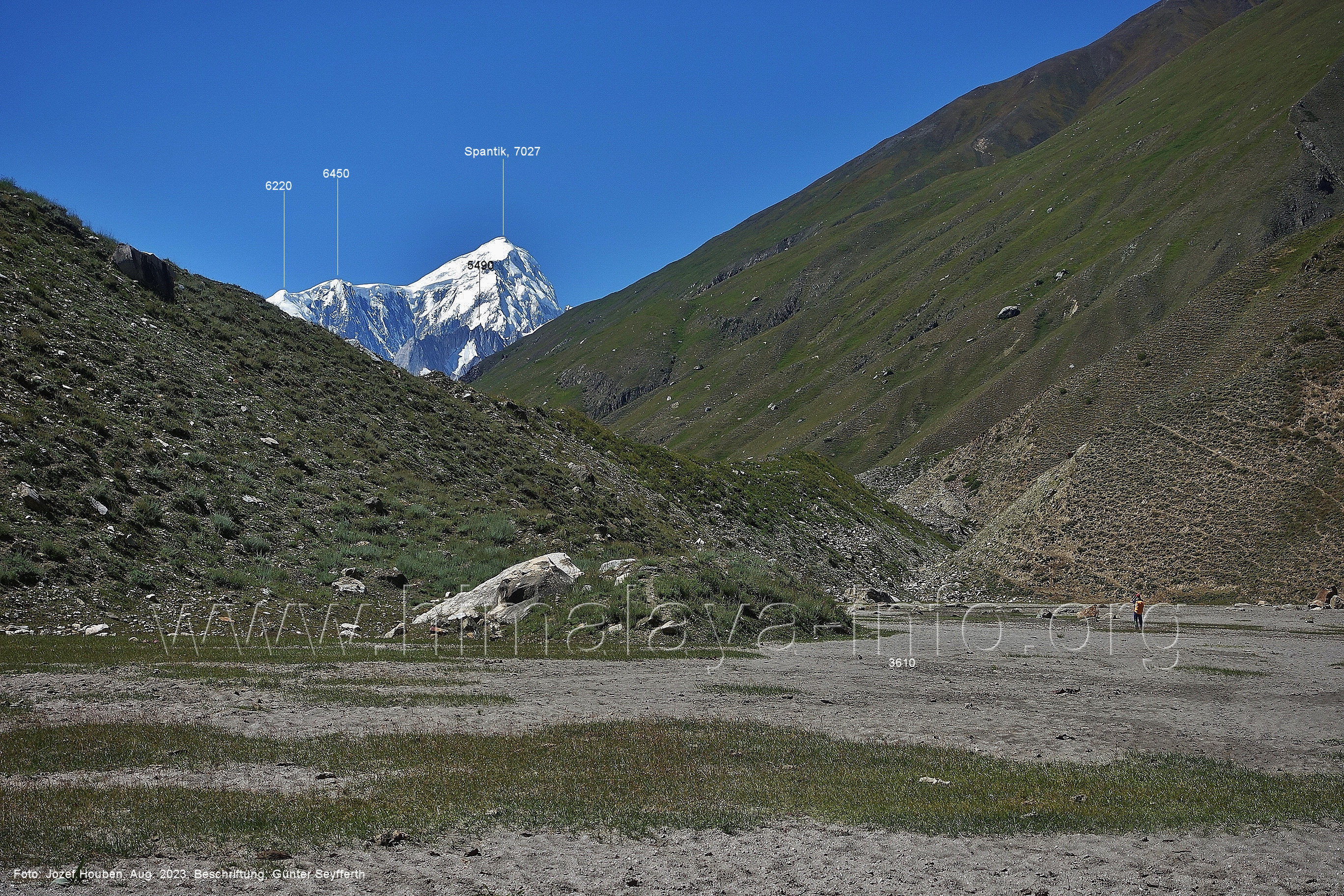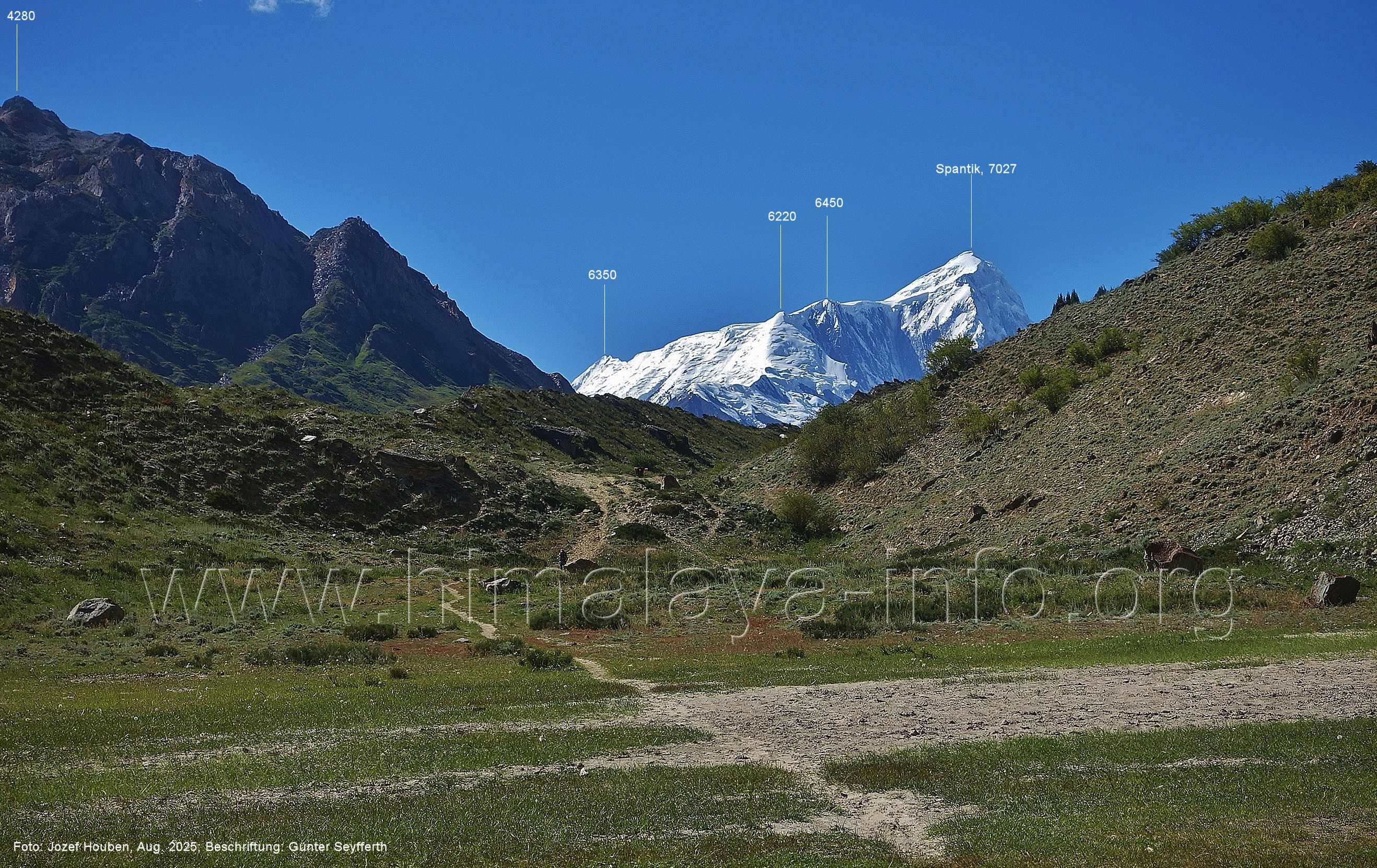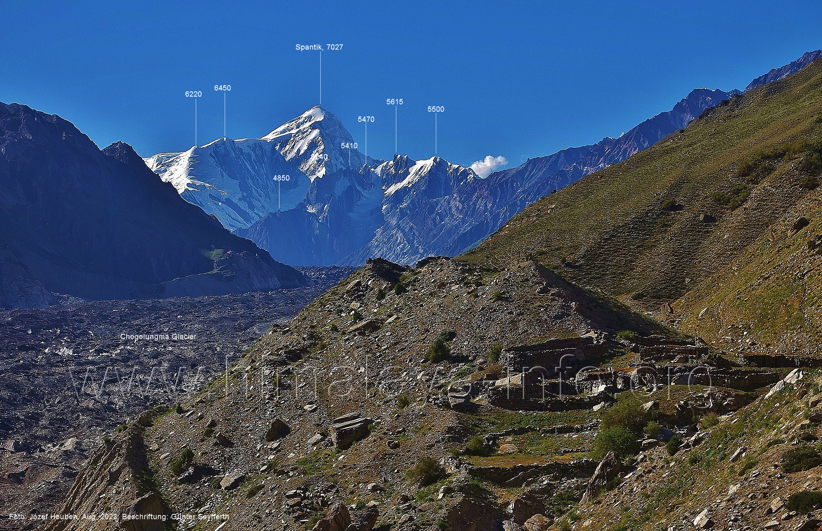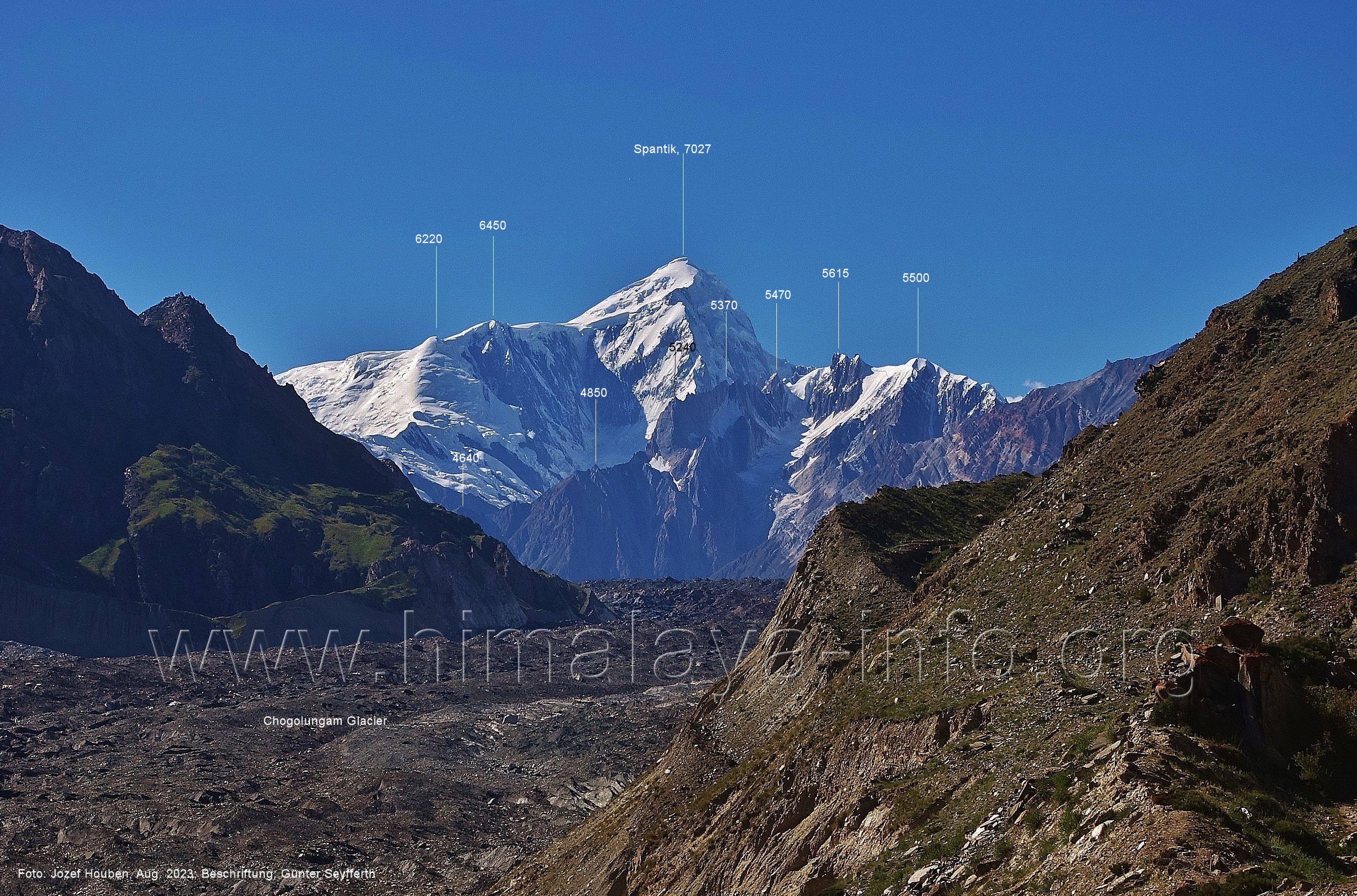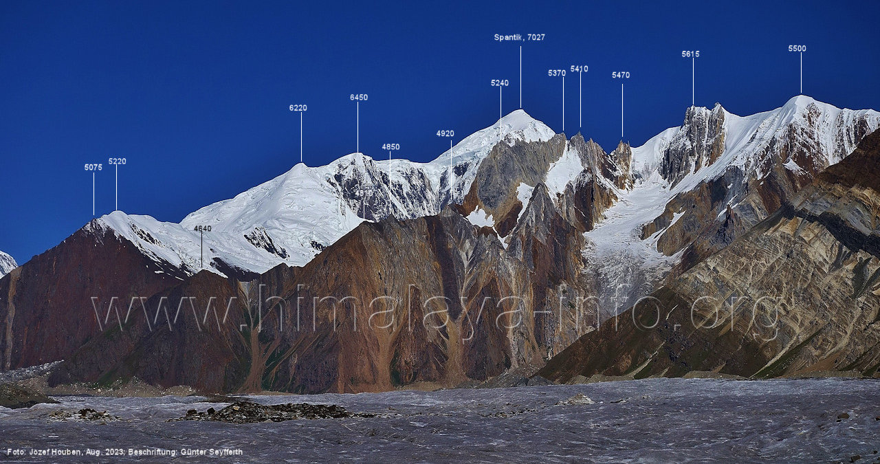 und kurzen Seitentäler Foto: Jozef Houben, Aug. 2023; Beschriftung: Günter Seyfferth Fast ständig hat man den Spantik so oder ähnlich vor Augen: (27) Blick bei 75°12'55" nach Nordwesten zum Spantik (7027 m) Foto: Jozef Houben, Aug. 2023; Beschriftung: Günter Seyfferth (28) Blick bei 75°12'53" nach West-Nordwesten zu Gipfeln des Kapaltang Kun-Massivs und zum Spantik (7027 m) Foto: Jozef Houben, Aug. 2023; Beschriftung: Günter Seyfferth Und wieder quert man eine Schwemmebene hinter der Moräne des Chogolungma-Gletchers: (29) Blick bei 75°12'30" (H = 3430 m) nach Nordwesten zum Spantik (7027 m) Foto: Jozef Houben, Aug. 2023; Beschriftung: Günter Seyfferth Die Rückblicke nach Südosten variieren nur wenig, sind aber immer überwältigend schön: (30) Rückblick bei 75°12'17" nach Südosten Foto: Jozef Houben, Aug. 2023; Beschriftung: Günter Seyfferth (31) Blick bei 75°12'09" nach Nordwesten zum Spantik (7027 m)