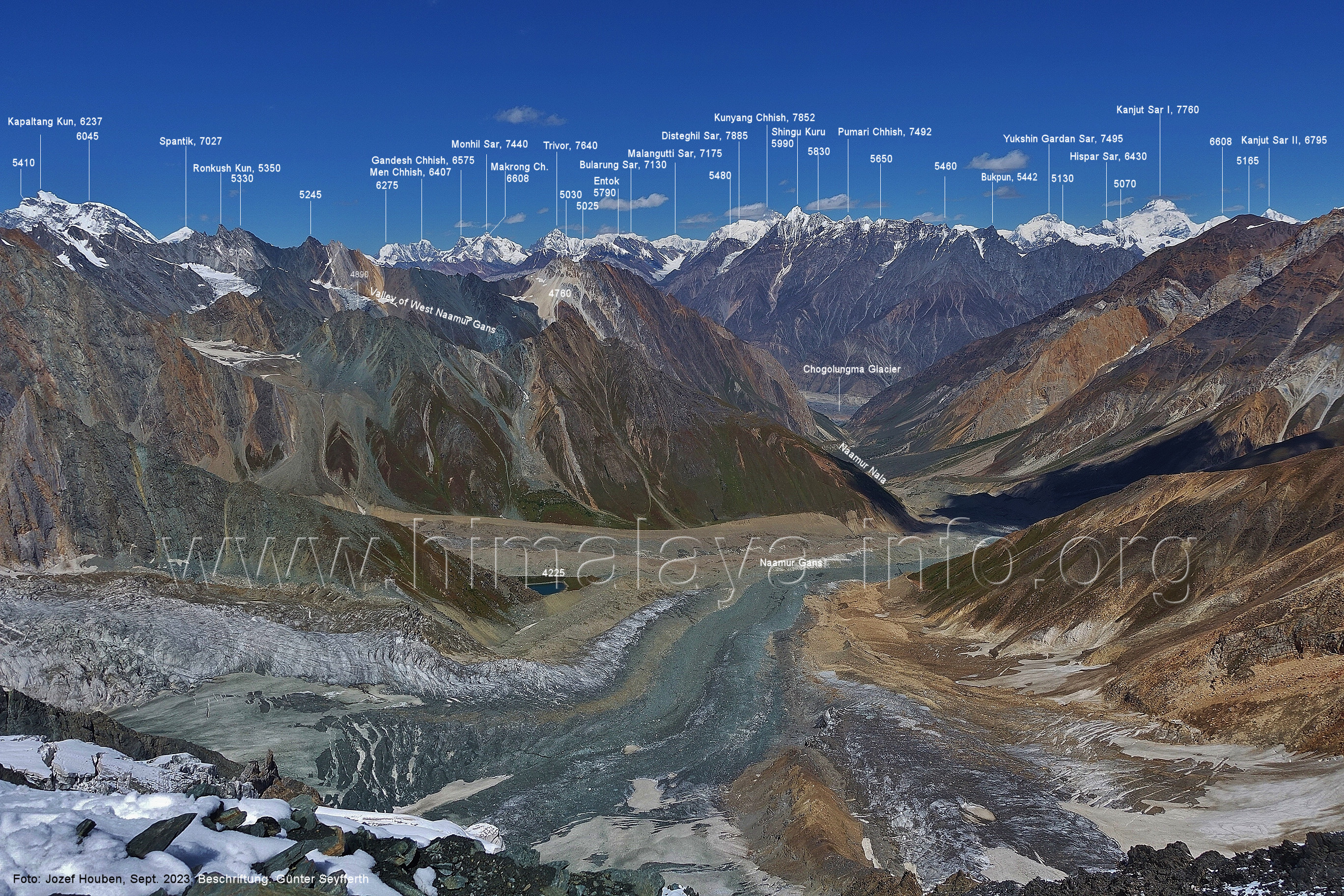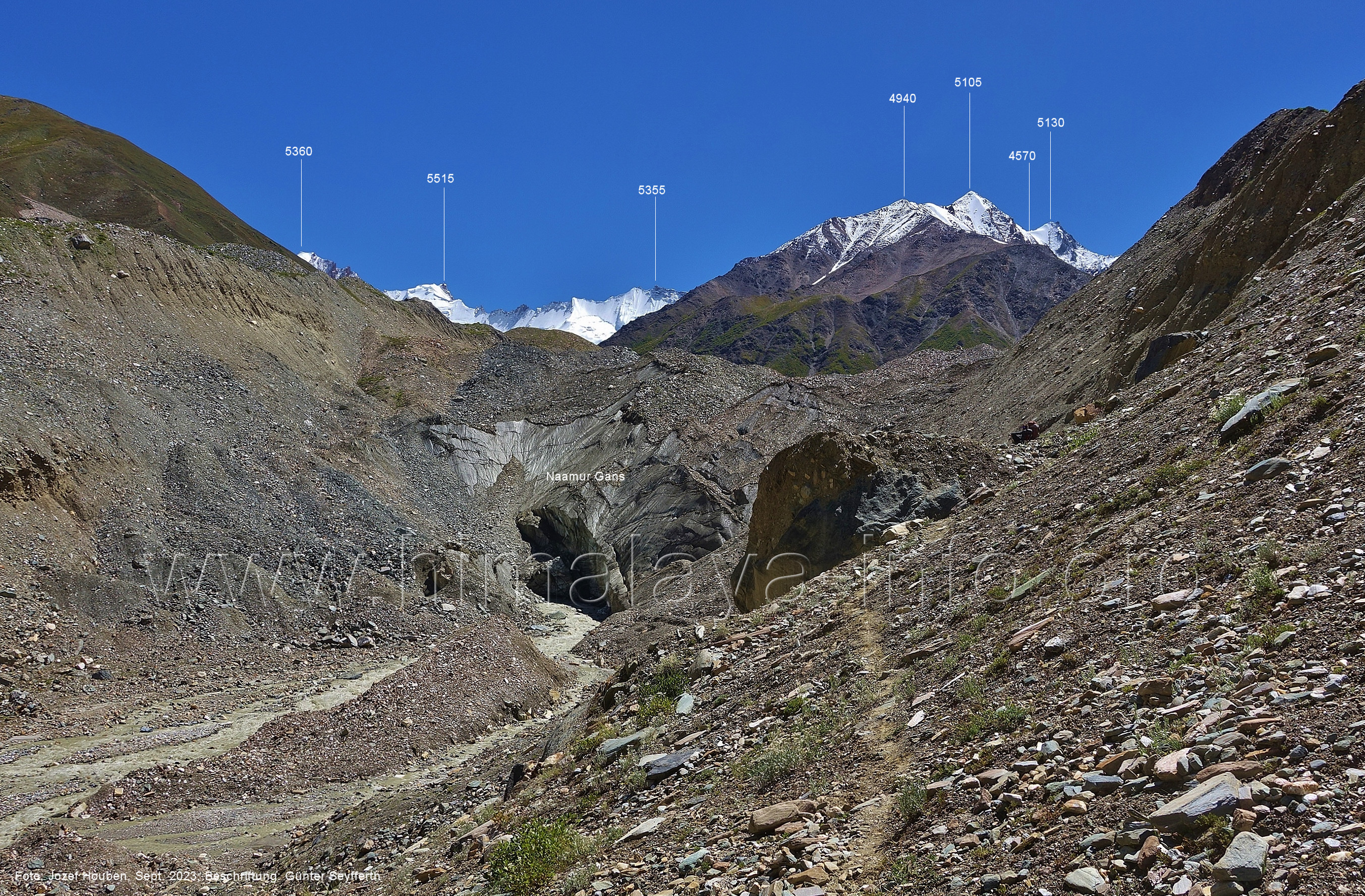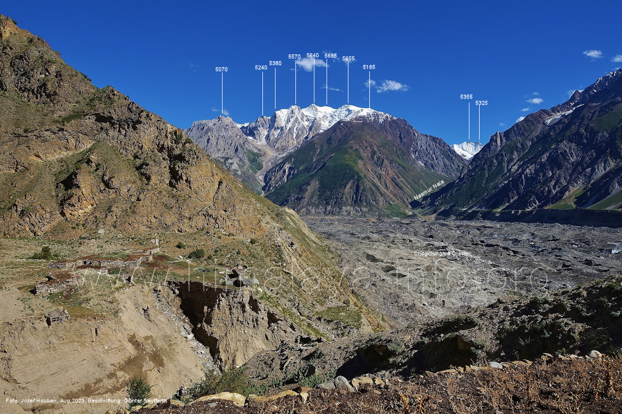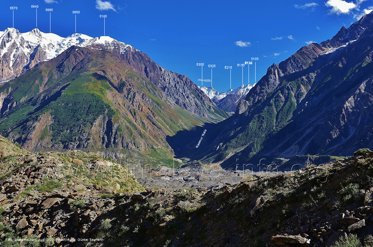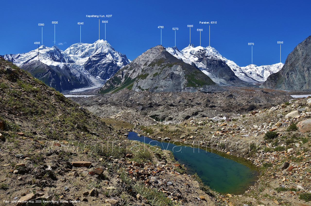Chogolungma.Gletschers. Foto: Jozef Houben, Aug. 2023; Beschriftung: Günter Seyfferth (18) Tele-Blick bei 75°14'00" nach Nordwesten zum Spantik (7027 m) Der Gletscher liegt hier ca. 50 m tiefer als der Trekking-Pfad. Foto: Jozef Houben, Aug. 2023; Beschriftung: Günter Seyfferth (19) Blick bei 75°14'00" nach Süden zu den Bergen zwischen den Seitentälern Naamur und Remanedok Kushun Foto: Derek Boniecki, Juli 2023; Beschriftung: Günter Seyfferth (20) Rückblick bei 75°13'55" nach Südosten zu den Gipfeln am Ostrand des Naamur-Tals Man blickt auf die Schwemmebene, von der die Bilder Nr. 17 bis 19 aufgenommen wurden. Foto: Jozef Houben, Aug. 2023; Beschriftung: Günter Seyfferth (21) Blick bei 75°13'55" nach Südosten ins Tal des Naamur Nala Foto: Jozef Houben, Aug. 2023; Beschriftung: Günter Seyfferth (22) Tele-Blick bei 75°13'55" nach Südosten zu Gipfeln am südöstlichen Rand des Naamur Gans-Gletschers Foto: Jozef Houben, Aug. 2023; Beschriftung: Günter Seyfferth (23) Blick bei 75°13'35" nach Westen zu Gipfeln des Massivs des Kapaltang Kun (6237 m) und zum Spantik (7027 m)