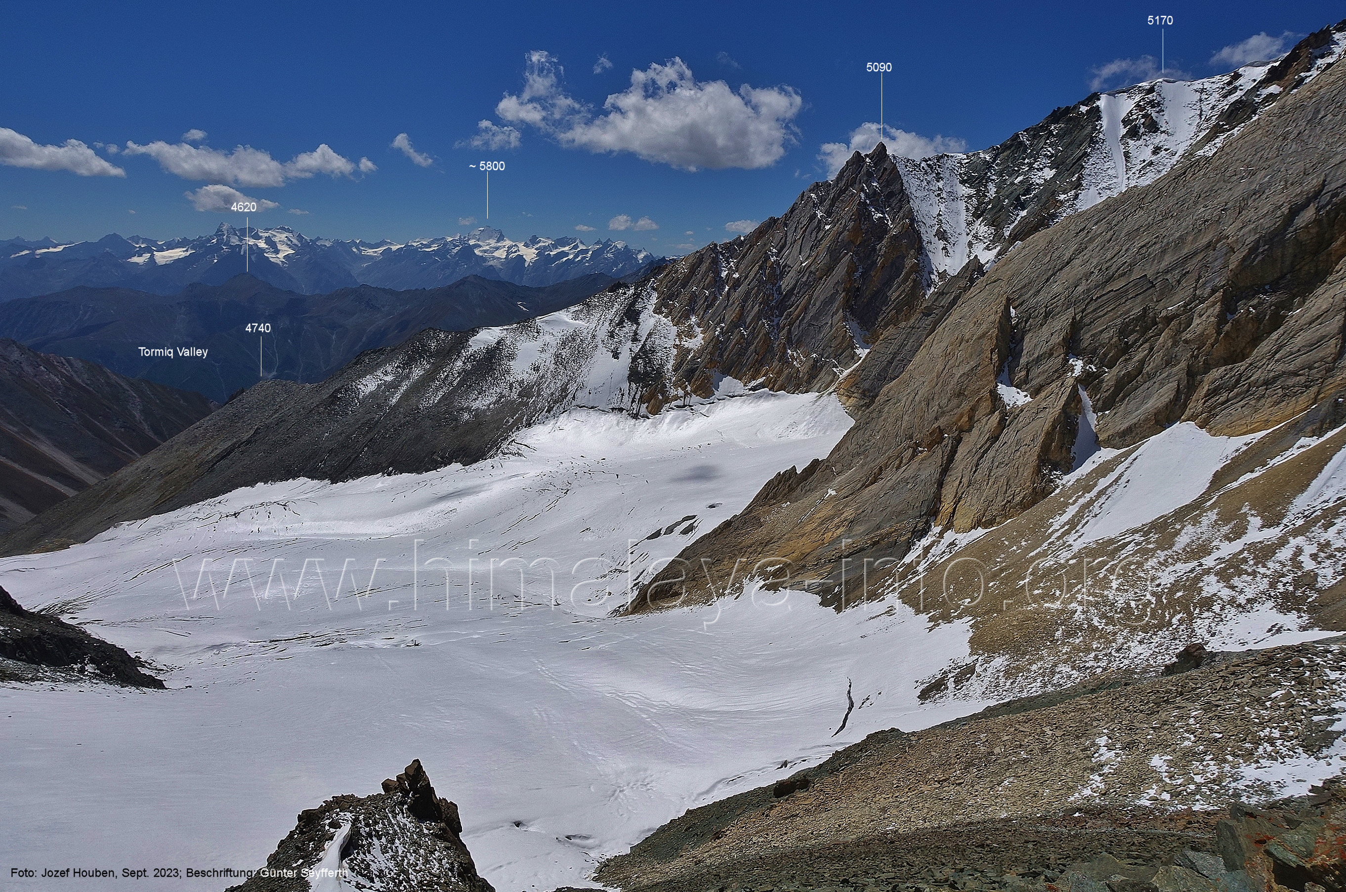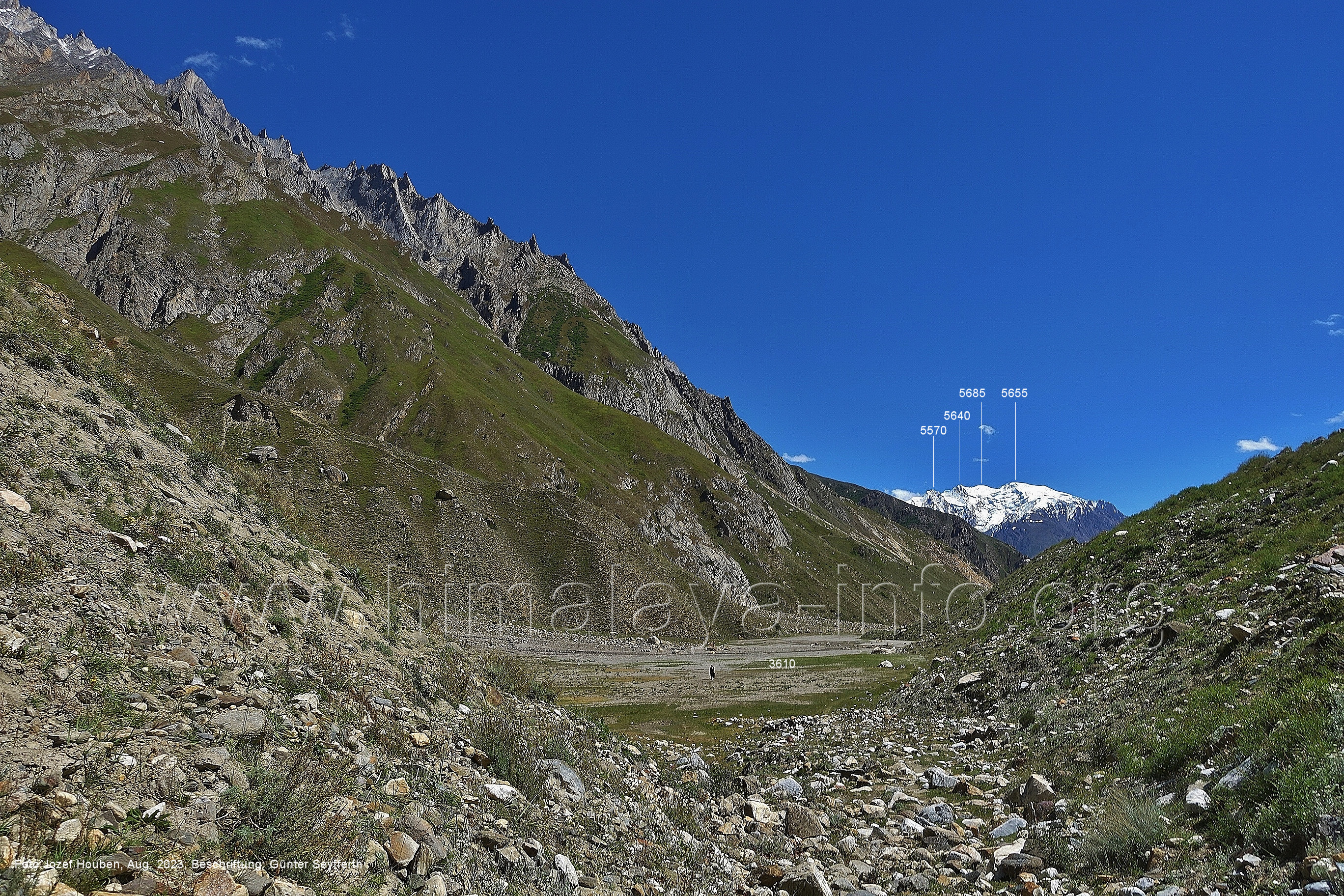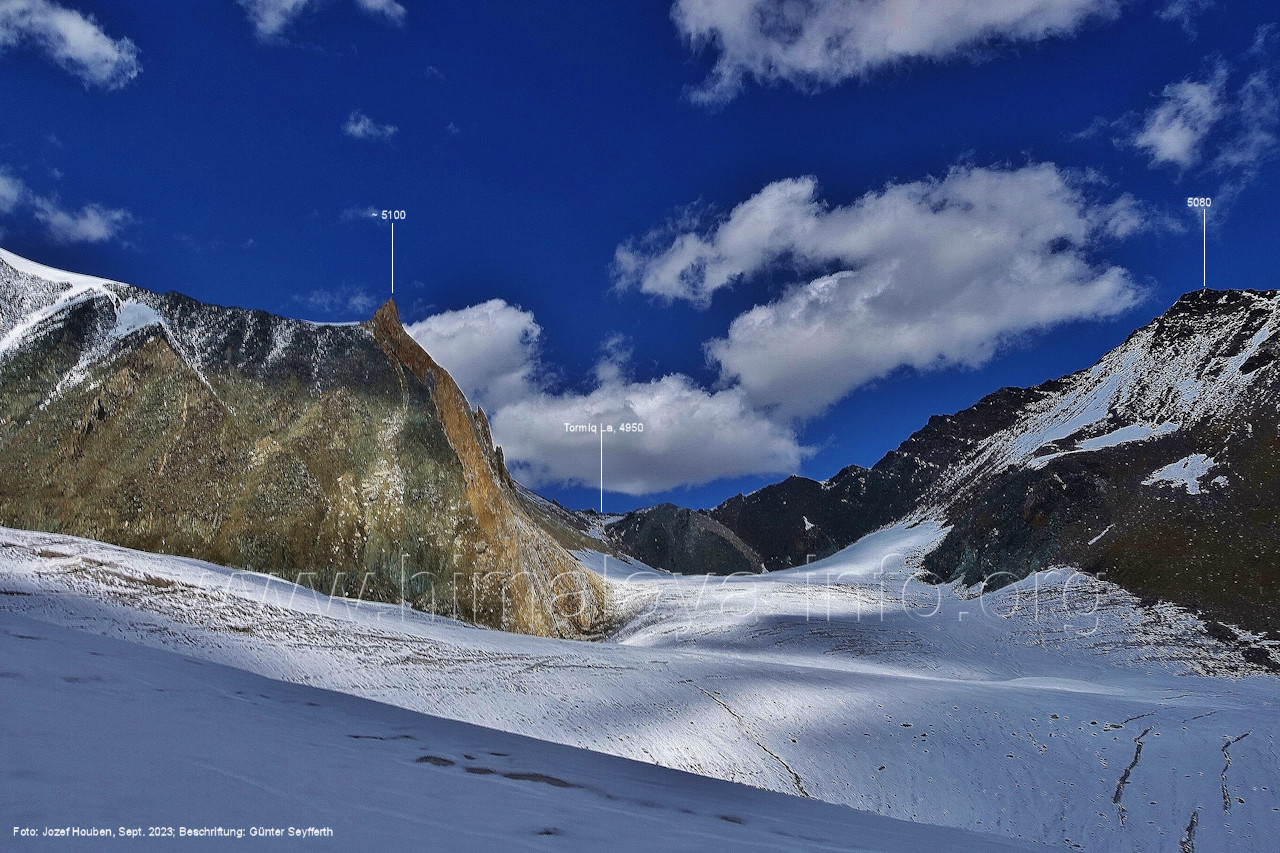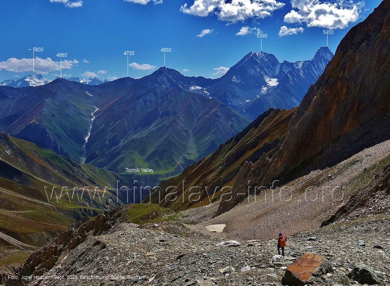 (70) Rückblick bei 75°05'40" in ca. 3930 m Höhe nach Osten Foto: Jozef Houben, Aug. 2023; Beschriftung: Günter Seyfferth (71) Blick bei 75°05'20" nach Süden mit Kapaltang Kun (6237 m) und Peak 5470
