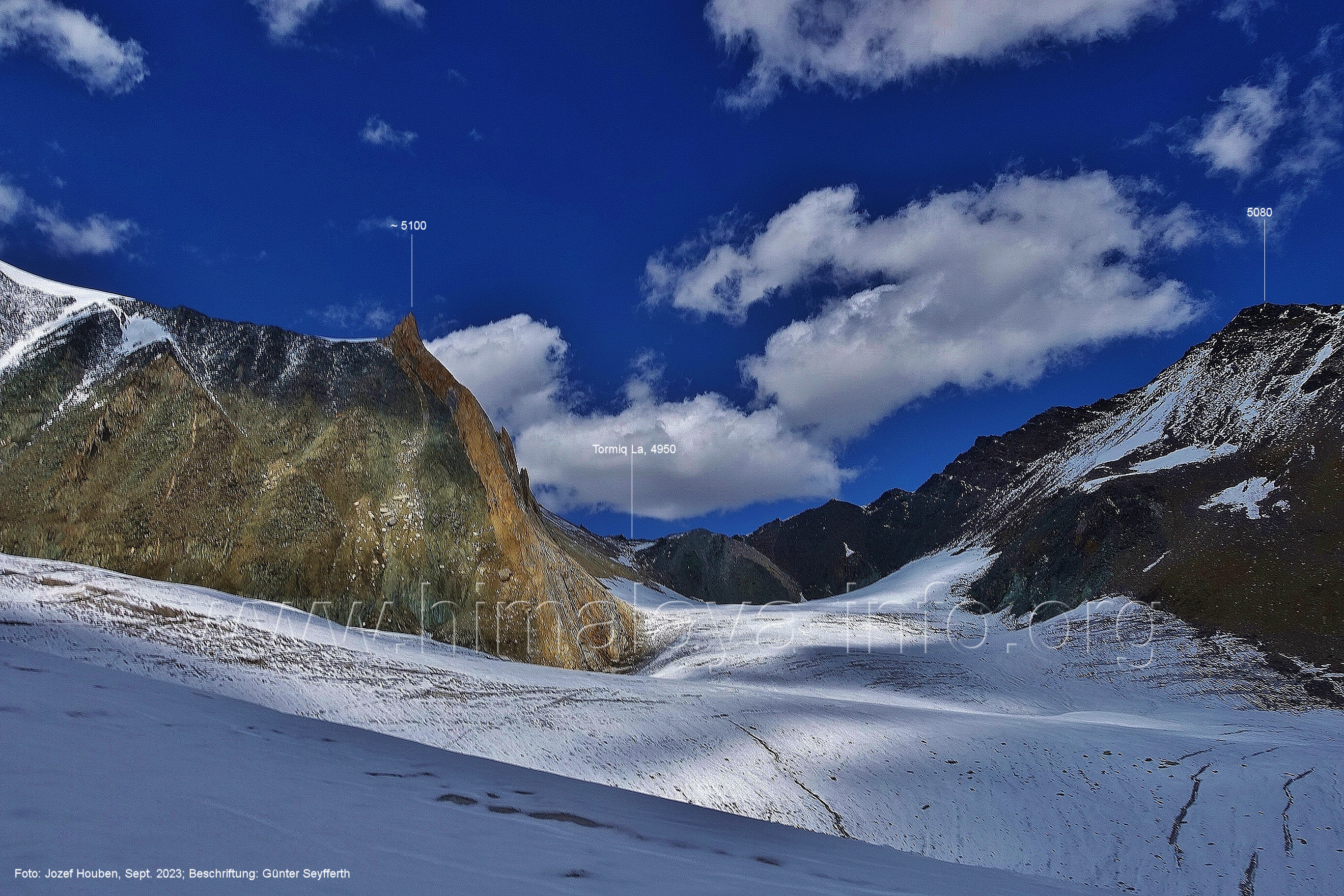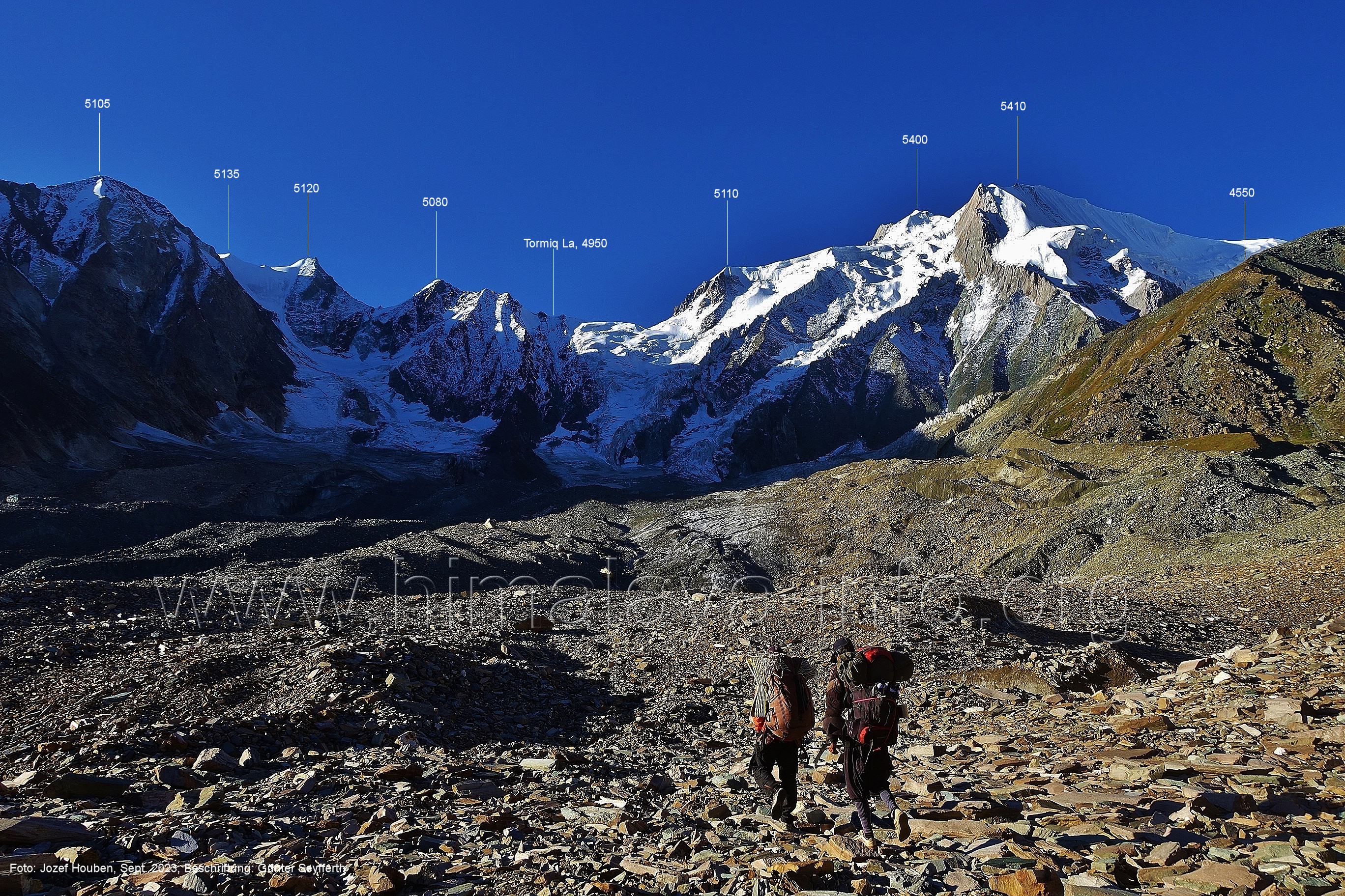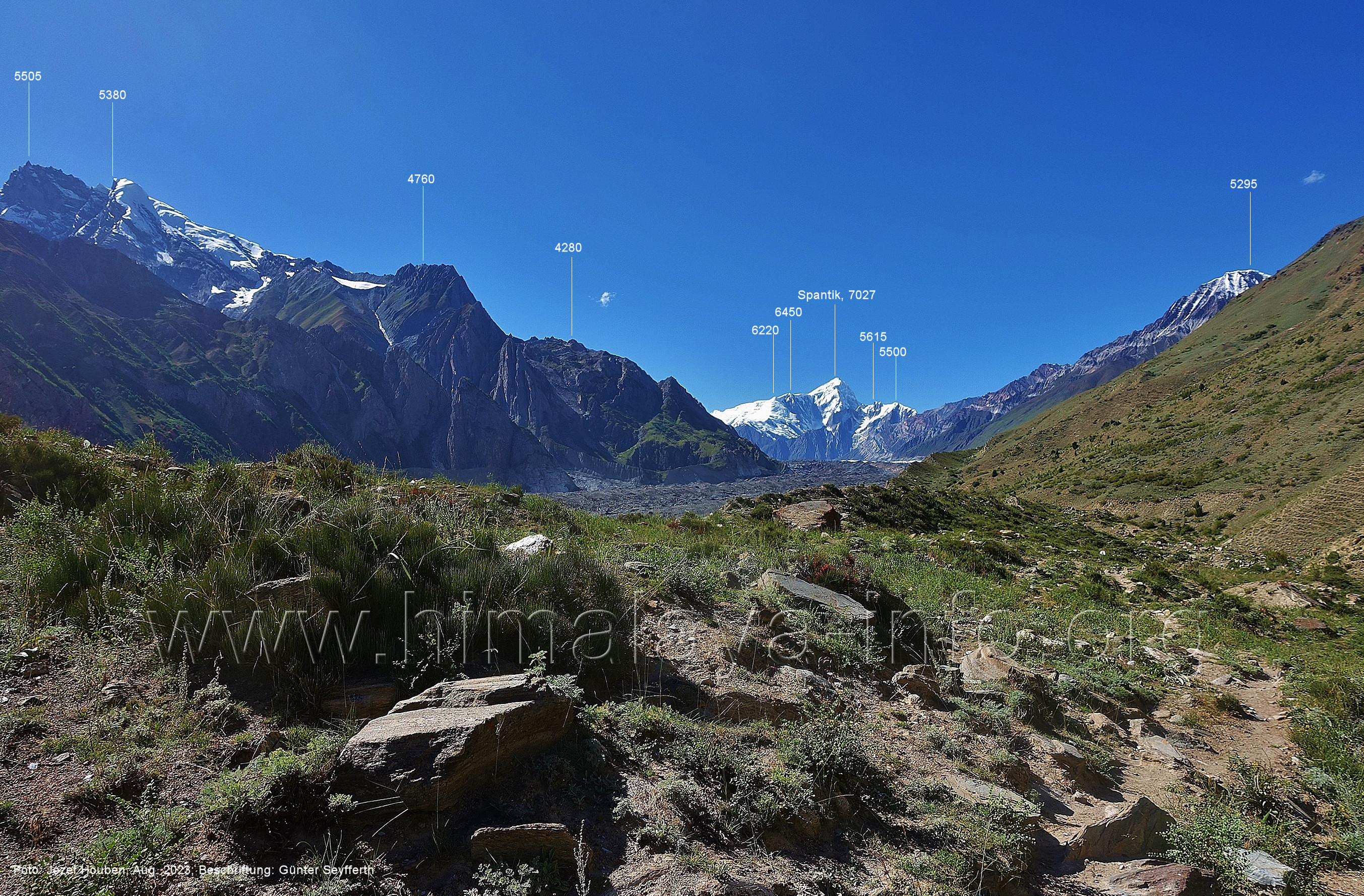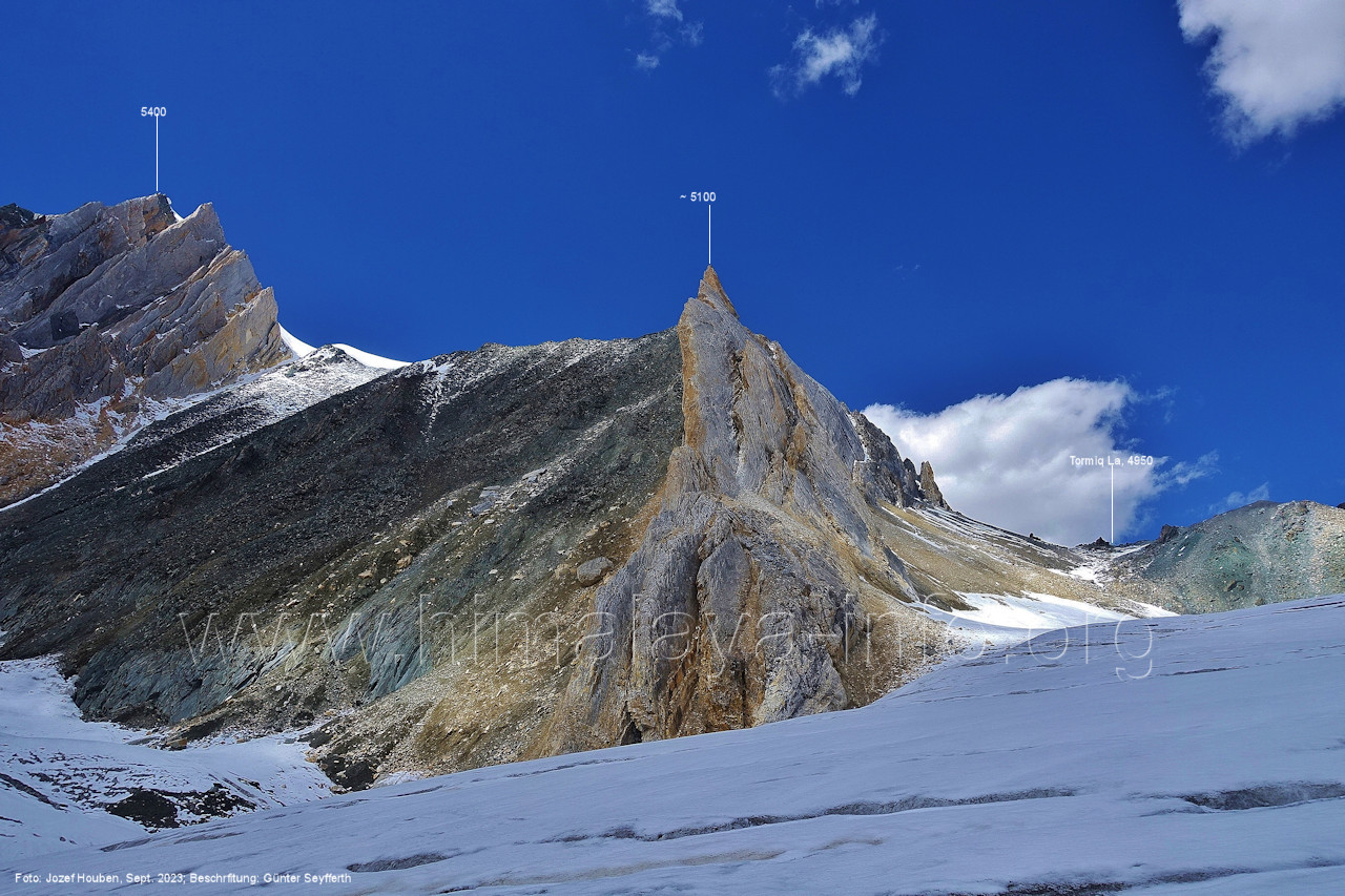 (70) Rückblick bei 75°05'40" in ca. 3930 m Höhe nach Osten Foto: Jozef Houben, Aug. 2023; Beschriftung: Günter Seyfferth (71) Blick bei 75°05'20" nach Süden mit Kapaltang Kun (6237 m) und Peak 5470